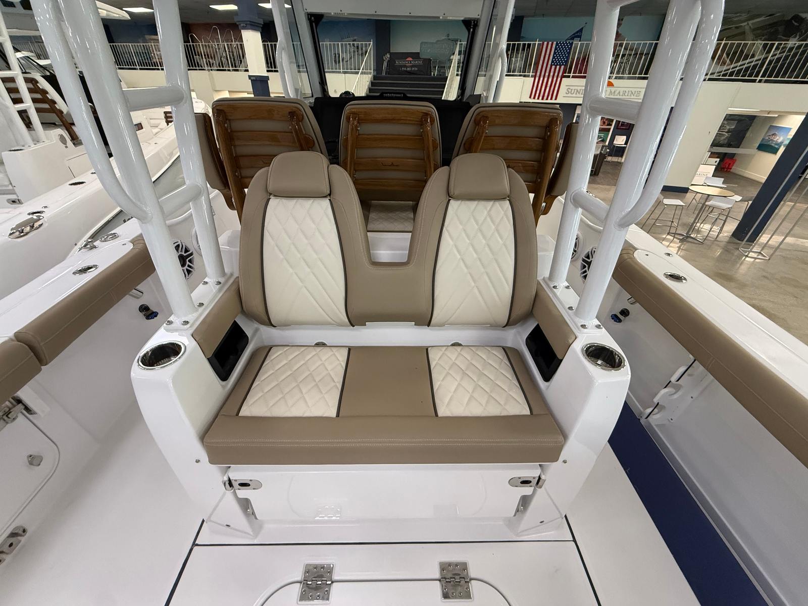 This Everglades 335 CC is loaded with special features designed to enhance your time on the water. The hull color gel in white, paired with the full hull color package, creates a visually stunning profile that turns heads at every marina. The upholstery, finished in a luxurious coconut tan accent, offers both style and comfort, inviting you and your guests to relax in plush seating throughout the boat. The canvas package, including a Mediterranean bow shade in tan, provides essential protection from the sun, allowing you to enjoy long days on the water in comfort. For anglers, the 18-foot collapsible outriggers are a game-changer, expanding your fishing capabilities and making this center console boat for sale an ideal choice for serious offshore fishing expeditions.