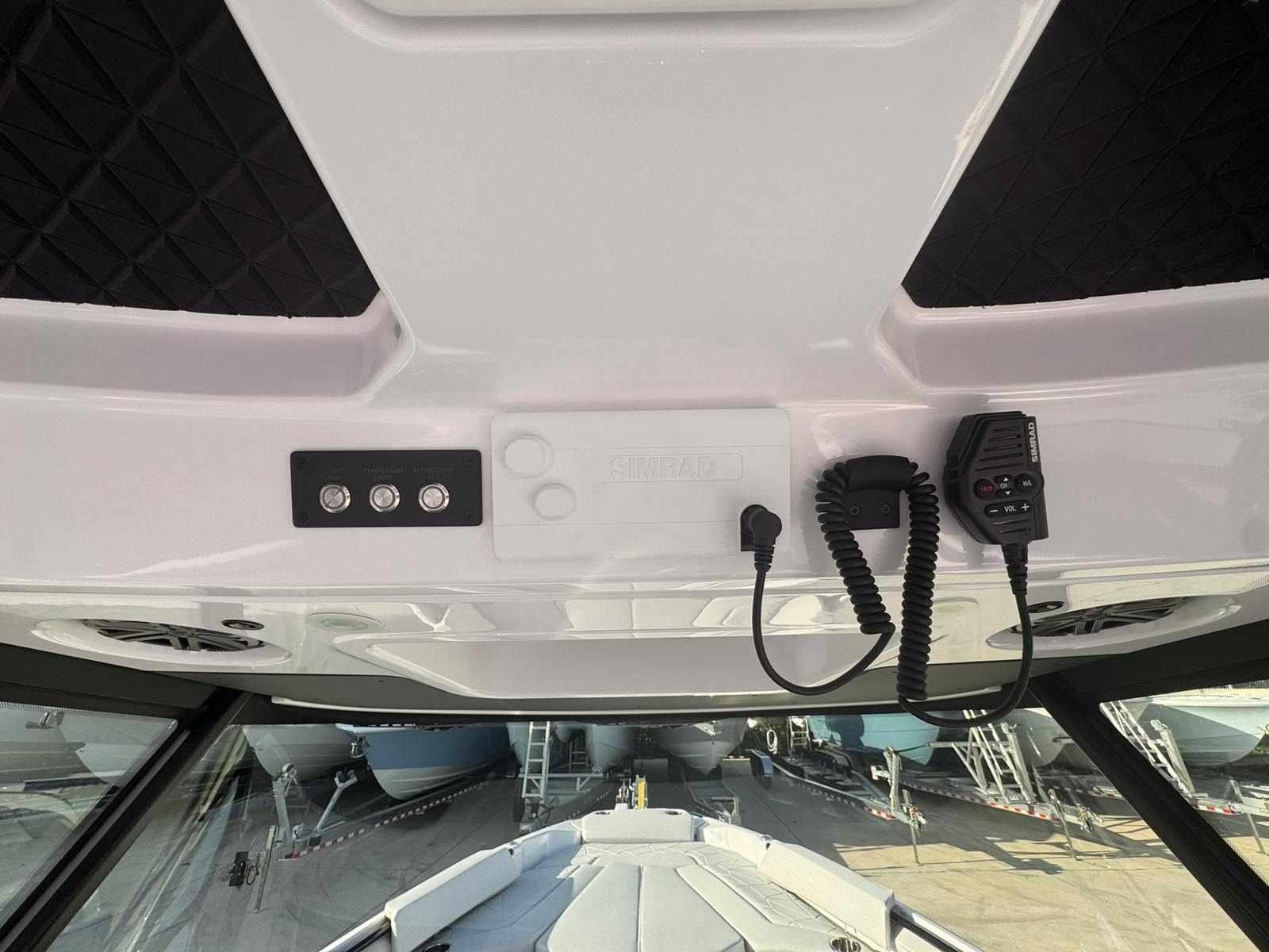 The Axopar 29 CCX is loaded with premium features that elevate your time on the water. The Chalk cushion set includes plush cushions for the bow U-sofa, foldable aft leaning post, fore deck sunbed, bow table, and bow L-sofa, ensuring every seating area is comfortable and inviting. The onboard fittings feature a bow sunshade for relaxing in the shade, a waterski frame in the BRABUS line’s signature black finish for thrilling water sports, and a Burnewiin gunwale accessory mount with gas bottle storage for added convenience. The fishing targa arch, also in the BRABUS line’s black, adds a sporty touch and enhances your fishing setup. The innovative gyro pedestal provides stability and ease of movement, making every outing smooth and enjoyable.