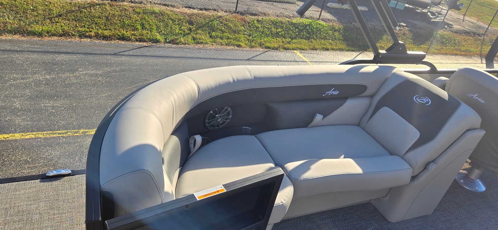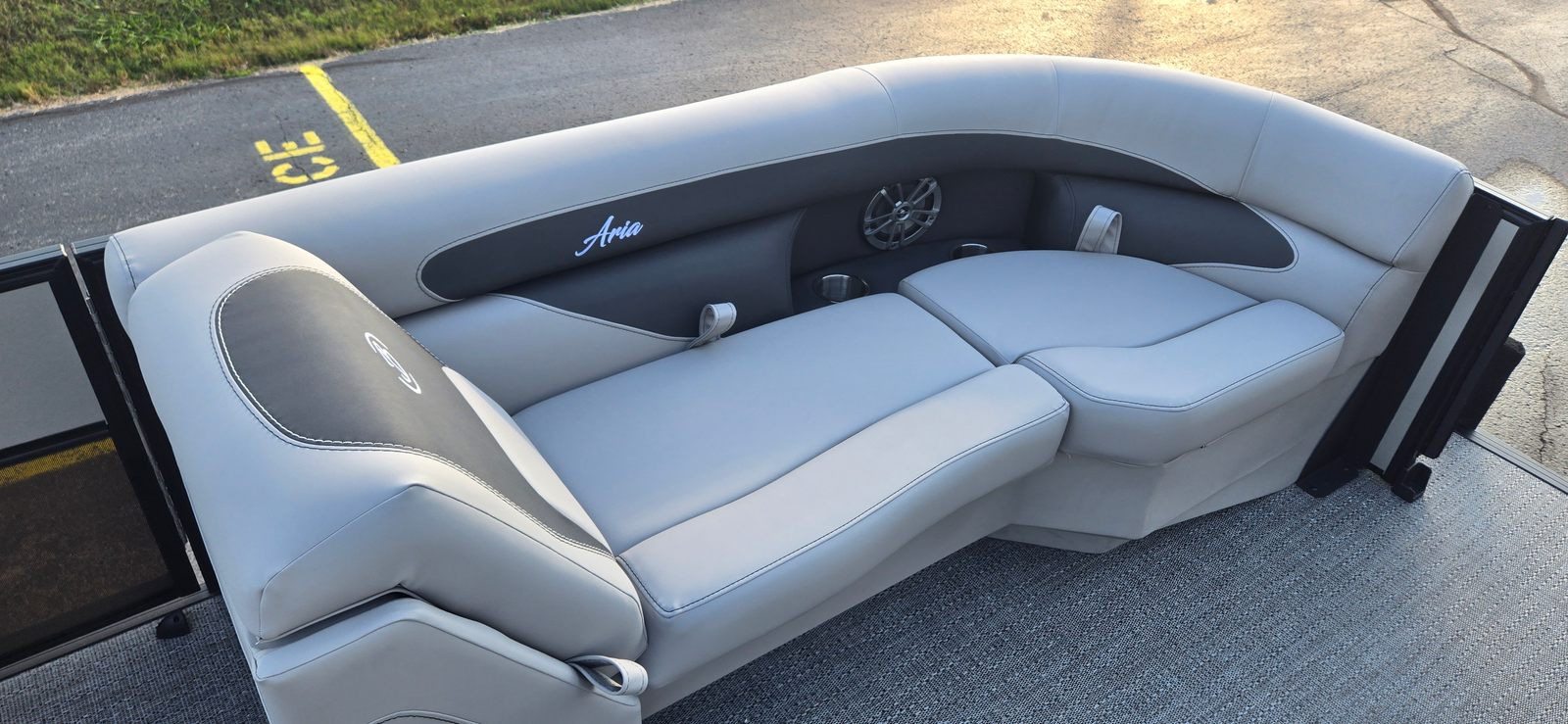 The Barletta Aria A22QC-Platinum is loaded with premium features that elevate your boating experience. The striking Railskin color in Champagne, paired with the Black Diamond accent and the Blackout Package Aria, creates a modern and sophisticated exterior that stands out from the crowd. Inside, the Tempest Gray furniture offers plush comfort and durability, while the Amore Gray flooring adds a touch of elegance and is easy to maintain. The Triple Toon Package Aria enhances stability and buoyancy, providing a smooth and secure ride even when the boat is fully loaded with family and friends. The exterior is further adorned with a stainless steel flag pole and an American flag, adding a patriotic flair to your on-the-water adventures.