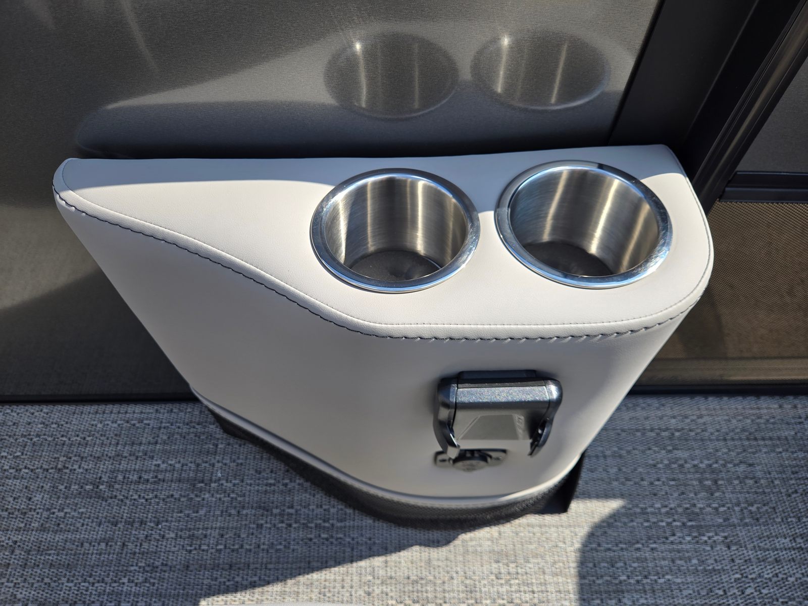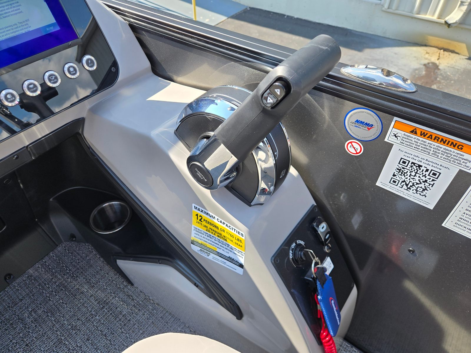 Step aboard the Barletta Aria A22QC-Platinum and discover a host of premium features designed to enhance your boating experience. The flooring is finished in Amore Gray, providing a stylish and comfortable surface that’s easy to maintain. The furniture, upholstered in Tempest Gray, offers plush seating and ergonomic support, ensuring every passenger enjoys maximum comfort throughout the day. The Triple Toon Package Aria adds stability and buoyancy, delivering a smooth and secure ride even in choppy waters.The railskin packages feature the Blackout Package Aria, complemented by the elegant Gray Moonstone railskin color, giving the boat a sophisticated and modern appearance. Navigation is made simple and intuitive with the Simrad 7" G07 XSE, a state-of-the-art display that provides real-time data and easy access to essential controls. Adding a touch of patriotism and style, the stainless steel flag pole with an American flag is a distinctive feature that sets this pontoon apart.