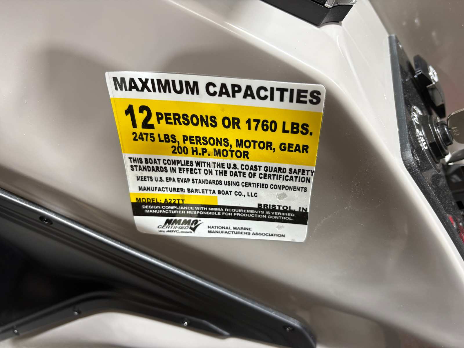 The 2026 Barletta Aria A22QC is loaded with features designed to enhance your boating experience. The Railskin Color Aria in Champagne gives the exterior a sophisticated and timeless look, while the Blackout Package Aria adds a modern, sleek touch that is sure to turn heads wherever you go. Inside, the Tempest Gray furniture provides a comfortable and stylish setting for you and your guests, perfectly complemented by the Amore Gray flooring that is both durable and easy to maintain.One of the standout features of this pontoon is the Triple Toon Package Aria, which enhances stability and performance, especially when navigating choppy waters or carrying a full crew. The in-floor midship storage, available with the Triple Toon configuration, offers convenient space for stowing gear, water toys, and other essentials, keeping the deck clutter-free and organized. The exterior is further enhanced by a stainless steel flag pole with an American flag, adding a patriotic flair and a touch of elegance to your boat.