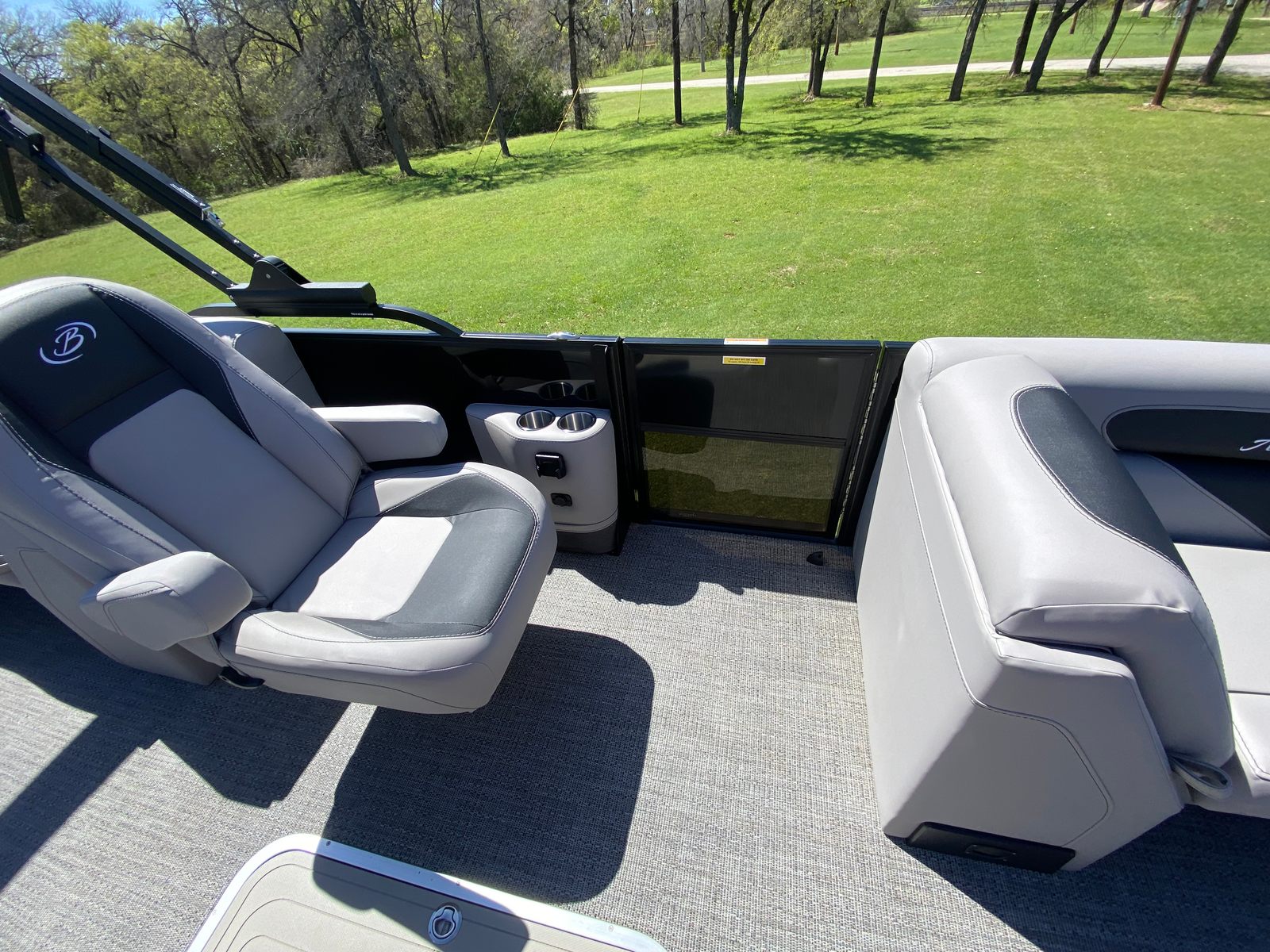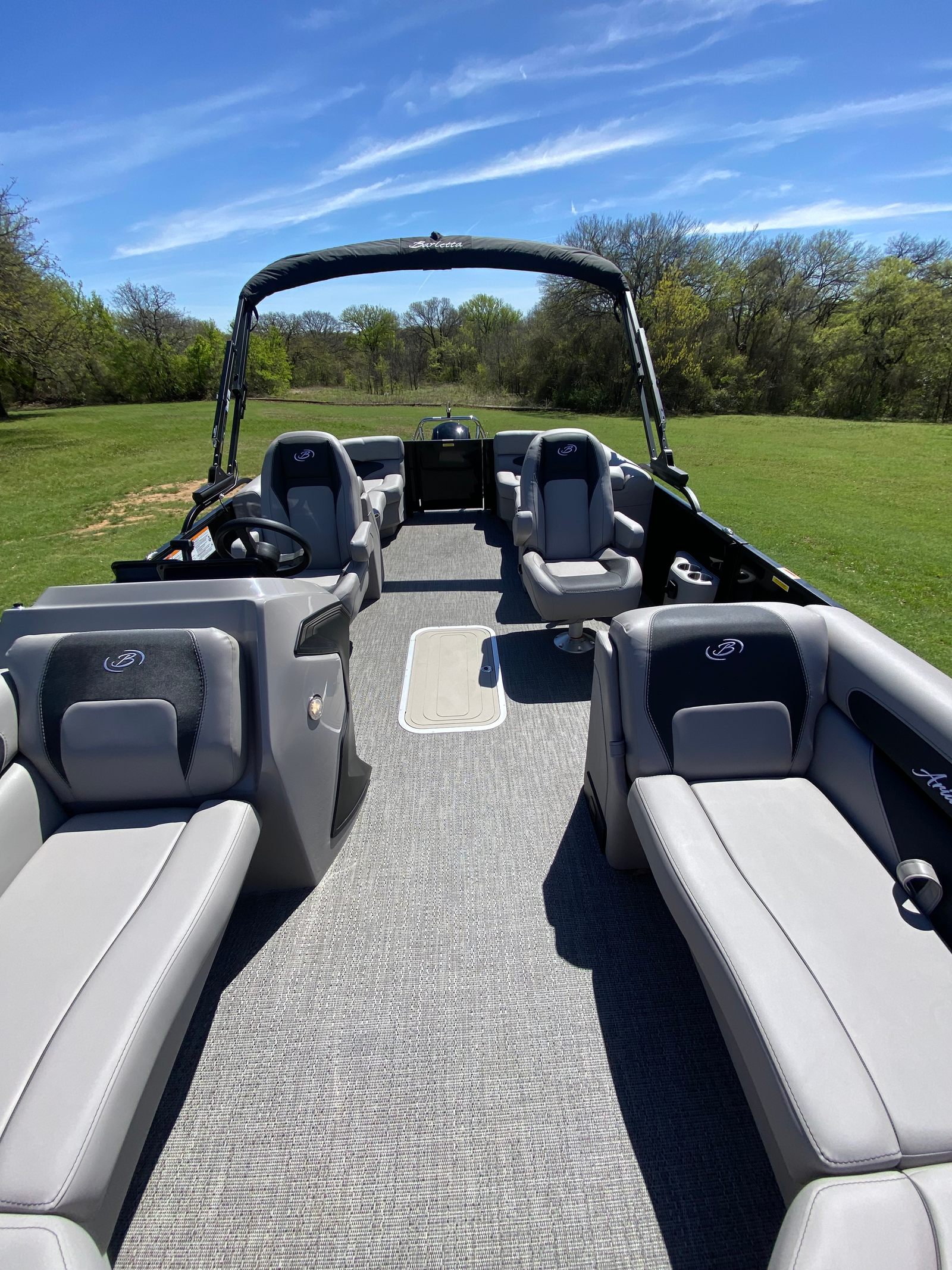 The Barletta Aria A22QC is packed with features designed to enhance your time on the water. The triple toon package provides added stability and buoyancy, allowing for a smoother ride and increased passenger capacity. The railskin color combination of Black Diamond and Gray Moonstone, complemented by the Blackout Package Aria, creates a striking visual statement that sets this pontoon apart from the rest.Step inside, and you will find Tempest Gray furniture that offers both comfort and durability, perfect for long days spent lounging or socializing. The Amore Gray flooring is not only stylish but also easy to clean and maintain, ensuring your pontoon stays looking its best season after season. A stainless steel flag pole with an American flag adds a patriotic touch, making this Barletta boat for sale a proud centerpiece for any gathering on the water.