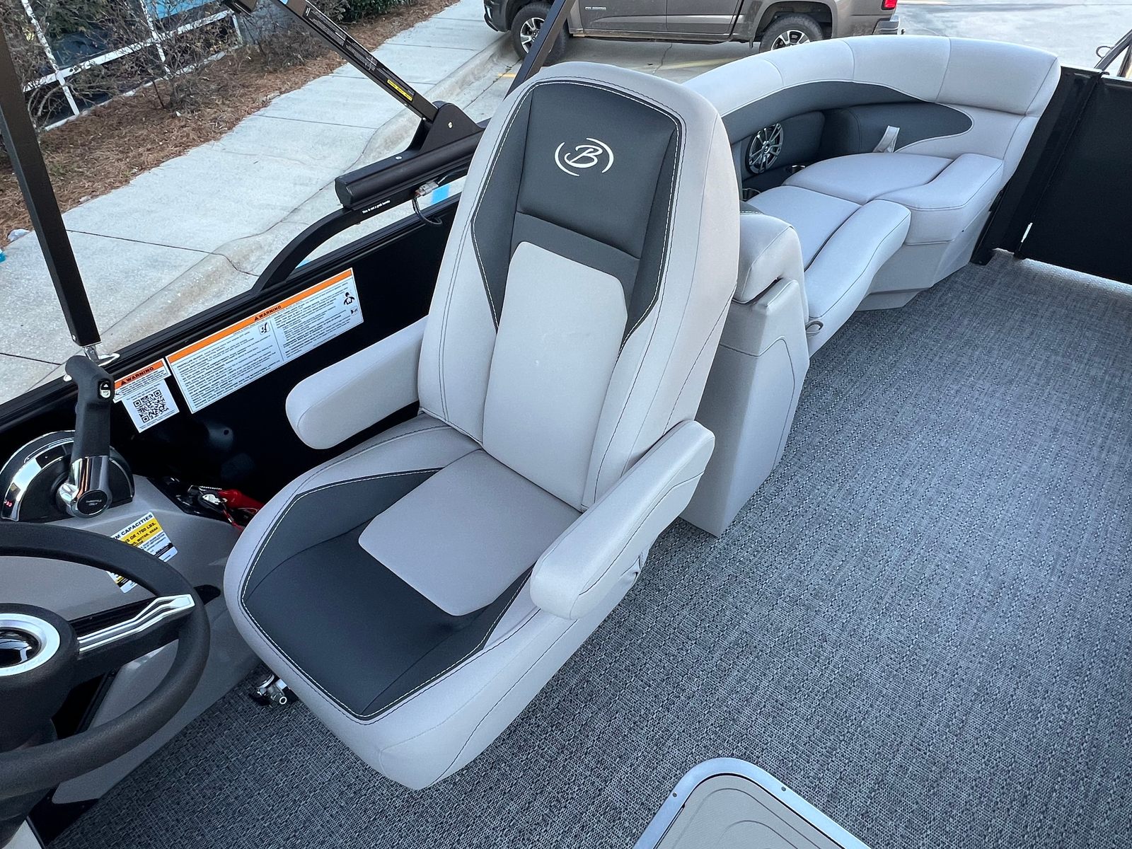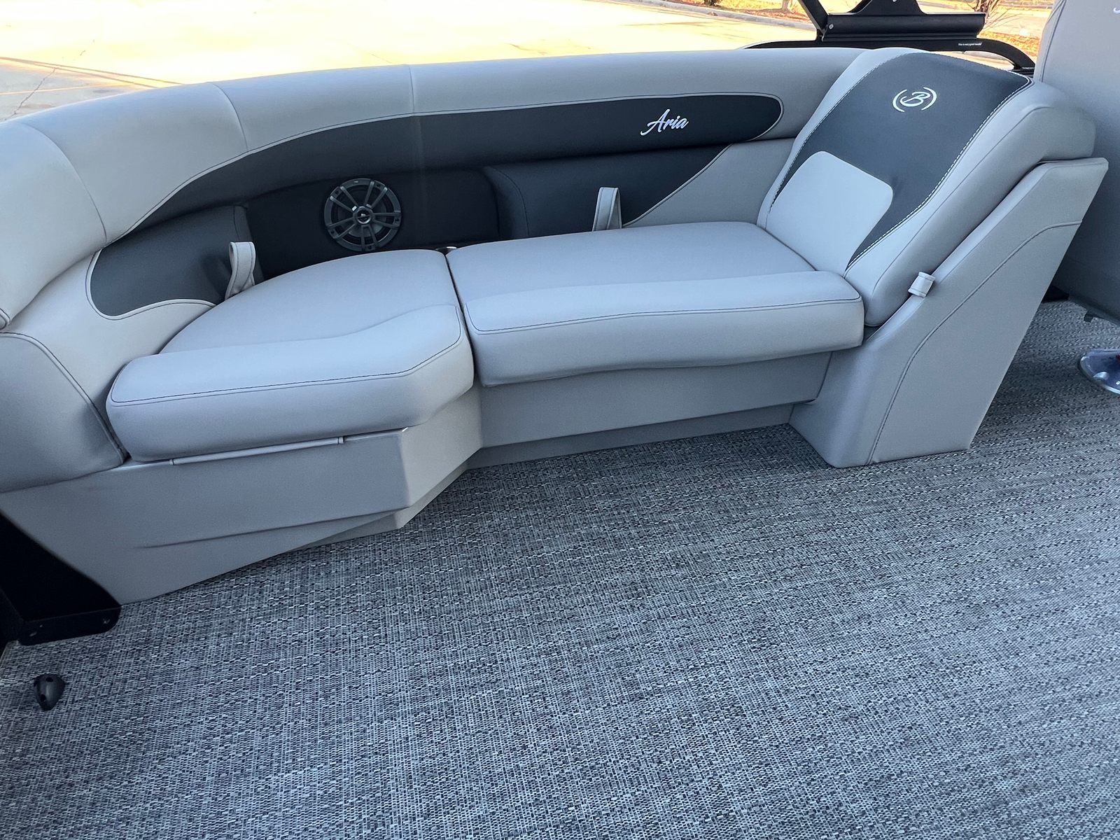 The Barletta Aria A22UC-Platinum is packed with features that elevate your time on the water. The Railskin Color Aria in Blue Sapphire, complemented by the Railskin Accent Aria in Winter White, creates a striking visual appeal that is both modern and timeless. The Blackout Package Aria adds a touch of sophistication, giving the pontoon a bold and distinctive look.Step aboard and you are greeted by Tempest Gray furniture, designed for both comfort and style. The plush seating invites you to relax and unwind, while the Amore Gray flooring provides a soft, slip-resistant surface that is easy to maintain. The Triple Toon Package Aria enhances stability and buoyancy, making this pontoon ideal for a variety of water conditions.A clipped playpen cover with poles offers protection from the elements, ensuring your boat stays in pristine condition when not in use. Every detail, from the railskin accents to the flooring, is thoughtfully chosen to create an inviting and luxurious environment.