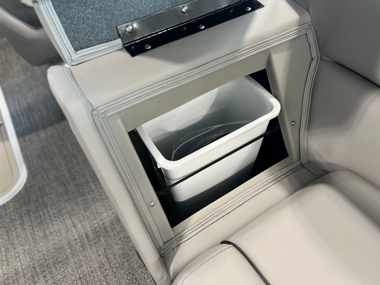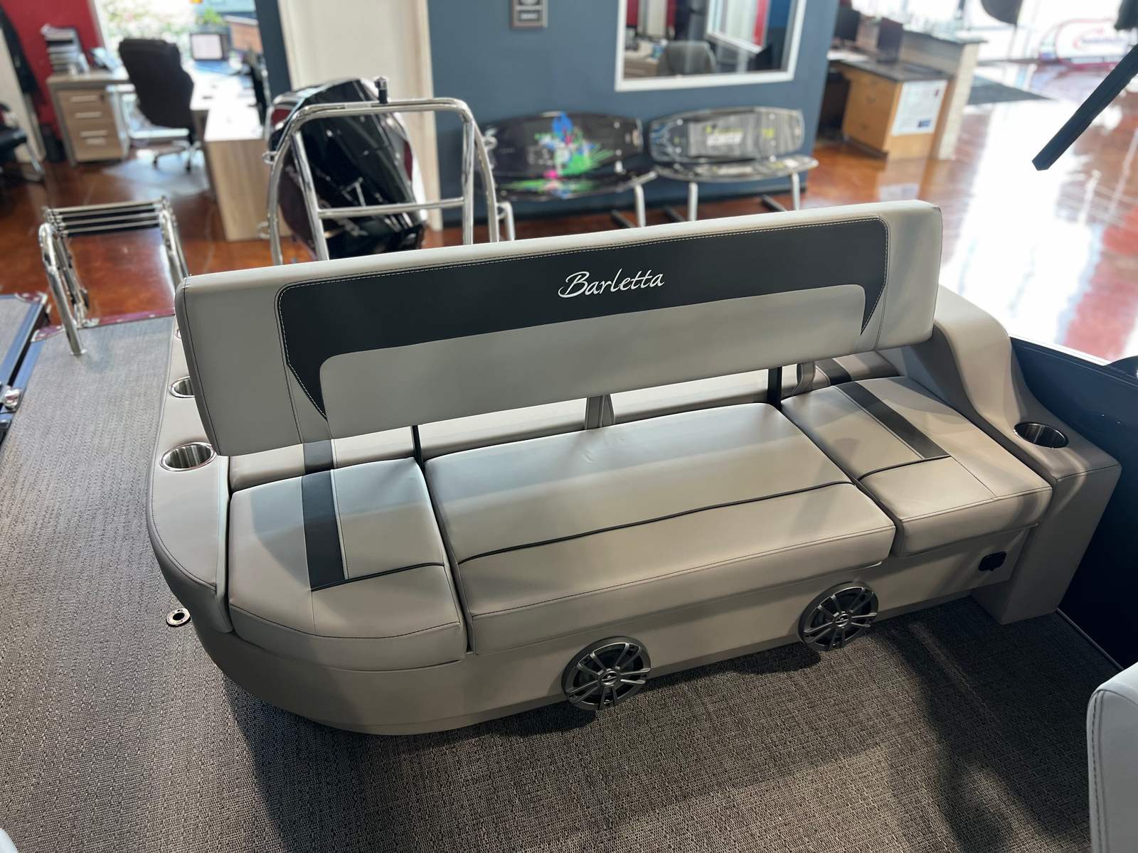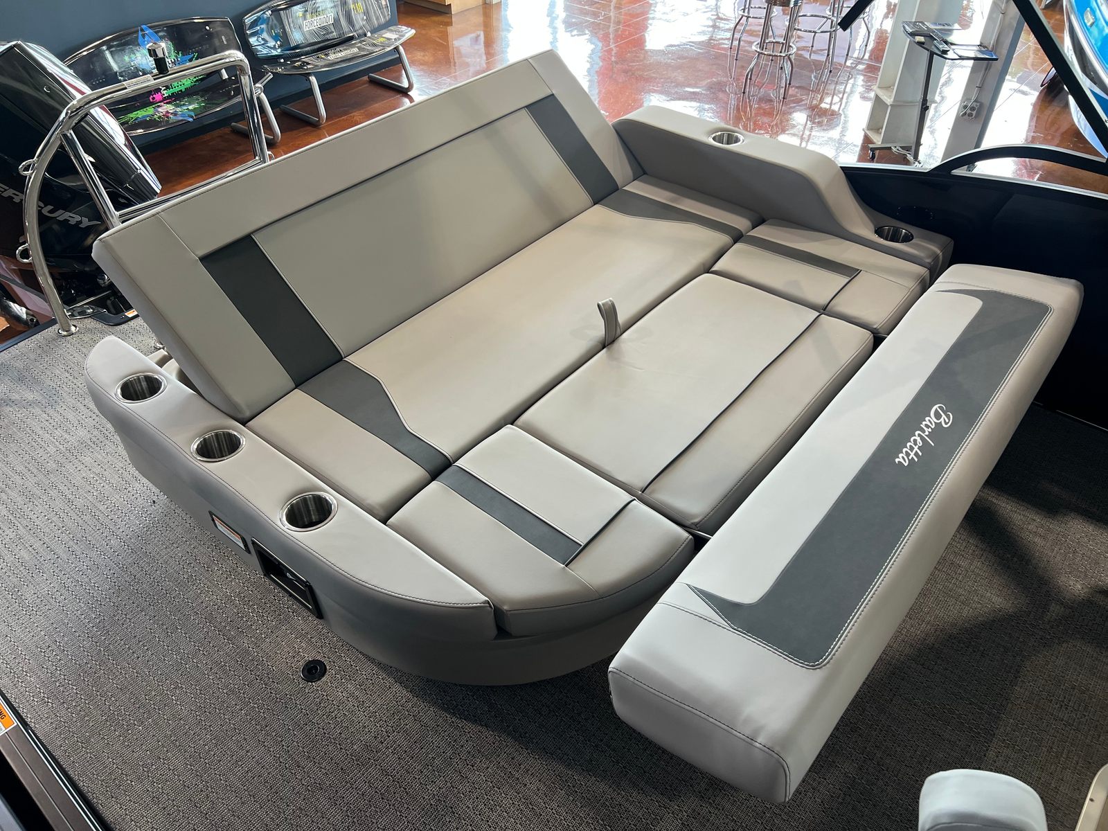 The Barletta Aria A22UC-Platinum is loaded with features that set it apart from other pontoon boats for sale. The striking Railskin Color Aria in Black Diamond, paired with the Blackout Package Aria, gives this pontoon a bold, sophisticated look that is sure to impress. Step inside and you are greeted by plush Tempest Gray furniture, designed for maximum comfort and durability, making every outing a luxurious experience.The Amore Gray flooring not only adds a touch of elegance but is also easy to maintain, ensuring your pontoon stays looking its best season after season. The Triple Toon Package Aria enhances stability and performance, allowing for smoother rides and increased capacity. For those who appreciate thoughtful details, the stainless steel flag pole with an American flag adds a patriotic touch, while the in-floor midship storage provides convenient space for stowing gear, water toys, or picnic essentials.