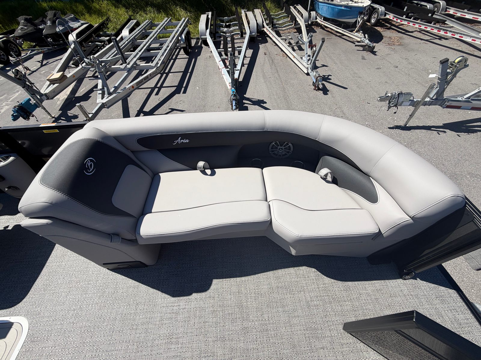 The Barletta Aria A22UC-Platinum is packed with special features that set it apart from other pontoon boats for sale. The Railskin Color Aria in Gray Moonstone and Railskin Accent Aria in Matte Black create a sleek, modern exterior, further enhanced by the Blackout Package Aria for a bold, sophisticated look. Inside, the Tempest Gray furniture offers plush seating and a refined atmosphere, while the Amore Gray flooring provides both durability and style. The Coastal Edition Aria ensures that this pontoon is ready for a variety of environments, from freshwater lakes to coastal waterways. The Triple Toon Package Aria enhances performance and stability, making it perfect for cruising, entertaining, or simply relaxing on the water. The rigging features a stainless steel prop for optimal efficiency and durability, while the Mercury mechanical pre-rig with power assist ensures smooth and effortless steering.