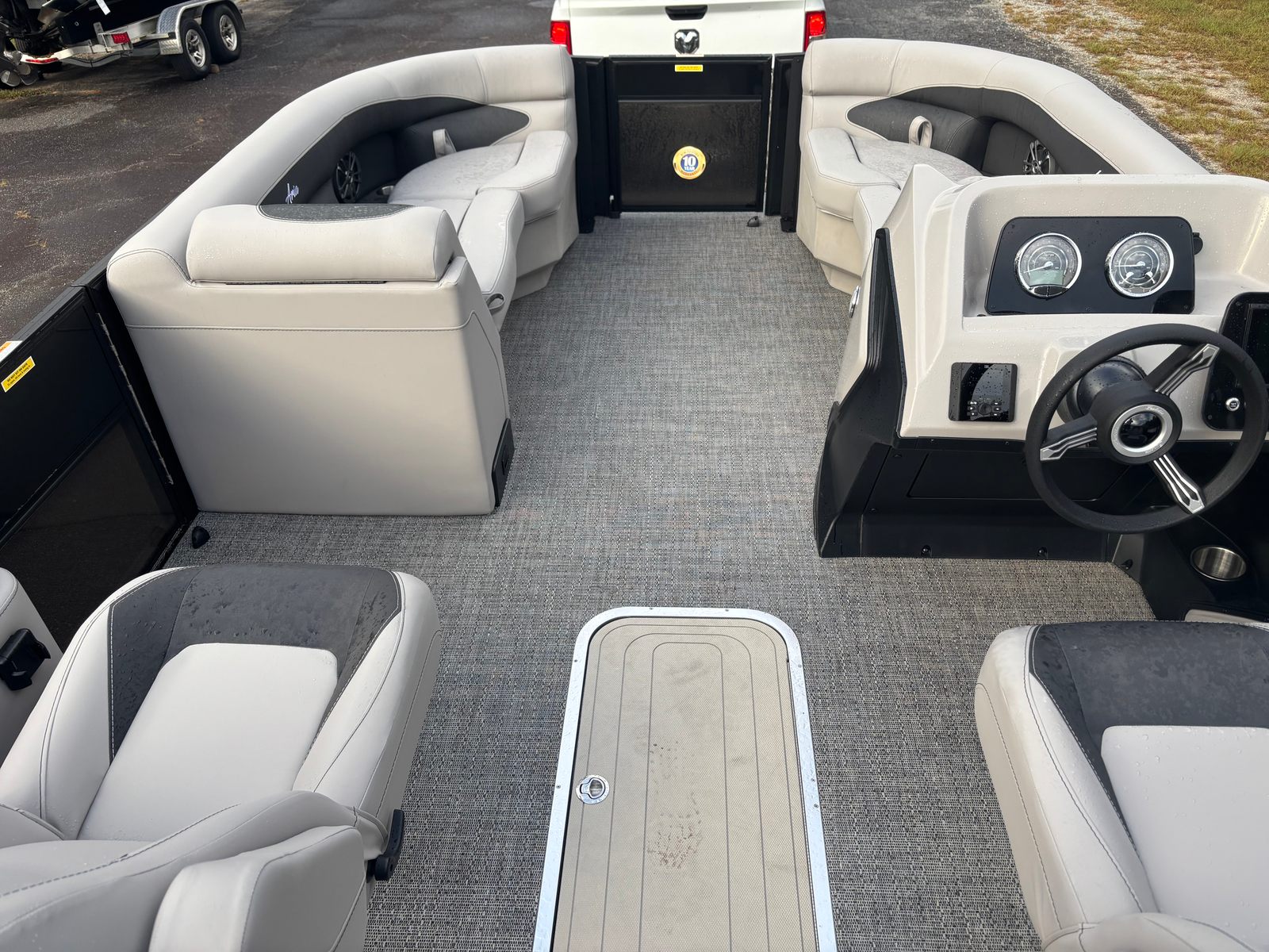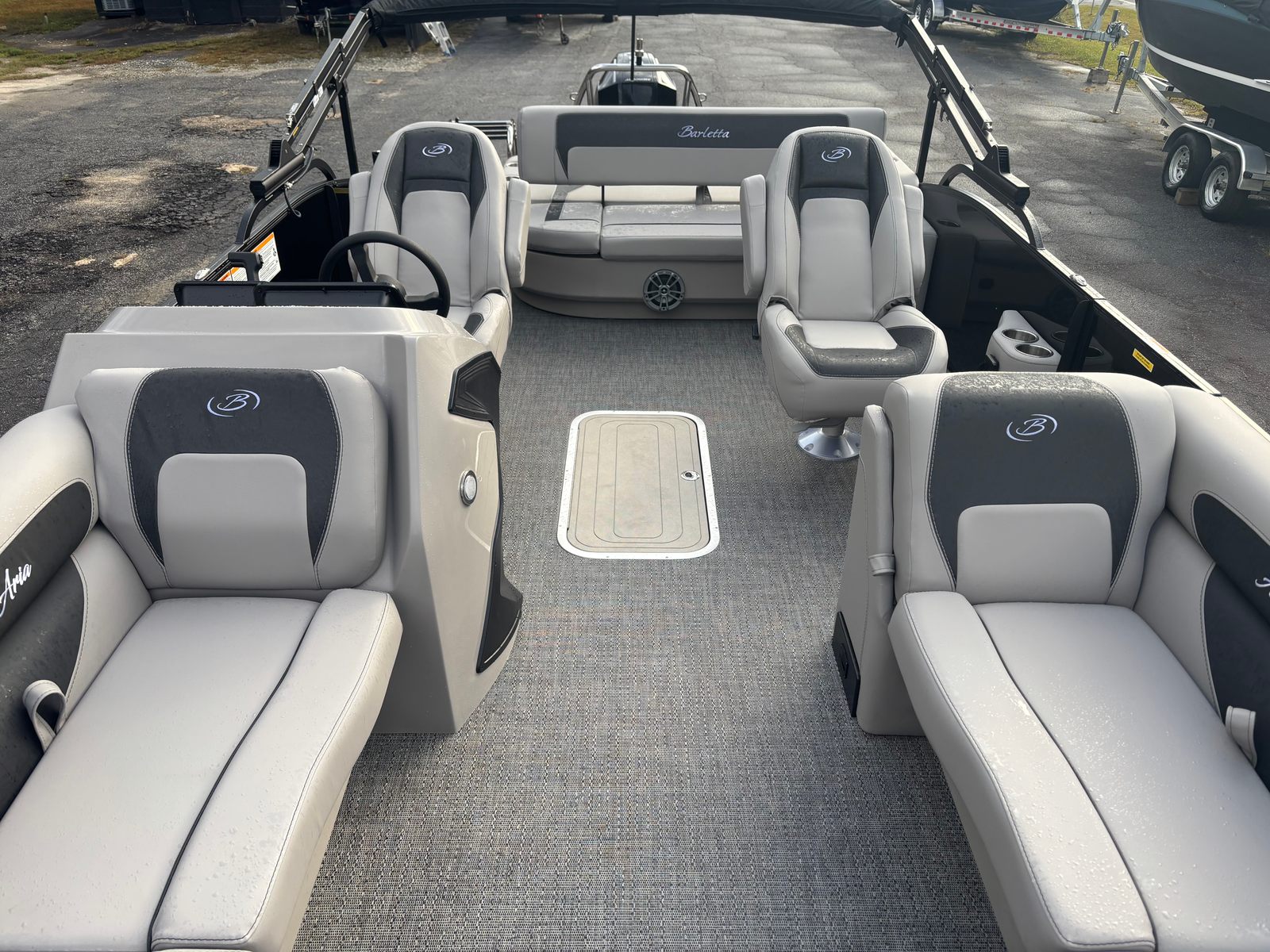 Step aboard the Barletta Aria A22UC-Platinum and discover a host of premium features designed to elevate your boating experience. The Tempest Gray furniture offers both comfort and sophistication, creating an inviting atmosphere for relaxing or socializing. The Blackout Package Aria railskin adds a bold, modern touch to the exterior, while the Black Diamond railskin color further enhances the boat’s sleek appearance. Stainless steel accents, including the flag pole with an American flag, provide a touch of elegance and pride.Inside, you’ll find Amore Gray flooring that’s both stylish and practical, offering durability and easy maintenance. The in-floor midship storage (available with the Triple Toon configuration) provides ample space for stowing gear, water toys, or picnic supplies, keeping the deck clutter-free and organized. At the helm, the Simrad 7" G07 XSE display puts navigation and system controls at your fingertips, making it easy to monitor your route, engine performance, and more.