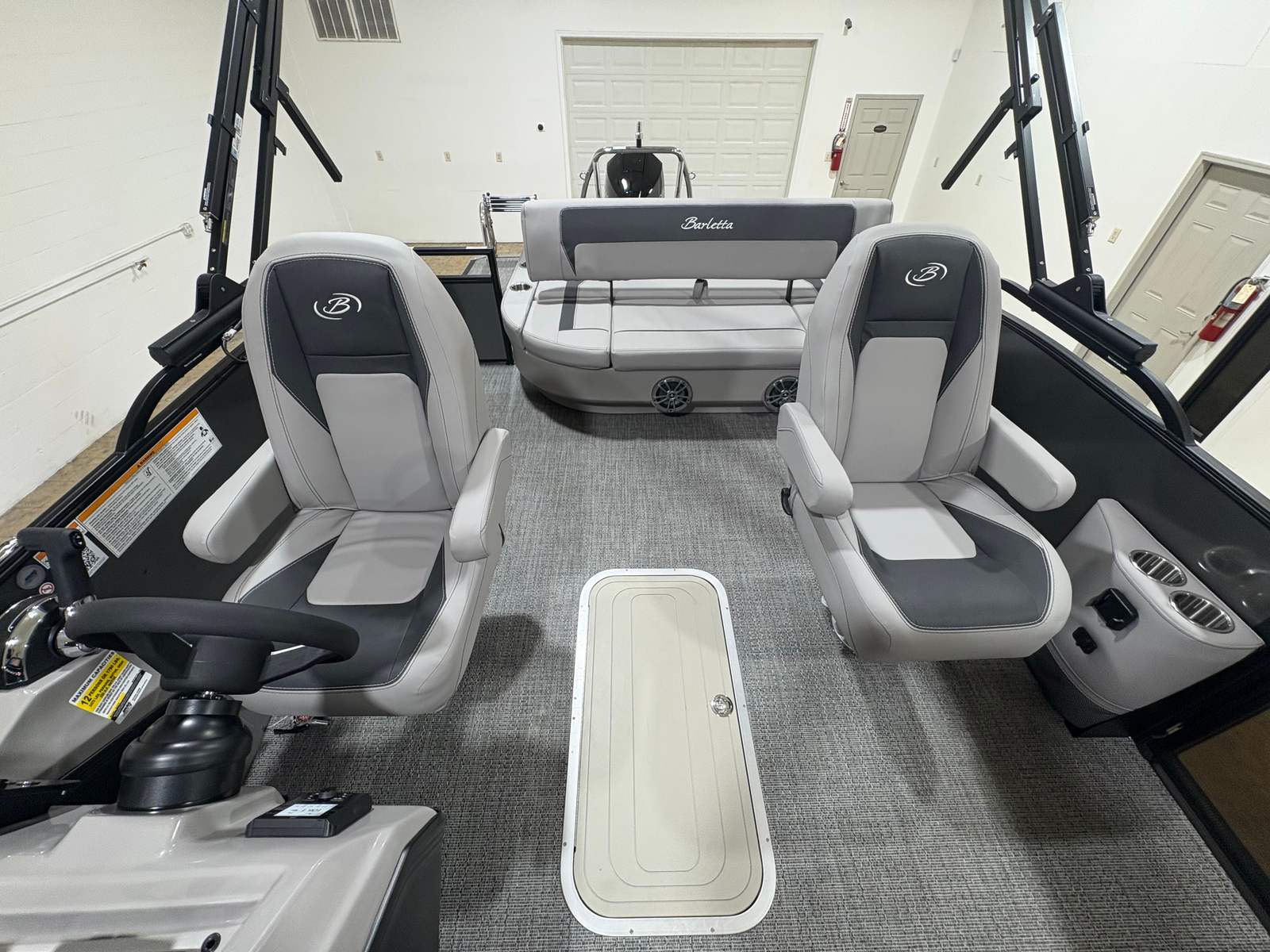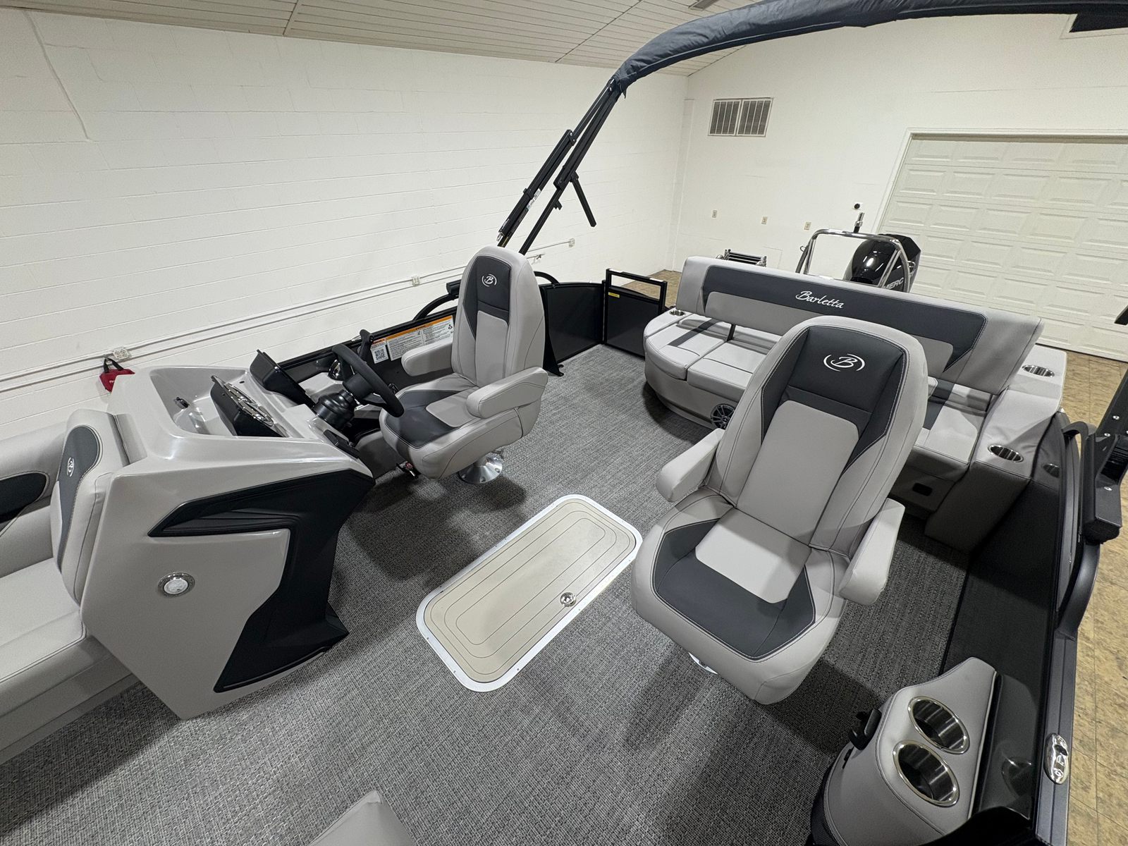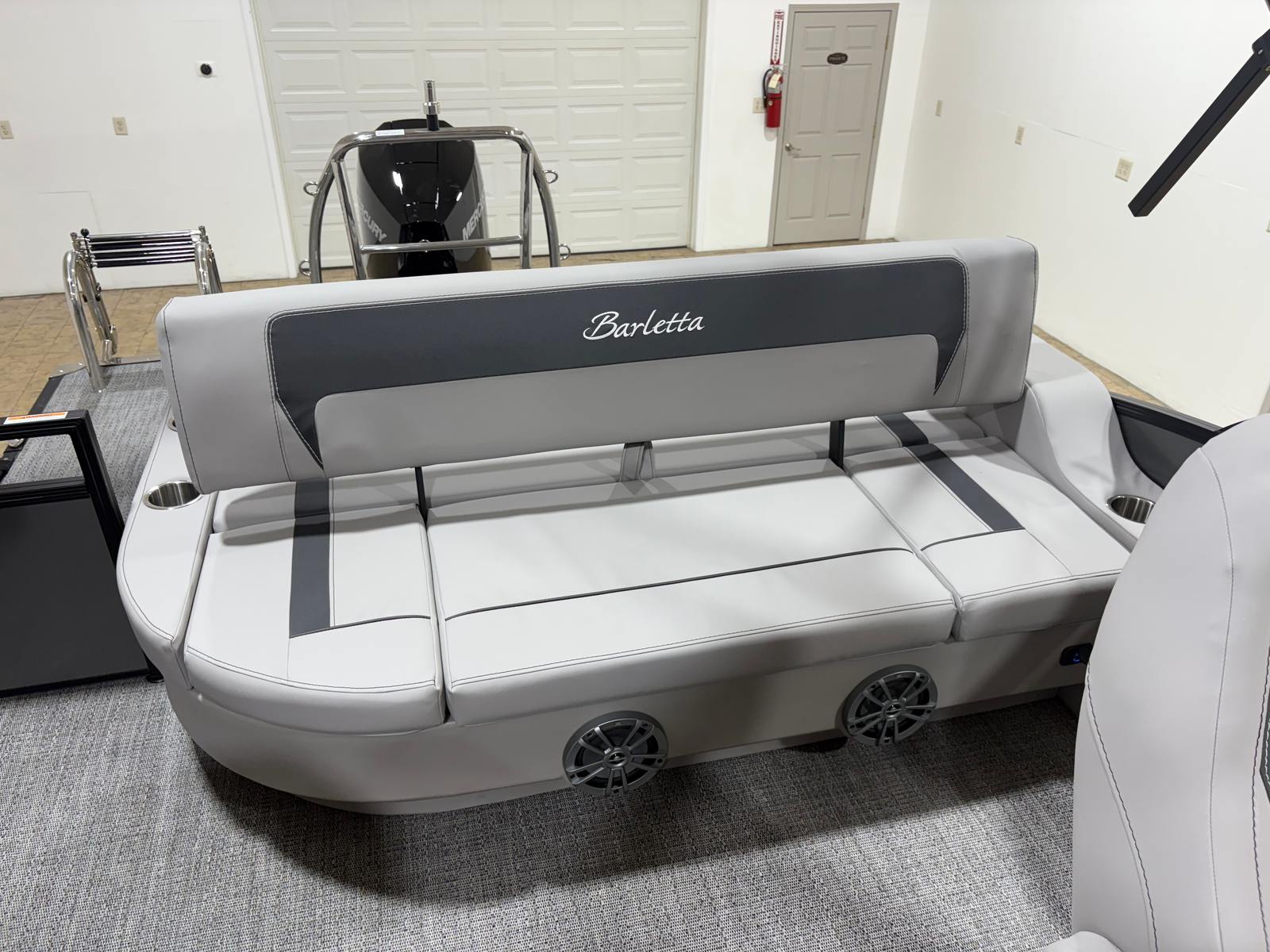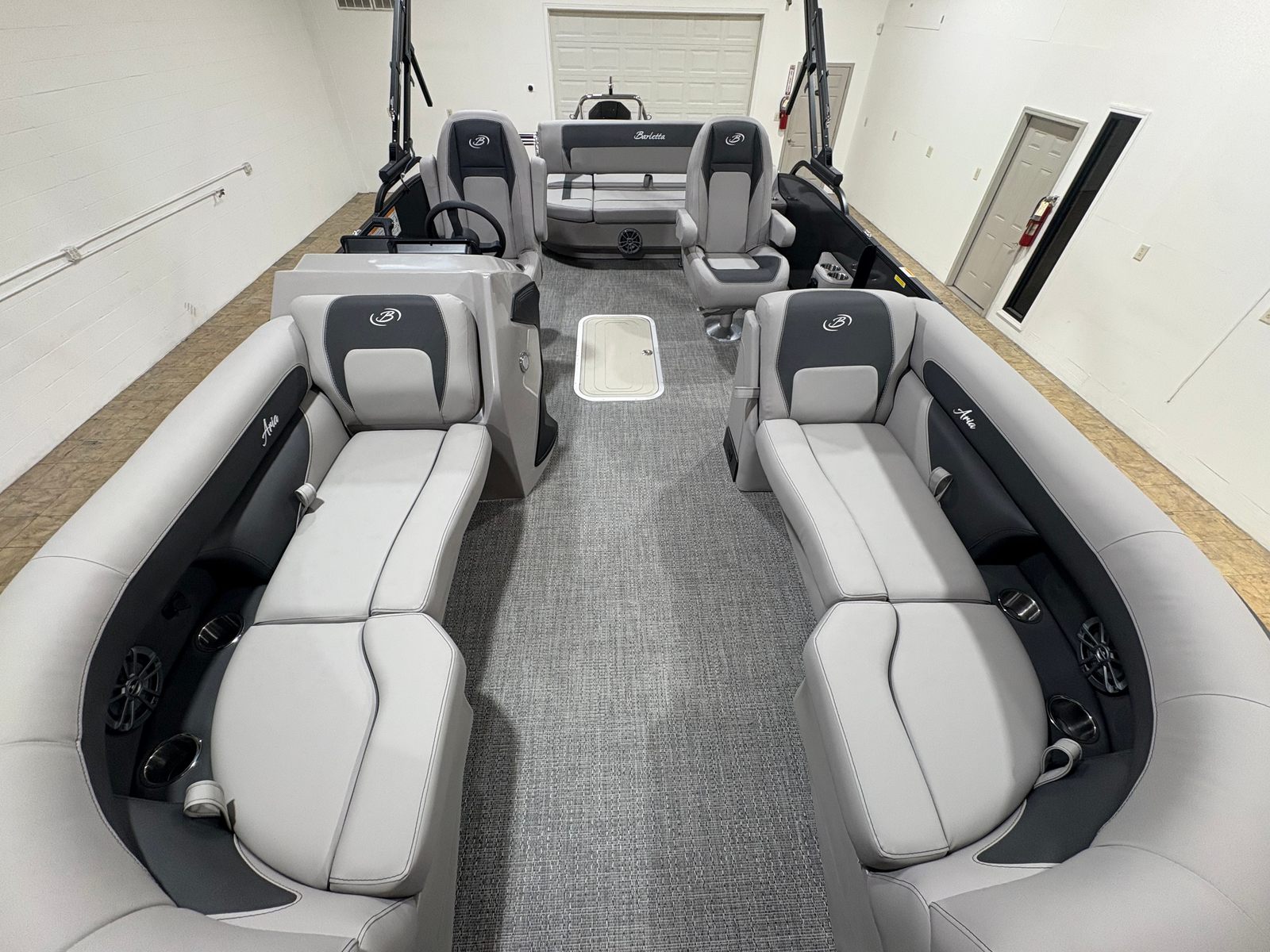 This Barletta pontoon boat is packed with special features designed to elevate your time on the water. The Railskin Color Aria in Gray Moonstone and the Blackout Package Aria give the exterior a sleek, modern look that’s sure to impress. Inside, the Tempest Gray furniture provides plush seating and comfort, while the Amore Gray flooring adds a touch of elegance and practicality. The Triple Toon Package Aria enhances the boat’s stability and ride quality, making it perfect for a variety of activities. The Mercury pre-rig with power assist and stainless steel prop ensures optimal engine performance and easy handling. For added flair, the exterior features a stainless steel flag pole with an American flag, showcasing your pride and style. The interior boasts in-floor midship storage (available with the Triple Toon package), offering convenient space for gear, water toys, and personal items.