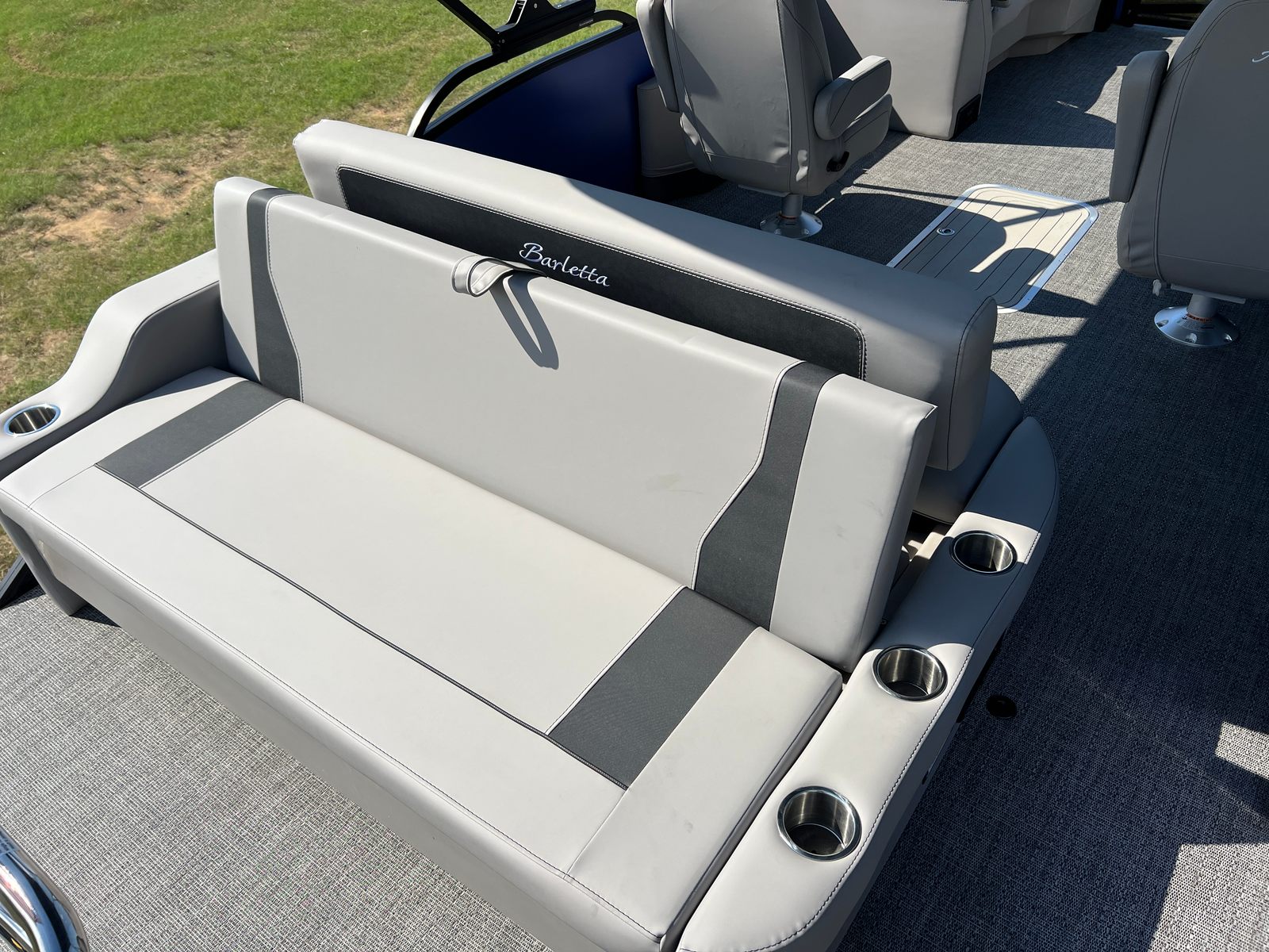 The Barletta Aria A22UC is packed with features designed to elevate your boating experience. The Pacific Matte Blue Railskin, complemented by Black Diamond accents and the Blackout Package Aria, creates a striking visual impression. Inside, the Tempest Gray furniture offers a plush, inviting atmosphere, while the Amore Gray flooring is both stylish and easy to maintain. The Triple Toon Package Aria enhances buoyancy and stability, making this pontoon perfect for larger groups or those who want extra peace of mind on the water. The Mercury 150L Four Stroke engine, paired with a stainless steel prop, ensures reliable performance and longevity. A stainless steel flag pole with an American flag adds a patriotic touch, making this boat a true standout.