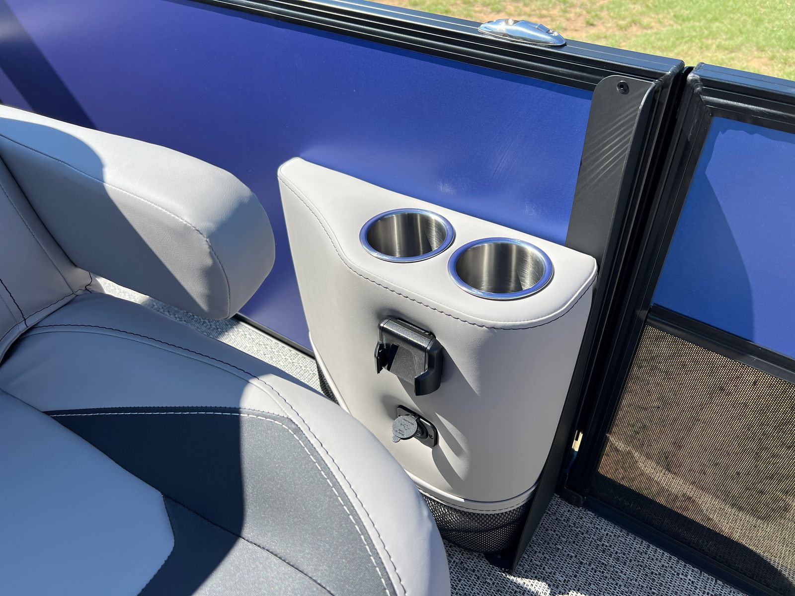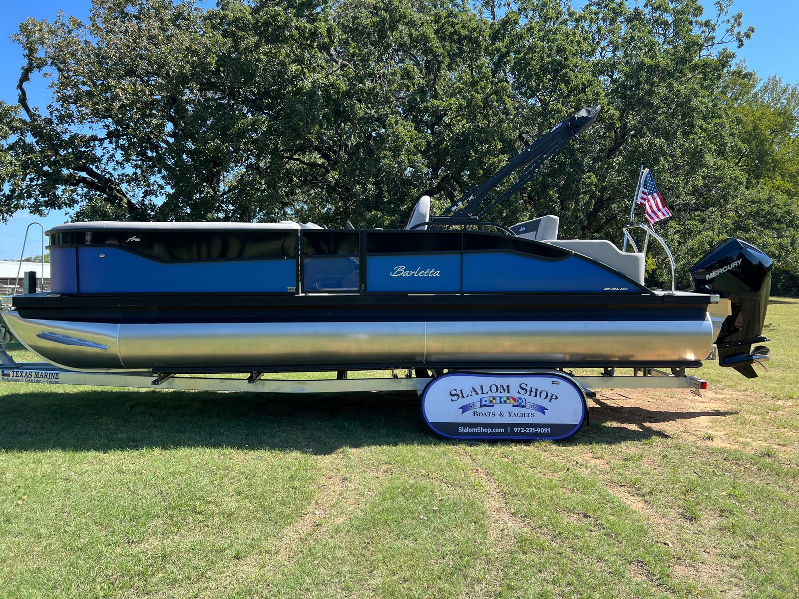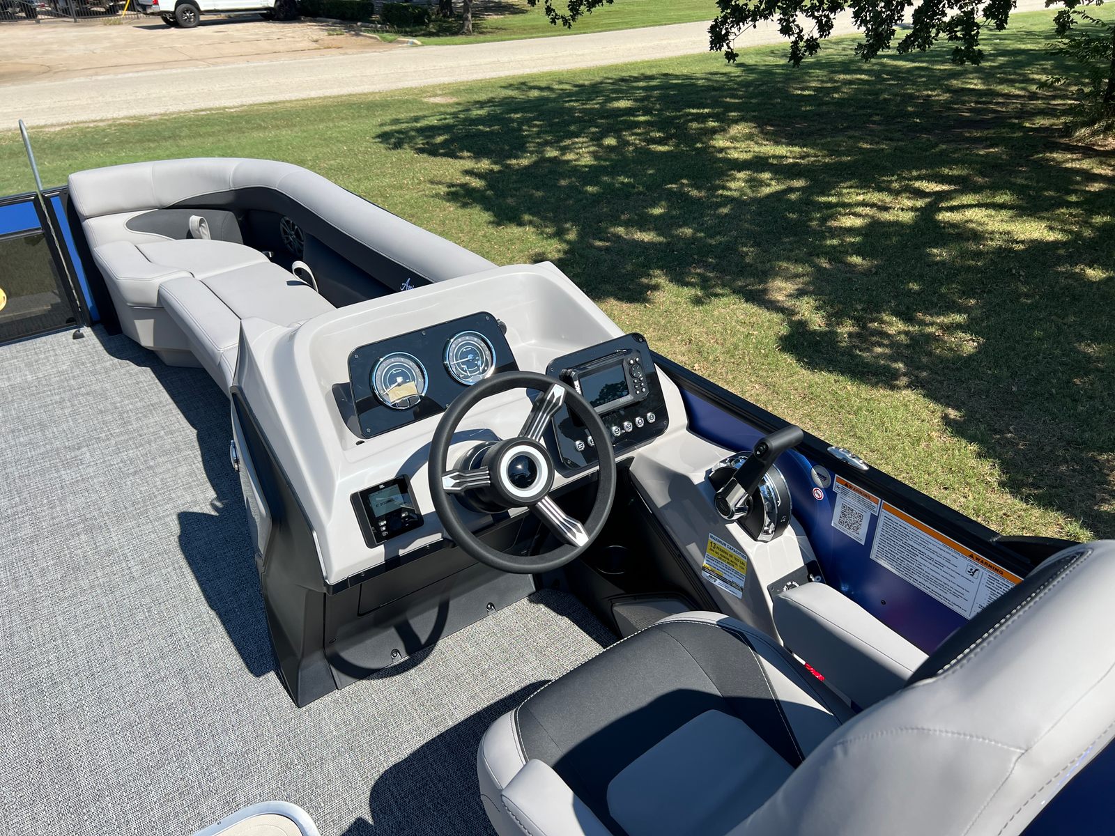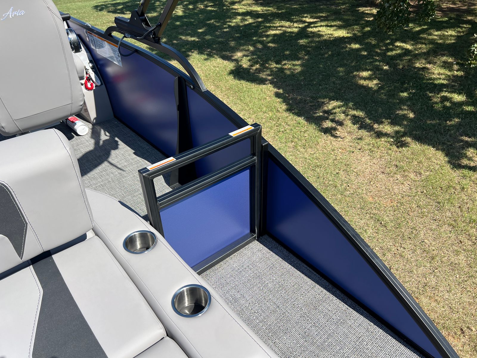 The Barletta Aria A24UC is a 2026 model, measuring just over 23 feet in length. This spacious pontoon boat offers ample room for family, friends, and all your favorite activities. Its sleek profile and modern lines are accentuated by the Pacific Matte Blue Railskin color, complemented by the Black Diamond accent and the striking Blackout Package Aria. The combination of Tempest Gray furniture and Amore Gray flooring creates a sophisticated and inviting atmosphere, making every outing feel like a luxury escape. Whether you’re cruising, entertaining, or simply relaxing, this Barletta boat for sale delivers a premium experience from bow to stern.