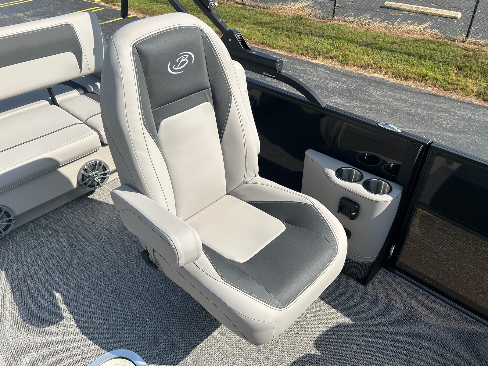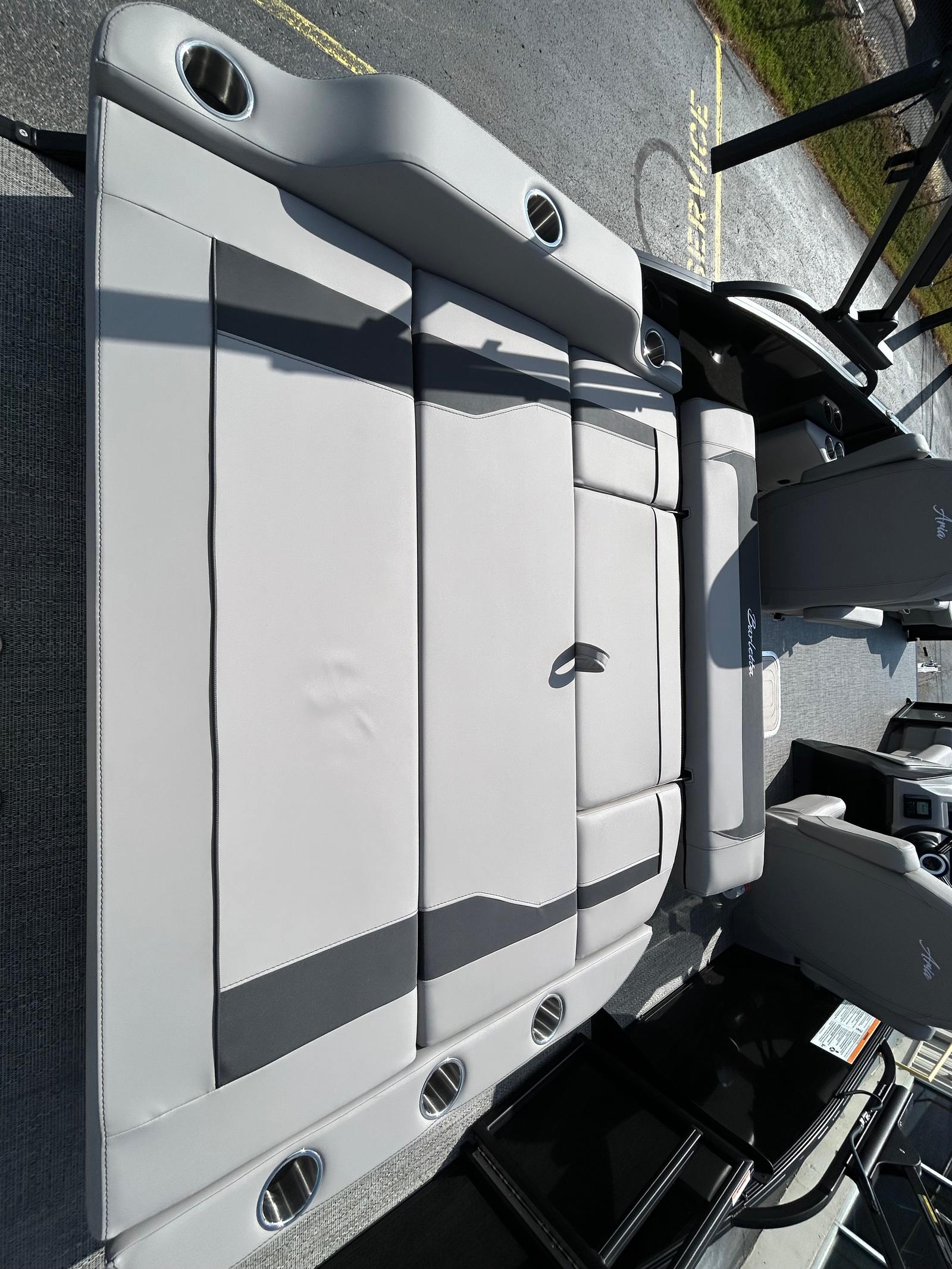 The 2026 Barletta Aria A24UC is loaded with features that set it apart from other pontoon boats for sale. The exterior showcases a stainless steel flag pole adorned with an American flag, adding a touch of patriotic flair to your boating experience. The Black Diamond railskin color, complemented by the Gray Moonstone accent and Blackout Package Aria, creates a striking visual appeal. Inside, the Tempest Gray furniture offers plush comfort and a modern look, while the Amore Gray flooring provides a stylish and easy-to-clean surface underfoot. The Triple Toon Package Aria enhances stability and performance, ensuring a smooth and enjoyable ride even in choppier waters.