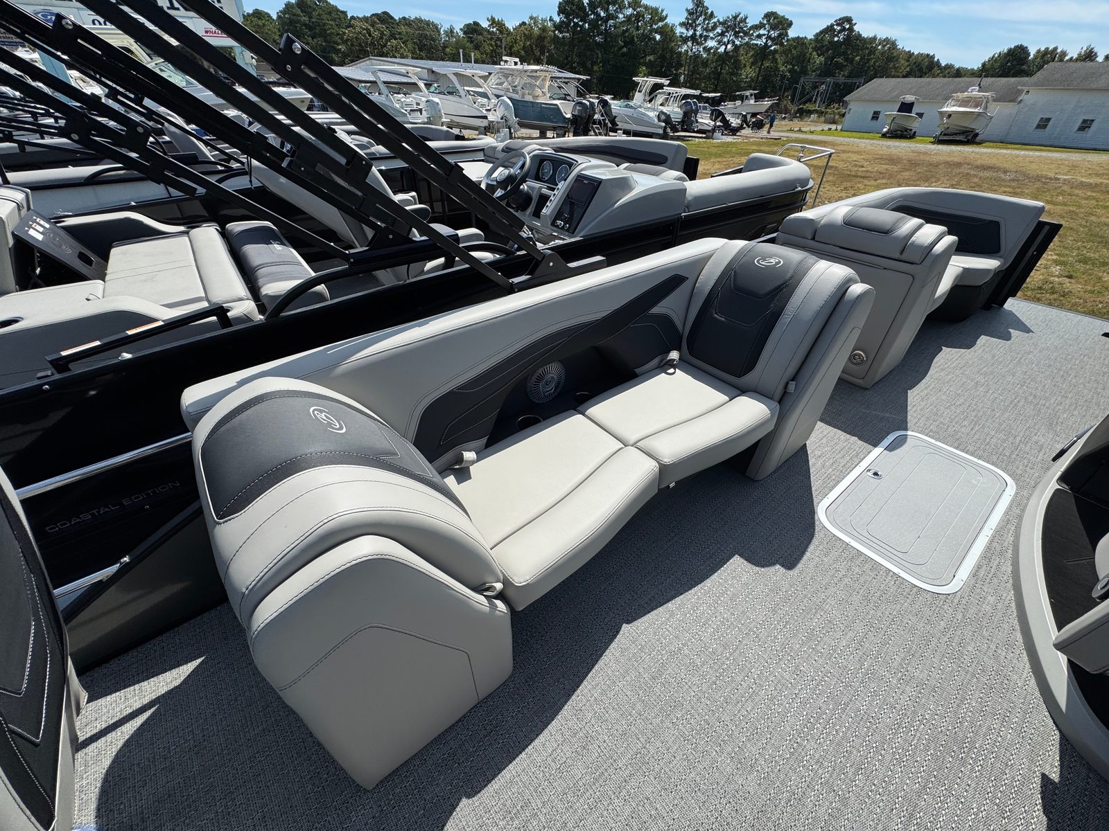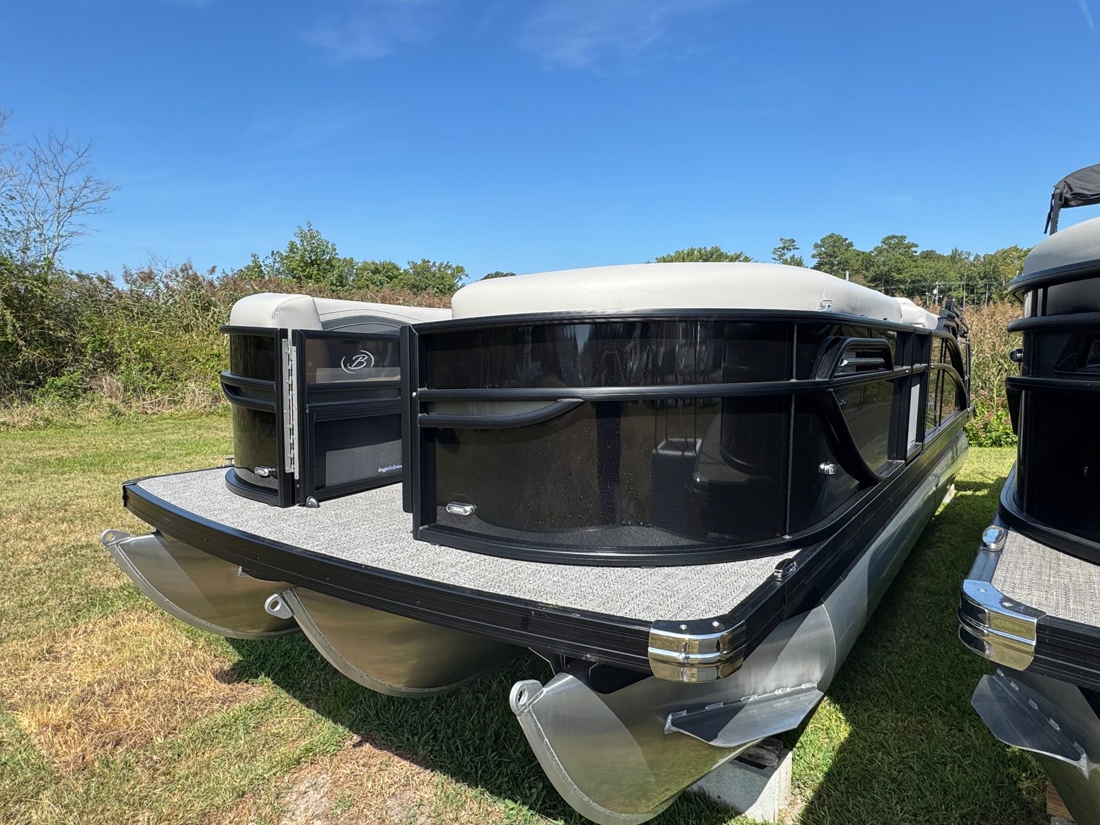The Barletta Cabrio C22CC is loaded with special features that set it apart from other pontoon boats for sale. The Blackout Package Cabrio gives the boat a bold, modern look, while the Marquesan Gray with Onyx furniture provides a sophisticated and comfortable seating arrangement for all passengers. The Amore Gray flooring is both stylish and practical, offering a durable and easy-to-clean surface that stands up to the demands of active days on the water.As part of the Coastal Edition Cabrio (CC Models), this pontoon is designed to handle a variety of water conditions, making it a versatile choice for both inland lakes and coastal adventures. The Triple Toon Package with midship storage adds stability, buoyancy, and extra storage space, ensuring you have plenty of room for gear, water toys, and essentials for a full day of fun.