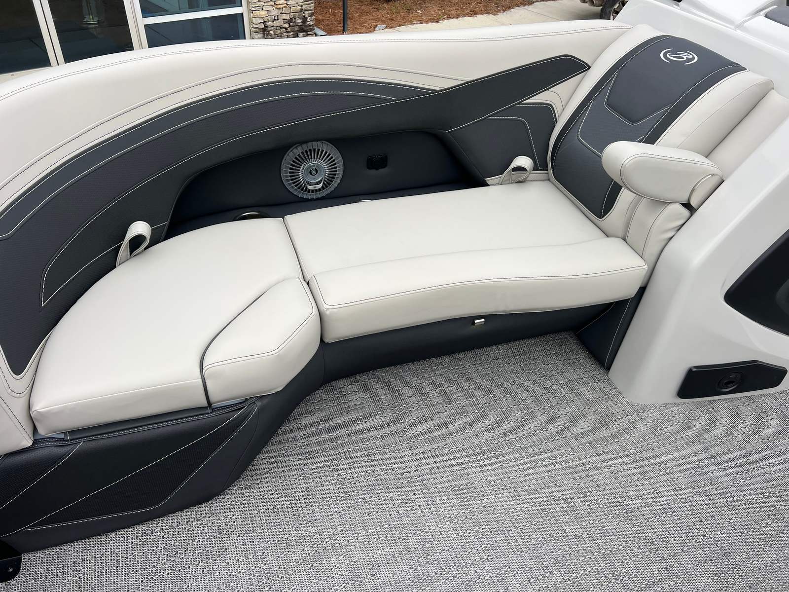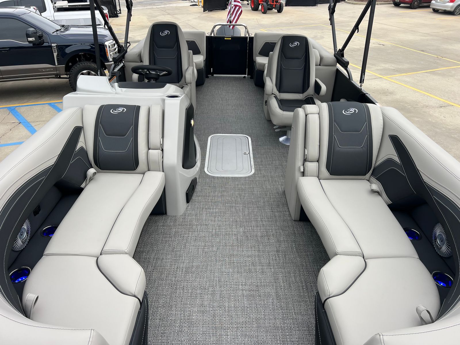 The Barletta Cabrio C22QC is loaded with features that elevate your boating experience. The striking Black Diamond Railskin and Marquesan Gray with Onyx furniture set the stage for a luxurious day on the water, while the Amore Gray flooring is both stylish and easy to maintain. The Triple Toon Package with midship storage not only enhances performance but also provides convenient space for stowing gear and essentials. A standout feature is the stainless steel flag pole with an American flag, adding a patriotic touch to your adventures. The interior RGB lighting package creates a customizable ambiance, perfect for evening cruises or lively gatherings. Navigation and control are made effortless with the Simrad 7" G07 XSR Chartplotter/Multifunction Display, offering advanced chart plotting and system monitoring at your fingertips. Every element of this pontoon boat is designed to maximize comfort, convenience, and enjoyment.