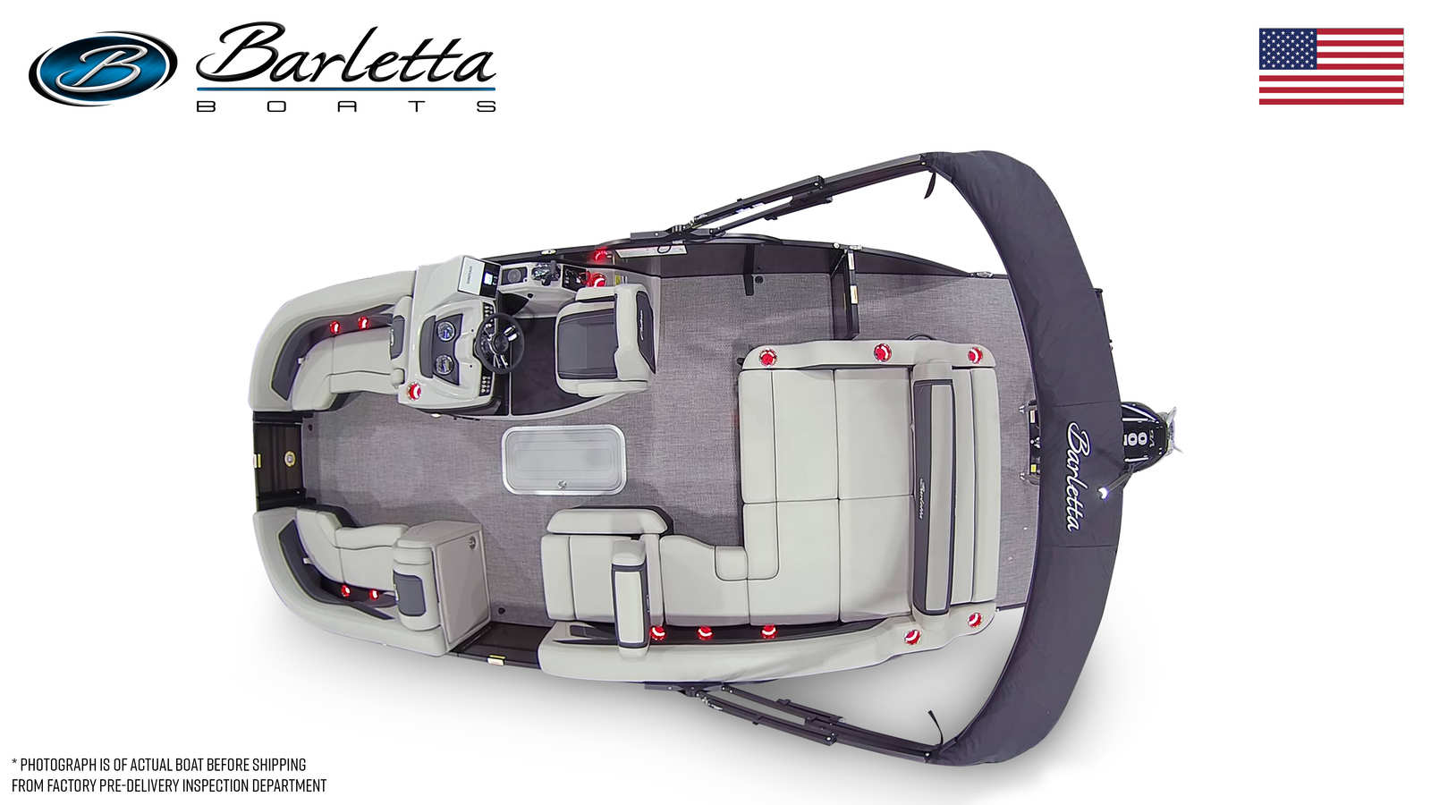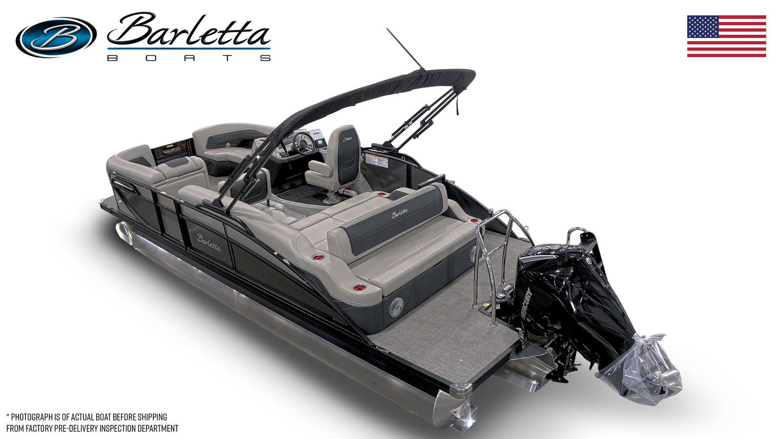 The Barletta Cabrio C22U is packed with premium features designed to maximize comfort, convenience, and enjoyment. The Champagne Railskin color and Gray Moonstone accent give the boat a refined, modern look, while the Blackout Package Cabrio adds a touch of bold sophistication. Inside, the Marquesan Gray/Onyx furniture provides plush seating and ample lounging space, complemented by the stylish Amore Gray flooring that’s both durable and easy to maintain.The Triple Toon Package with midship storage offers enhanced stability and extra room for gear, making it easy to stow water toys, fishing equipment, or picnic supplies. The Mercury (M) 200L FourStroke engine is paired with mechanical pre-rigging and power assist for effortless operation, and the stainless steel prop ensures optimal performance. A stainless steel flag pole with an American flag adds a patriotic touch, perfect for celebrating holidays or simply showing your pride on the water.