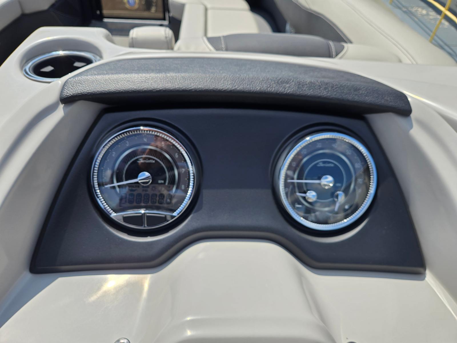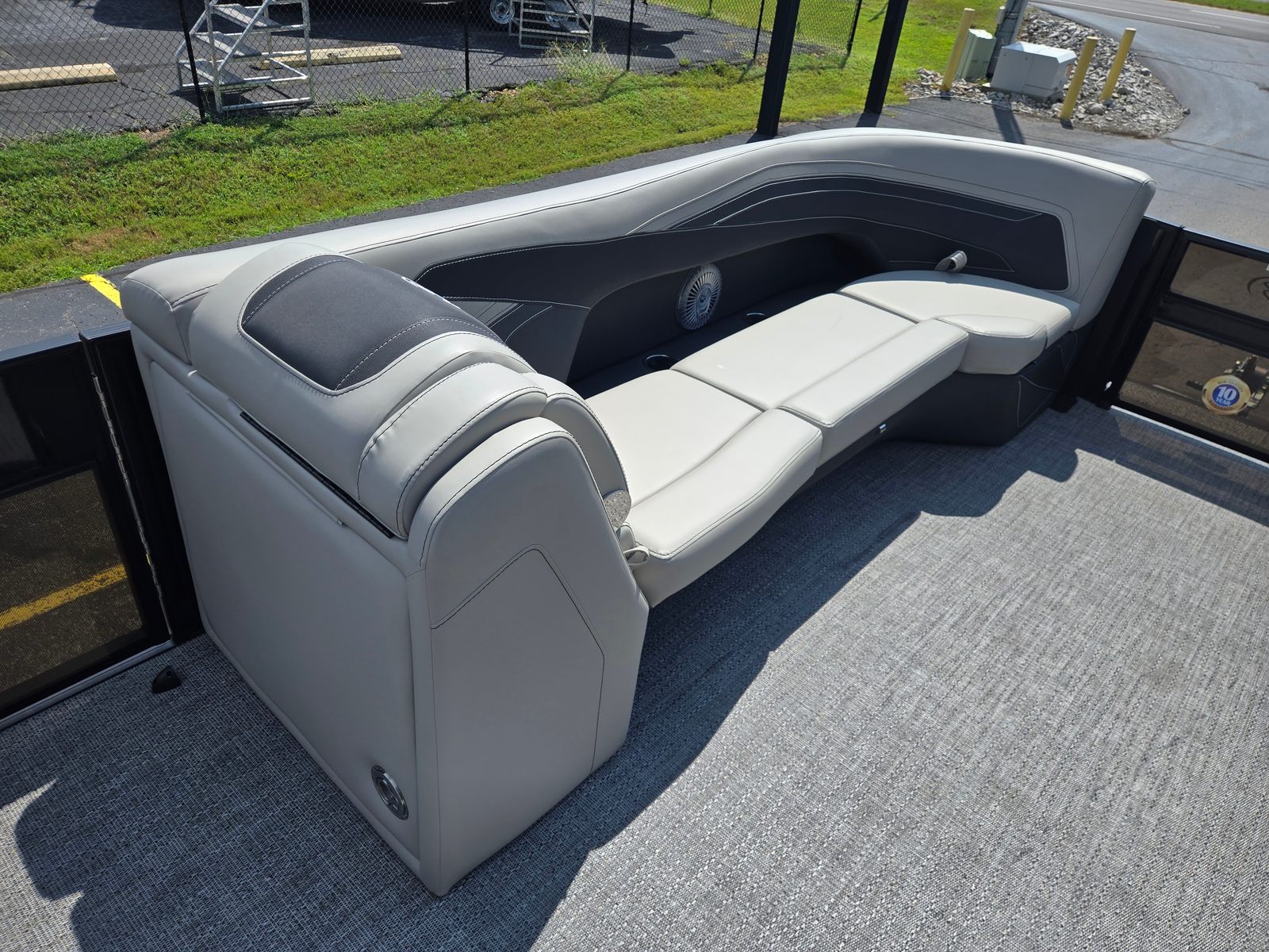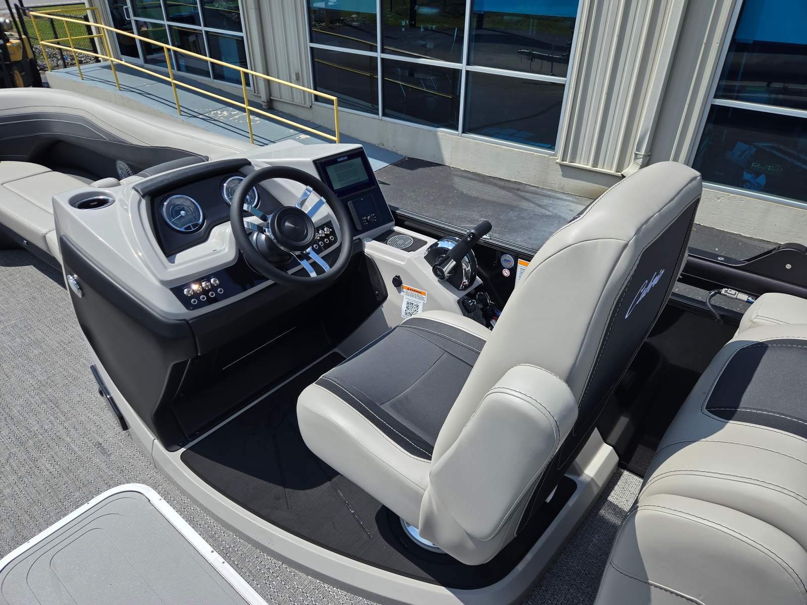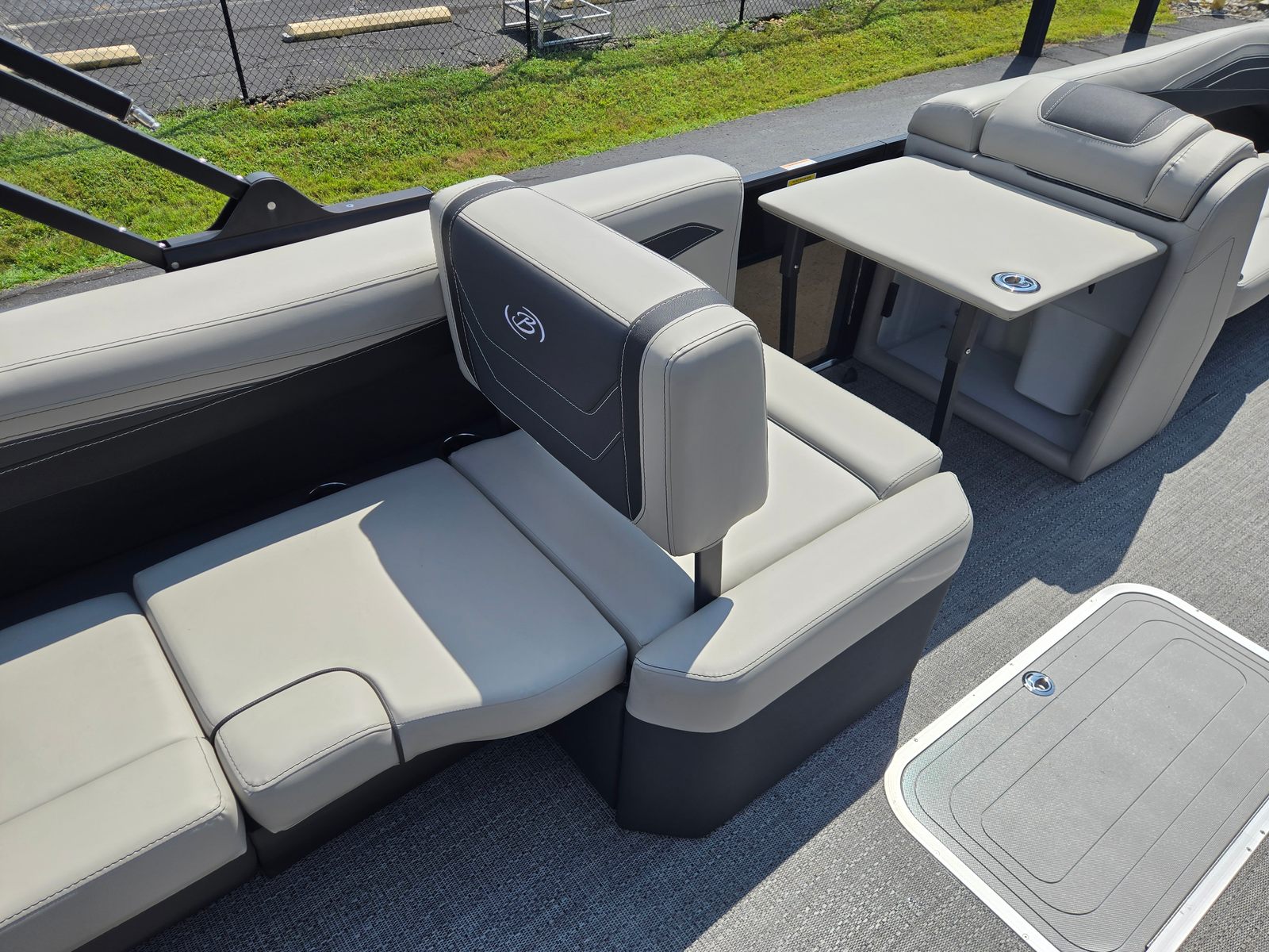 The Barletta Cabrio C24Q is packed with features that set it apart in the pontoon market. The Triple Toon Package with Midship Storage not only improves performance but also provides convenient storage solutions for gear, water toys, and personal items. The Simrad 7" G07 XSR Chartplotter/Multifunction Display offers advanced navigation and system monitoring, keeping you informed and in control throughout your journey. Exterior lighting, including white underdeck and underwater lights, enhances visibility and ambiance during evening cruises, while the Interior RGB Lighting Package Cabrio allows you to customize the mood to suit any occasion.A stainless steel flag pole with an American flag adds a patriotic touch, making your boat stand out on the water. The Railskin Packages: Blackout Package Cabrio, paired with the Black Diamond color, creates a striking visual profile that’s sure to turn heads at the marina. The Marquesan Gray with Onyx furniture is both comfortable and stylish, providing the perfect setting for relaxation and socializing.