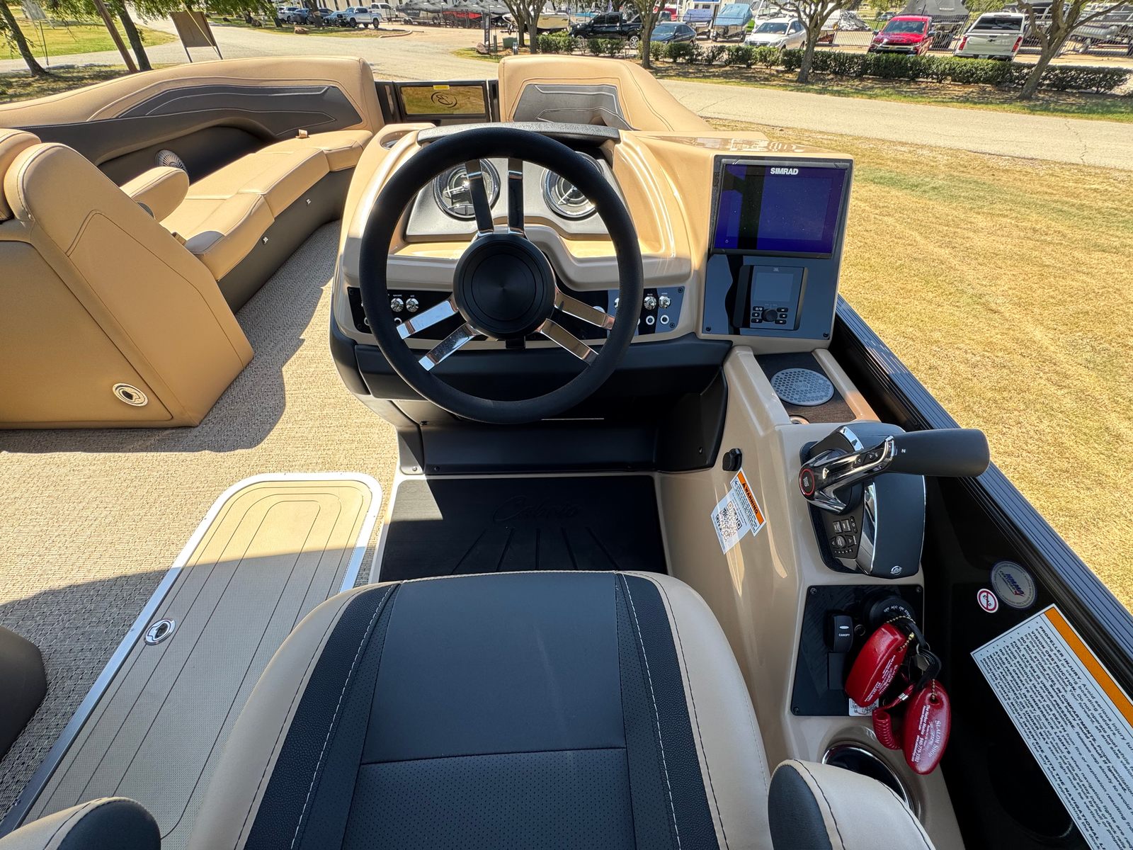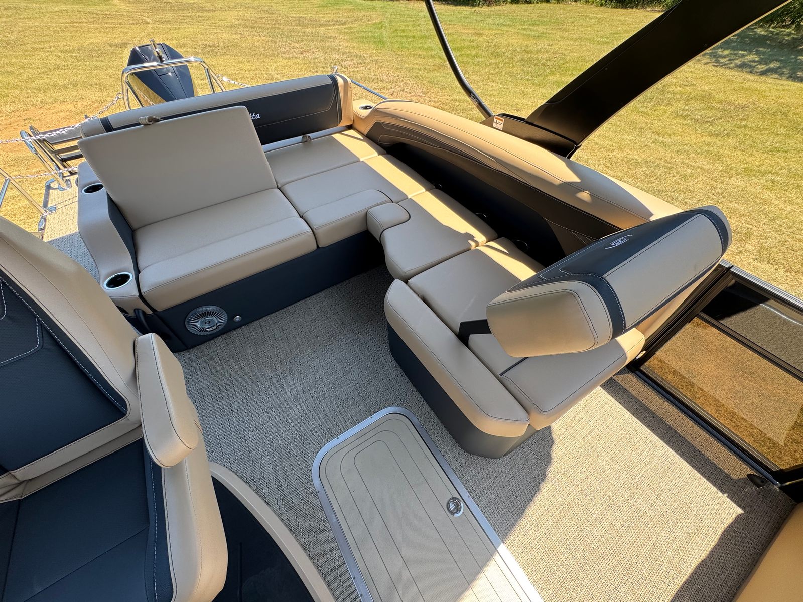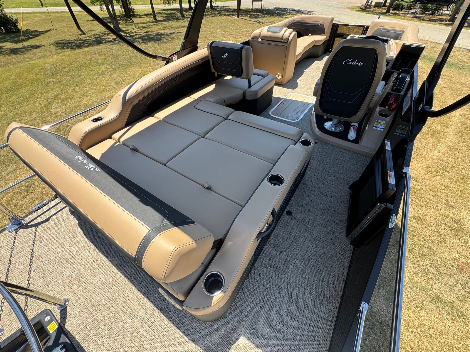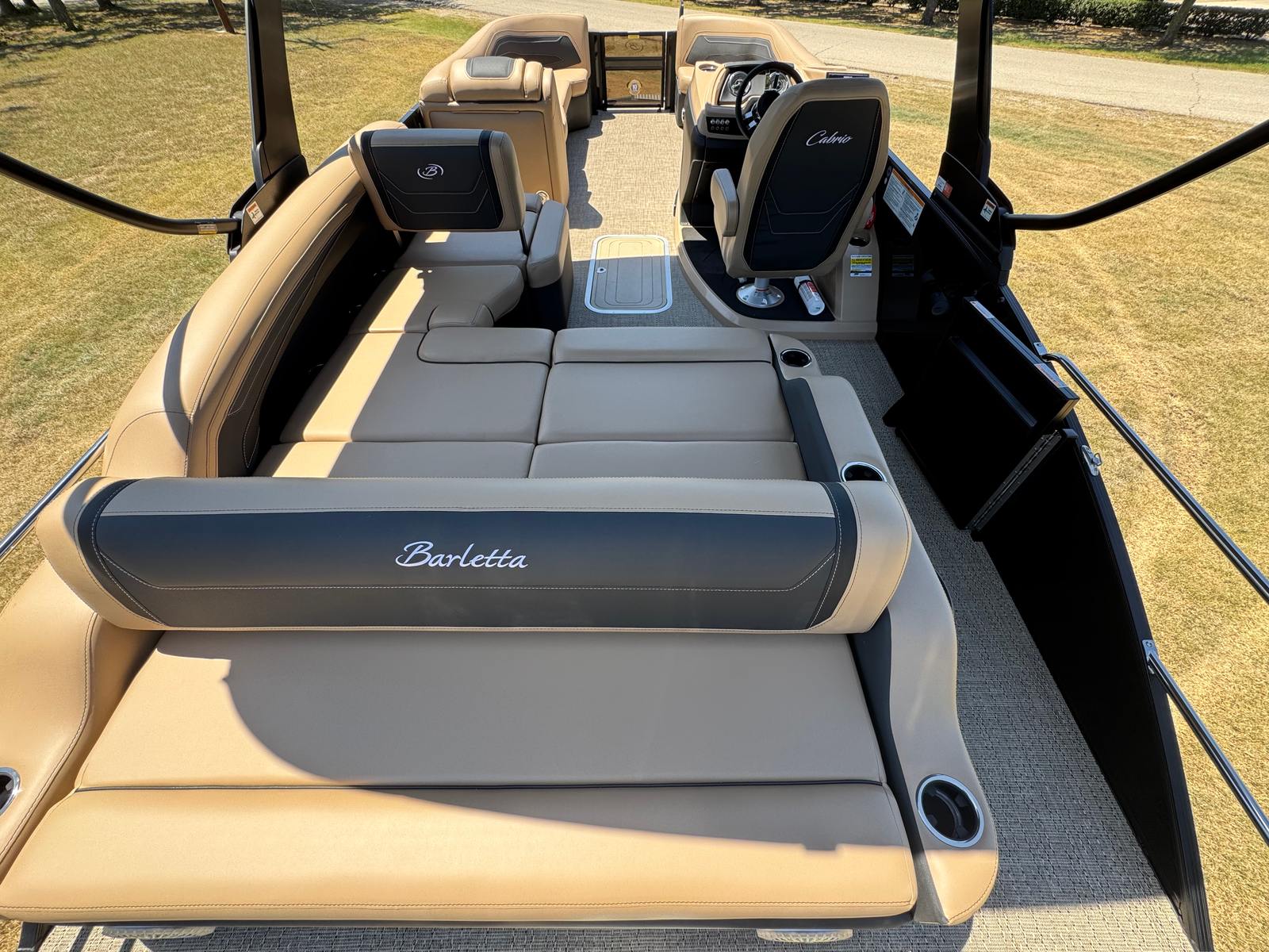 The Barletta Cabrio C24U is packed with special features that elevate your boating experience. The Black Diamond Railskin color and Blackout Package Cabrio create a striking visual impact, while the Carmella Tan with Onyx furniture offers plush comfort and a touch of elegance. The Amore Tan flooring is both stylish and practical, providing a non-slip surface that’s easy to clean. The Triple Toon Package with Midship Storage – Cabrio adds stability and extra storage space, making it easy to stow away gear, water toys, and personal items. Digital gauges provide real-time information at a glance, and the Sport Bimini (installed in place of the standard bimini) offers shade and protection from the sun. The Metal Jacket Protectant helps preserve the boat’s finish, ensuring it looks great season after season.