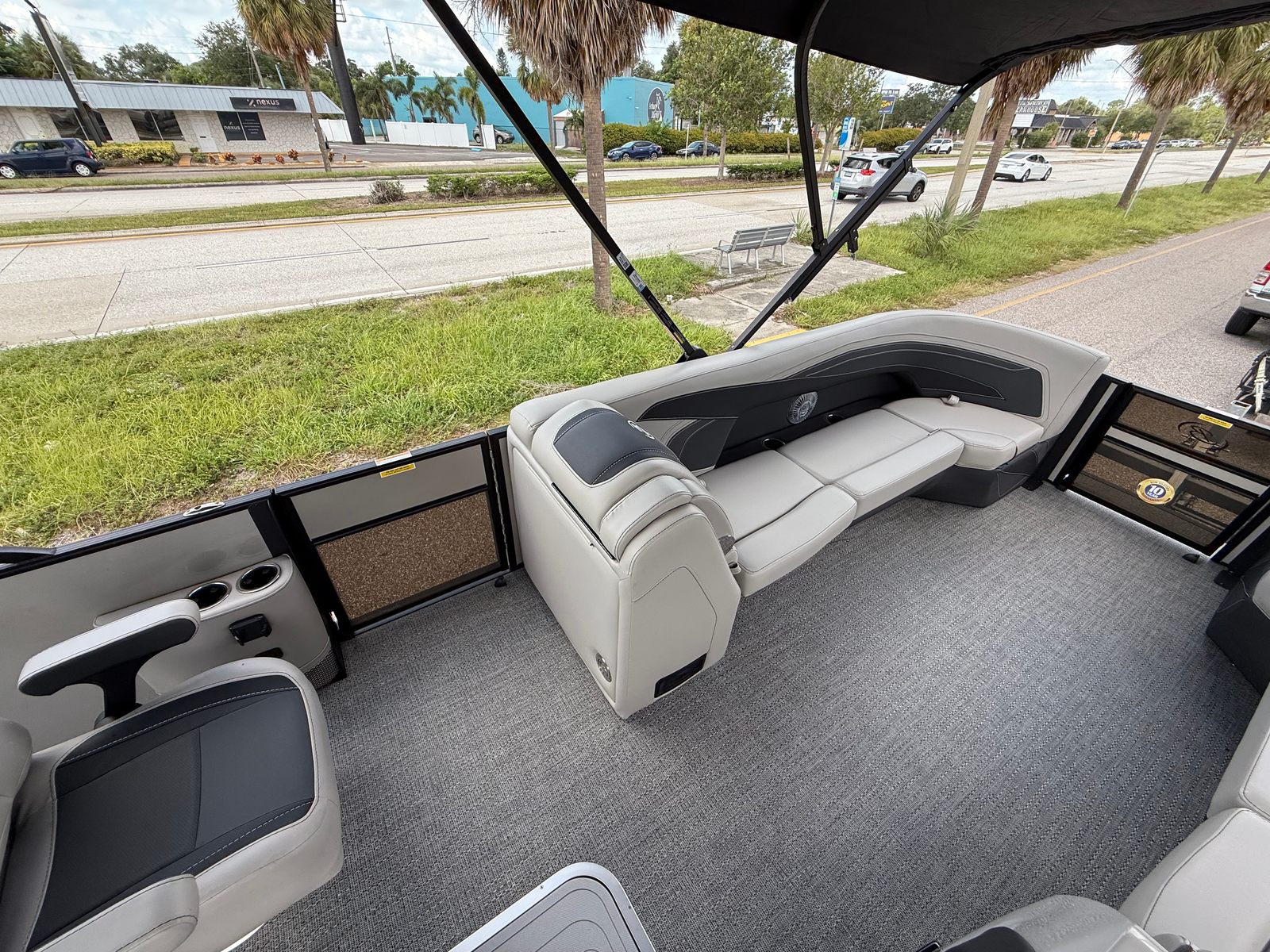 The 2026 Barletta Cabrio C24UC is packed with features designed to maximize comfort, convenience, and enjoyment. The Blackout Package Cabrio adds a bold, contemporary touch to the exterior, while the Coastal Edition Cabrio ensures durability and style in a variety of environments. The Triple Toon Package with midship storage provides enhanced stability and additional space for gear, making it easy to bring along everything you need for a day on the water. The combination of Marquesan Gray/Onyx furniture and Amore Gray flooring not only looks stunning but also offers a plush, comfortable setting for relaxing or entertaining. Digital gauges keep you informed at a glance, while the rigged engine with a stainless steel prop ensures optimal performance and longevity.