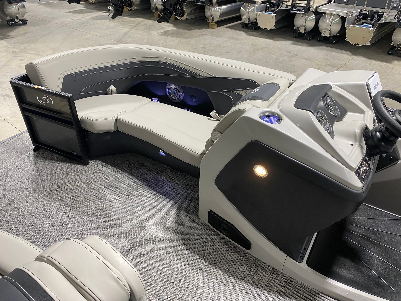 The 2026 Barletta Cabrio C24UE is a standout in the world of pontoons, offering a sleek profile and a generous length of just over 25 feet. This pontoon boat is designed to deliver both style and substance, making it a top contender for those seeking a new pontoon boat for sale. The Cabrio C24UE’s striking Gray Moonstone railskin color, accented by Blue Sapphire, ensures you’ll turn heads at every marina and on every lake. The Blackout Package Cabrio adds a bold, modern touch, while the Marquesan Gray with Onyx furniture and Amore Gray flooring create an inviting and upscale atmosphere onboard.