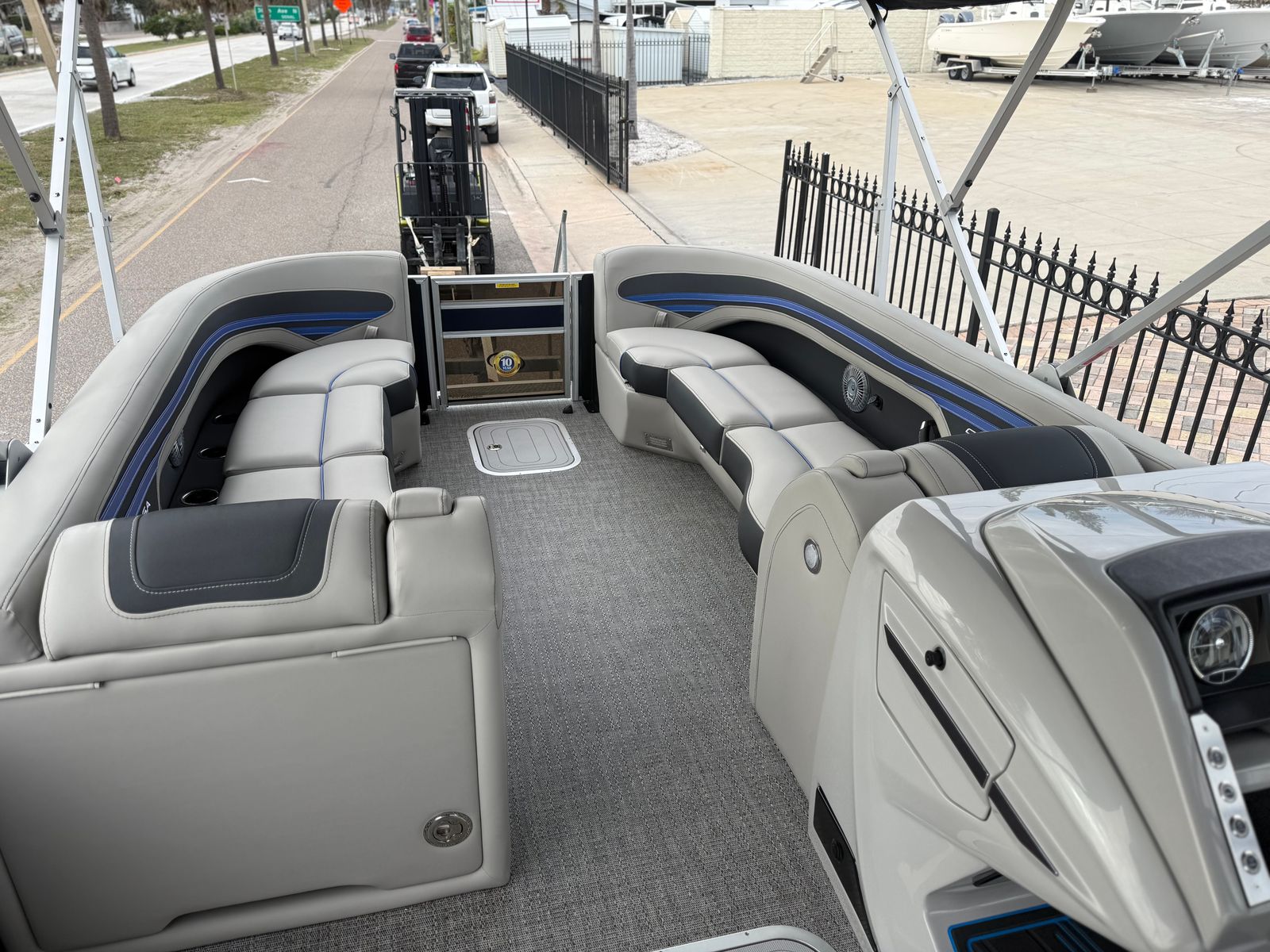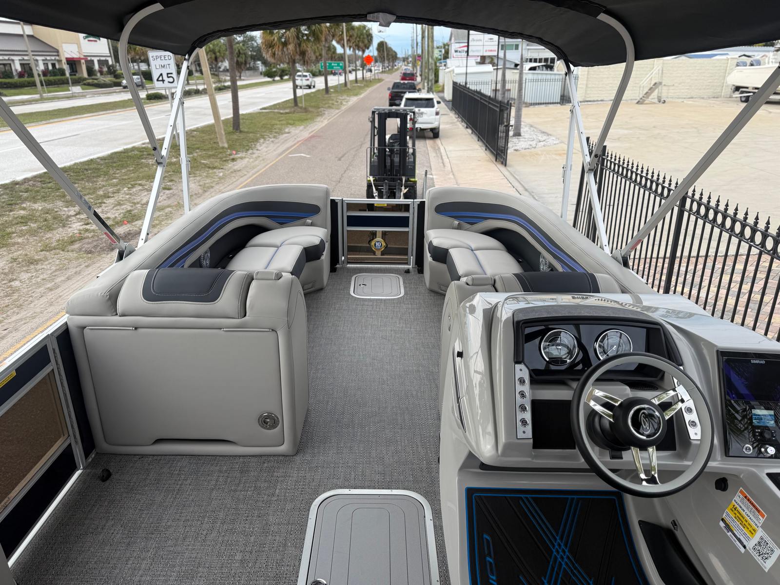 The Barletta Corsa 25UC is designed with practicality in mind, offering features that make ownership easy and enjoyable. The double bimini system provides flexible shade options, allowing you to adapt to changing weather conditions and keep your guests comfortable. The onboard battery charger and dual batteries ensure that your boat is always ready to go, minimizing downtime and maximizing your time on the water.Docking and maneuvering are a breeze thanks to the hydraulic and power assist steering, while the durable flooring and furniture stand up to the rigors of regular use. The digital gauges and Vessel Link connectivity make it simple to monitor your boat’s performance and stay on top of maintenance needs. With its spacious layout and thoughtful design, this pontoon boat is perfect for storing gear, refreshments, and water toys, so you’re always prepared for a day of fun.