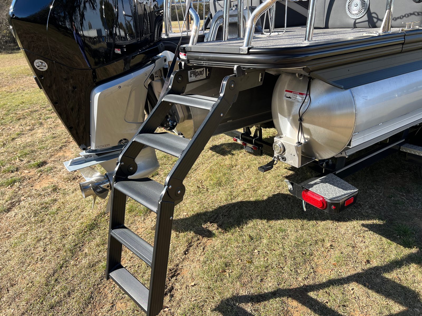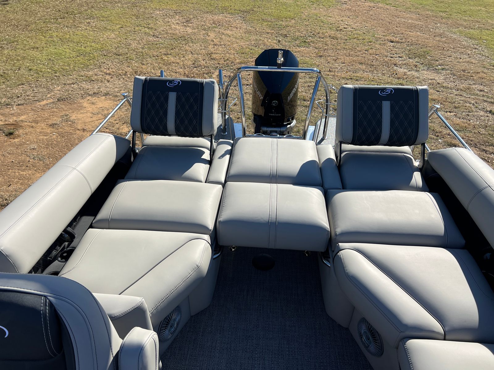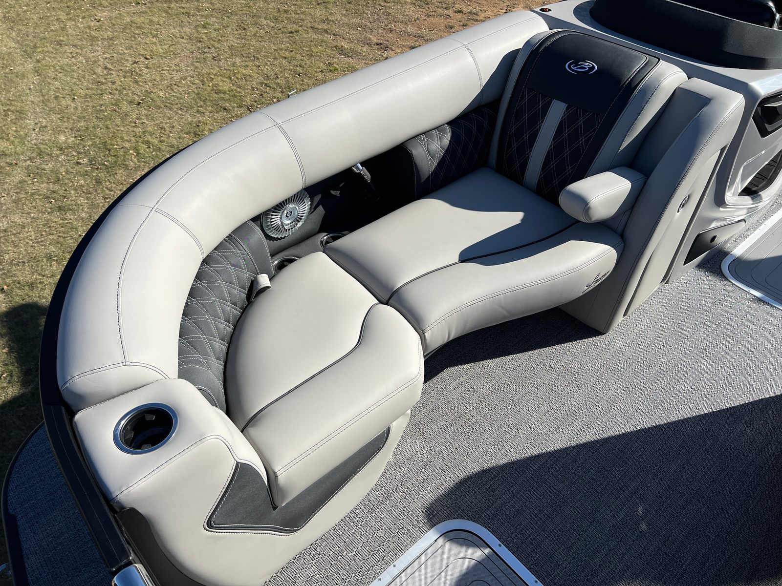 The Barletta Lusso L23M is loaded with features designed to enhance your time on the water. The onboard battery charger with two batteries ensures you have reliable power for all your adventures, while the Metal Jacket Protectant keeps your pontoon looking pristine season after season. The thoughtfully selected Marquesan Gray with Onyx furniture provides plush, supportive seating, perfect for lounging or entertaining guests. The Amore Gray flooring is both stylish and practical, offering a comfortable, slip-resistant surface that is easy to maintain. The Blackout Package Lusso railskin not only adds visual appeal but also offers added protection and durability. The Mercury Digital DTS Pre-Rig and Vessel Link system streamline engine management, giving you intuitive control and peace of mind. Hydraulic and power assist steering, along with digital gauges, ensure a smooth and responsive ride, while the stainless steel prop enhances performance and longevity.