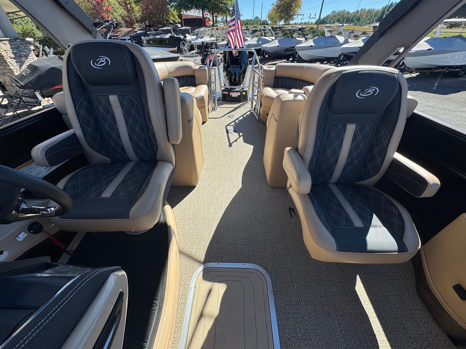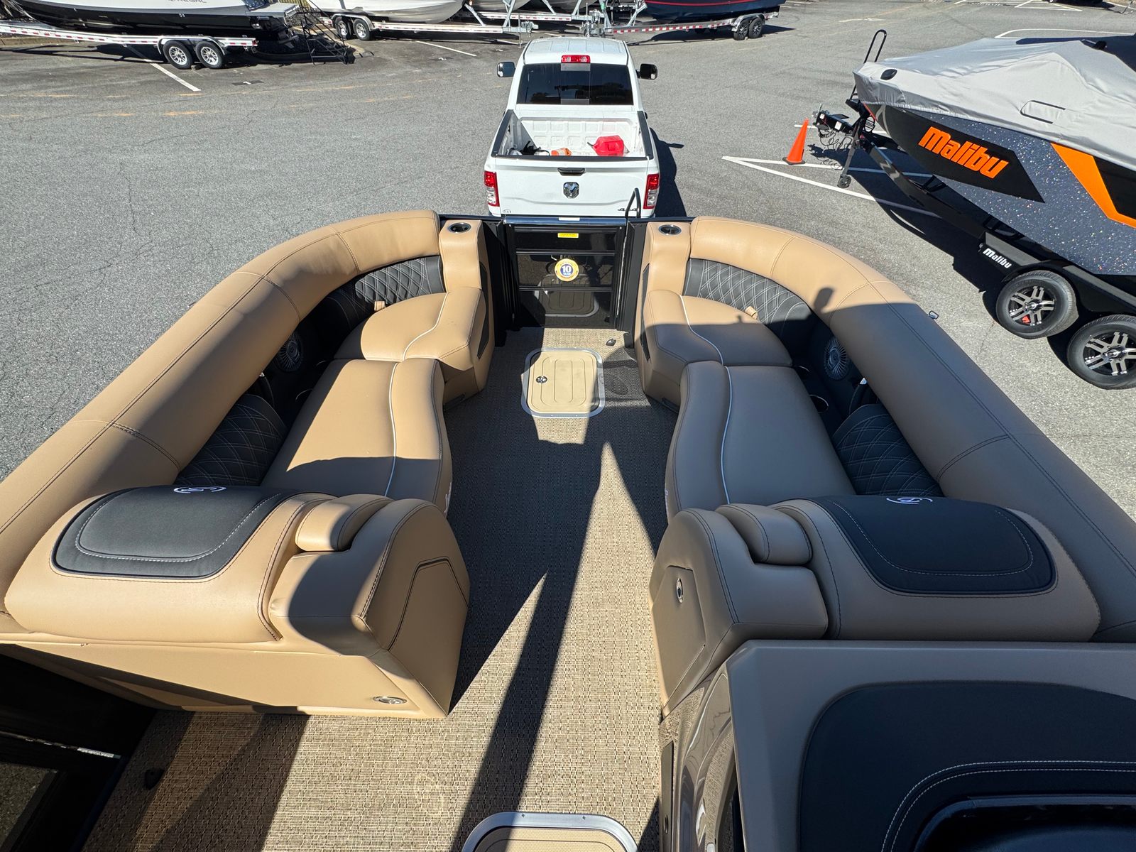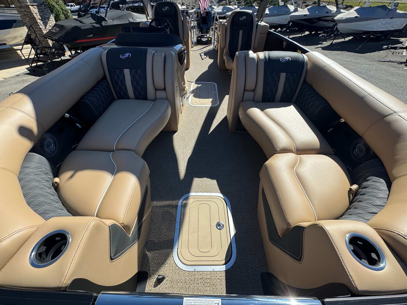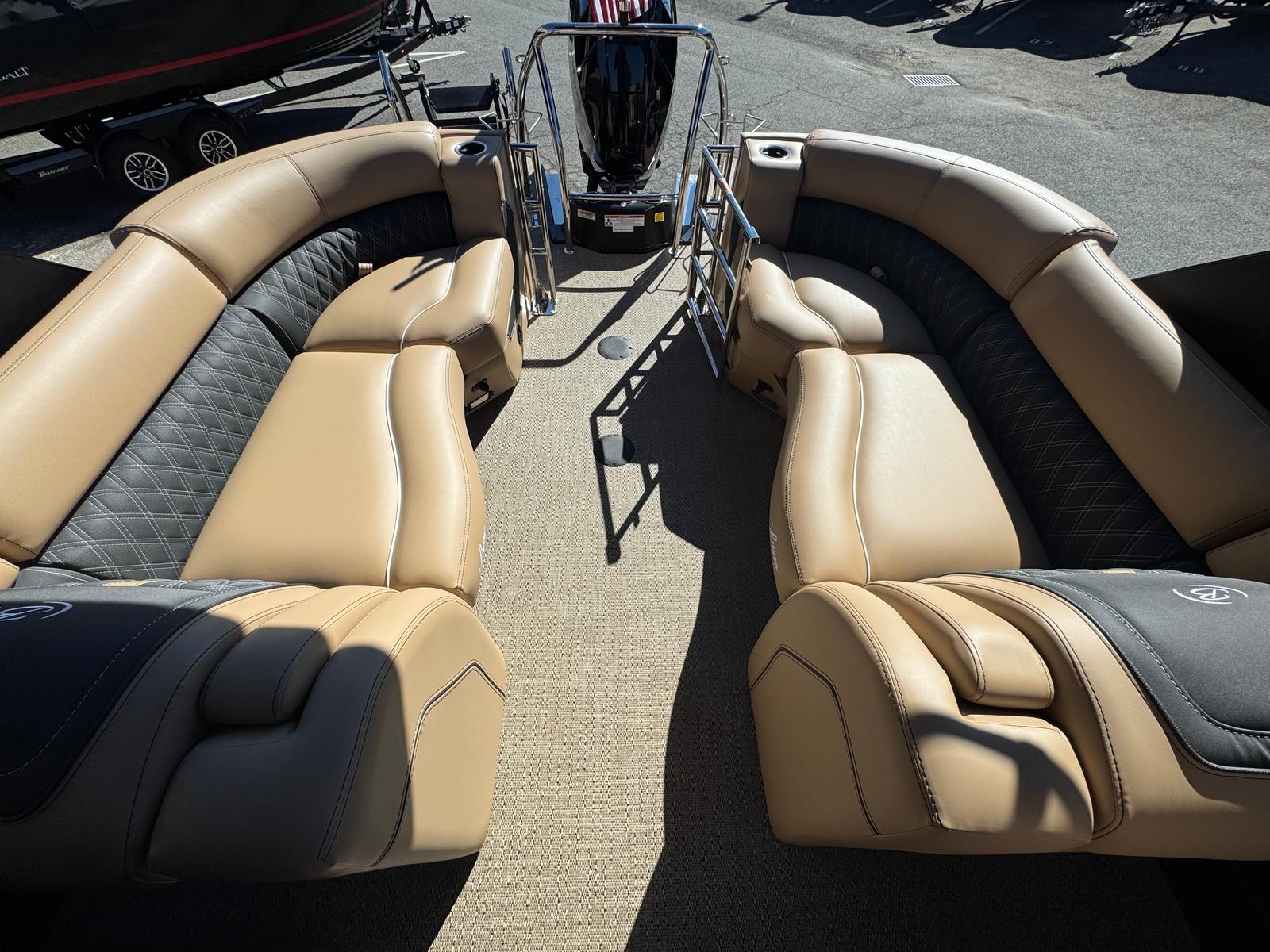 The Barletta Lusso L23QCSSA is loaded with features that enhance both its aesthetics and functionality. The Amore Tan flooring offers a warm, inviting look while providing durability and easy maintenance. The Blackout Package Lusso railskin adds a bold, contemporary edge, perfectly complemented by the Black Diamond accent and sweep colors. The Carmella Tan with Onyx furniture delivers plush comfort and sophisticated style, creating a welcoming environment for you and your guests.For those who appreciate ambiance, the exterior white underdeck and underwater lighting set the mood for evening cruises and dockside gatherings. The 2-bank battery charger ensures your boat is always ready for action, keeping your electronics and accessories powered up for every adventure.