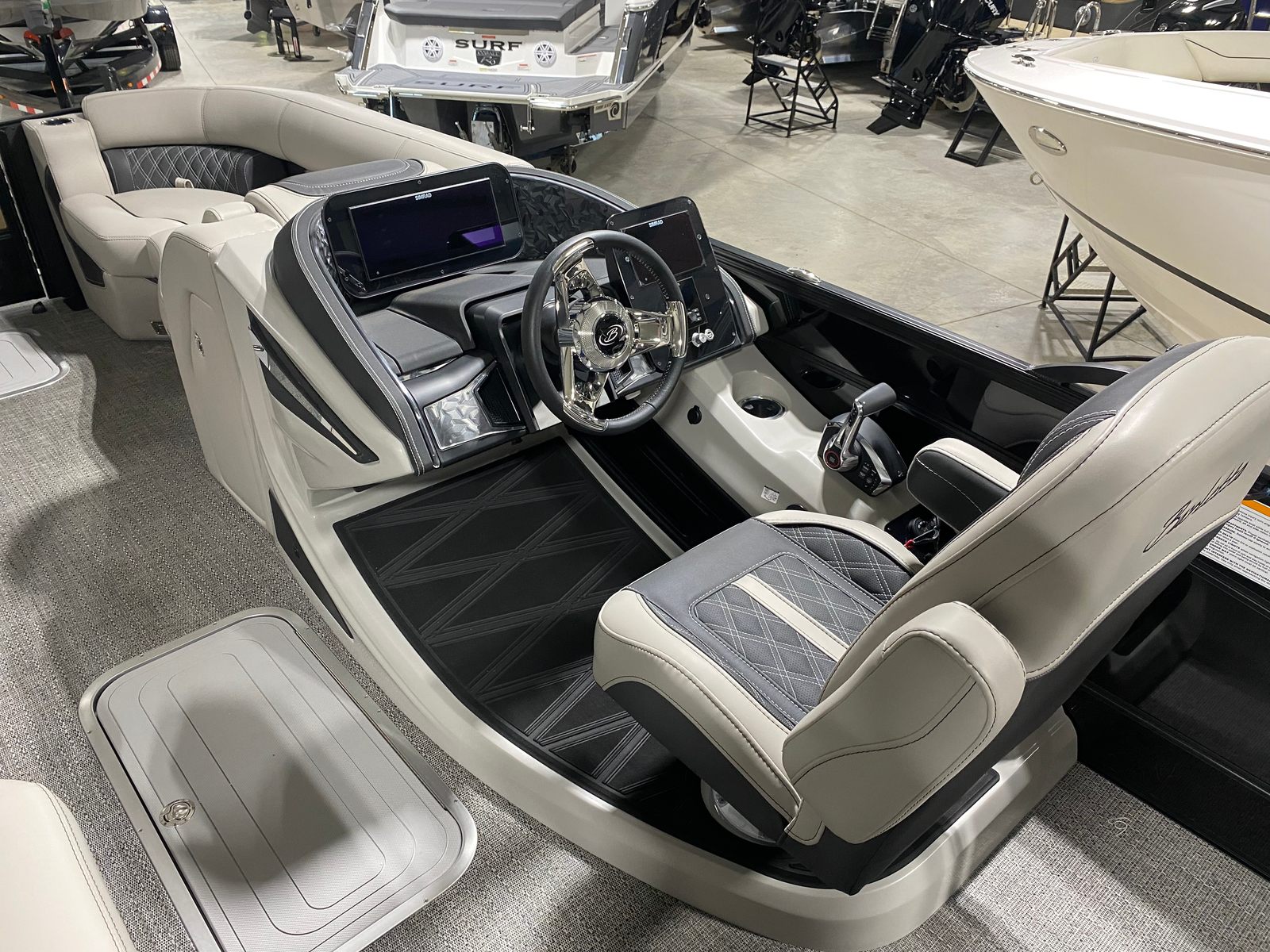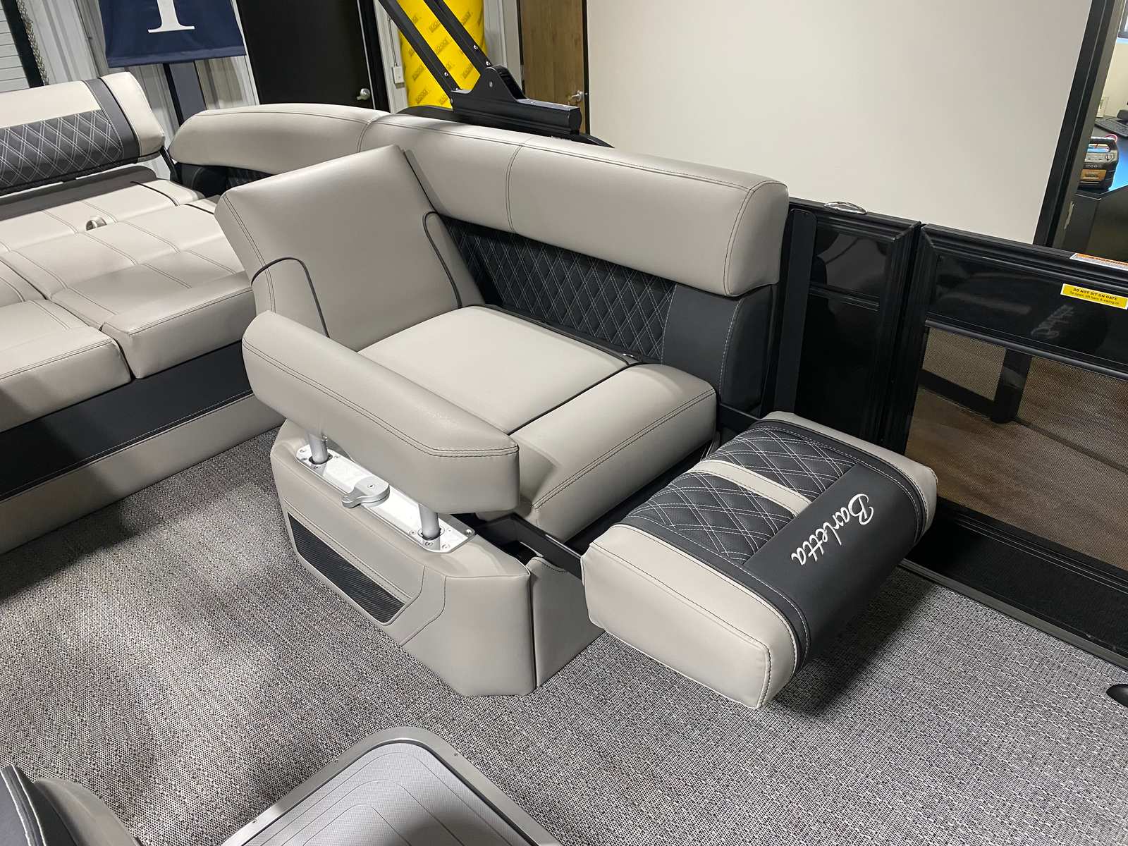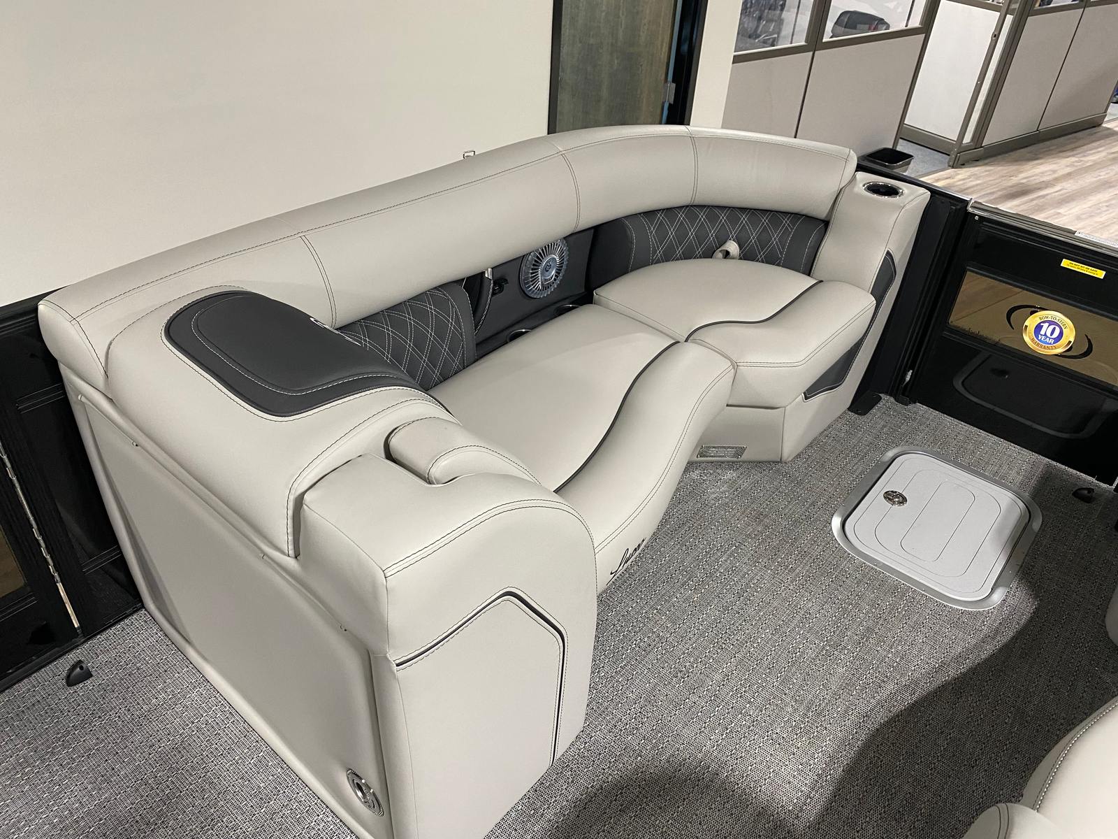 The Lusso L23U is packed with premium features that set it apart from other pontoon boats for sale. The Black Diamond sweep and accent colors, complemented by the Blackout Package Lusso, create a bold and modern exterior. Inside, the Marquesan Gray/Onyx furniture offers plush seating and a contemporary look, while the Amore Gray flooring adds a touch of elegance and durability. The Mercury Digital DTS Pre-Rig ensures compatibility with advanced VERADO engines, providing state-of-the-art digital controls and Vessel Link connectivity for enhanced monitoring and diagnostics.Steering is a breeze thanks to hydraulic and power assist systems, making every outing enjoyable and stress-free. Digital gauges keep you informed of vital engine metrics, while the rigged engine with a stainless steel prop maximizes efficiency and longevity. Exterior lighting, including white underdeck and underwater illumination, enhances safety and ambiance during evening cruises or dockside gatherings. These features combine to deliver a pontoon boat that’s as functional as it is stylish.