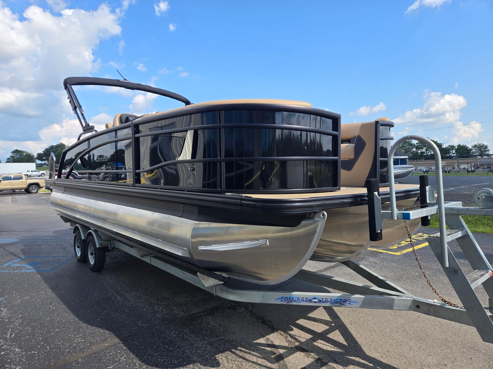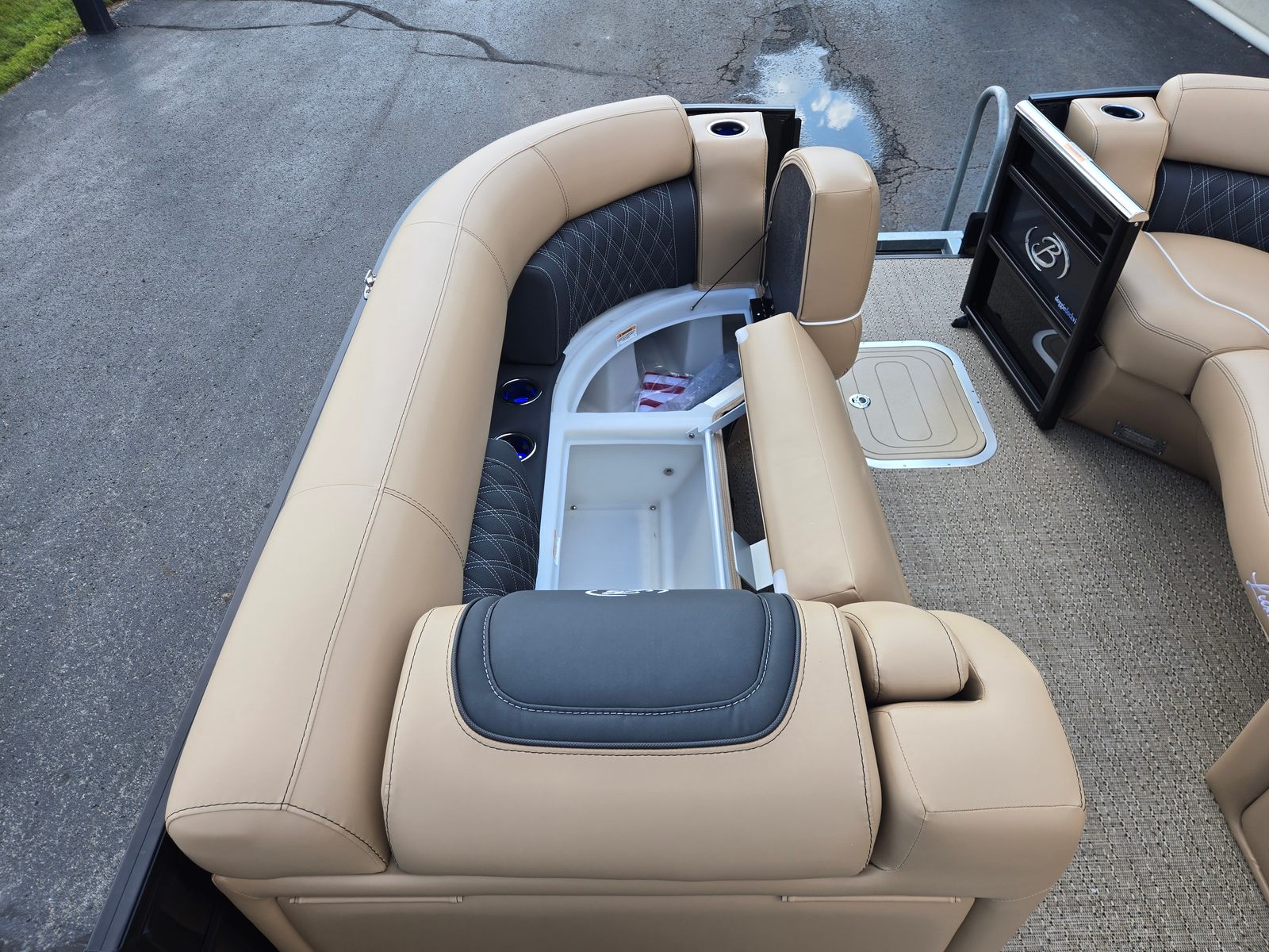 The 2026 Barletta Lusso L23UC is loaded with features designed to enhance your time on the water. The Blackout Package Lusso Railskin gives the exterior a bold, modern look, while the Black Diamond color scheme adds a touch of sophistication. Inside, the Carmella Tan with Onyx furniture offers plush seating and ergonomic support, ensuring comfort for all passengers. The Amore Tan flooring is both stylish and practical, providing a non-slip surface that’s easy to maintain.For those who appreciate advanced technology, the Lusso L23UC comes equipped with Mercury Digital DTS Pre-Rig for VERADO engines with Vessel Link, allowing for intuitive engine management and connectivity. The hydraulic and power assist steering makes docking and navigating tight spaces a breeze, while digital gauges provide clear, accurate information at a glance. Exterior lighting, including white underdeck and underwater lights, not only enhances the boat’s appearance but also improves visibility and safety during evening cruises.