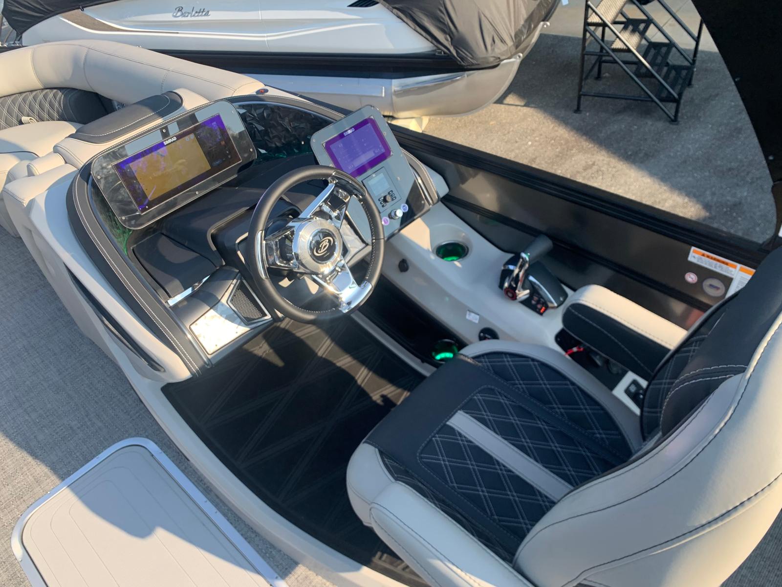 Step aboard and discover a world of comfort and convenience. The Amore Gray flooring offers a modern, easy-to-clean surface that complements the Marquesan Gray with Onyx furniture, creating a sophisticated and inviting atmosphere. The Sport Bimini canvas, installed in place of the standard bimini, provides ample shade and protection from the sun, allowing you to relax in comfort during long days on the water.Digital gauges keep you informed with real-time data, enhancing safety and convenience. The rigging features a stainless steel prop for durability and optimal performance. Exterior lighting, including white underdeck and underwater lights, adds a touch of elegance and ensures visibility during evening cruises. The Blackout Package Lusso railskin delivers a bold, contemporary look, while the Gray Moonstone sweep and accent colors tie the entire aesthetic together for a truly striking appearance.