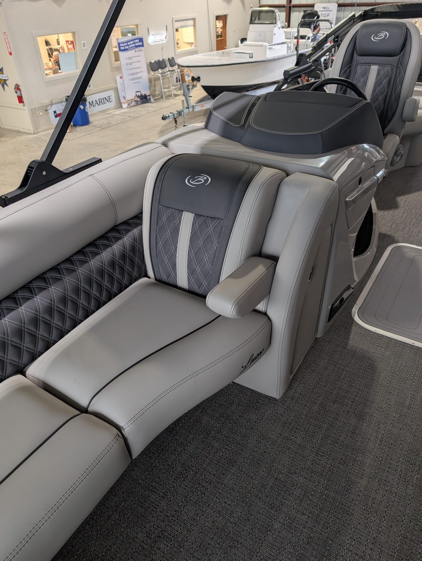 The Barletta Lusso L25M is packed with premium features that set it apart from other pontoon boats for sale. Step aboard and you’ll immediately notice the Amore Gray flooring, which provides a sophisticated foundation for the entire vessel. The interior is equally impressive, featuring Marquesan Gray furniture with Charcoal accents and a Matte Black accent color for a modern, upscale look.The captain’s chair at the helm is equipped with an adjustable pedestal, ensuring optimal comfort and visibility for the driver. Entertaining guests is a breeze thanks to the interior table, pedestal, and base, complete with Yeti-ready cupholders for your favorite beverages. Exterior lighting, including white underdeck and underwater lights, adds a dramatic flair for evening cruises and enhances safety after sunset.The Lusso L25M’s sweep color in Gray Moonstone complements its overall aesthetic, while the rigging and pre-rigging for the Mercury V10 engine ensure seamless integration and reliable performance. Every detail has been thoughtfully designed to maximize comfort, convenience, and enjoyment on the water.