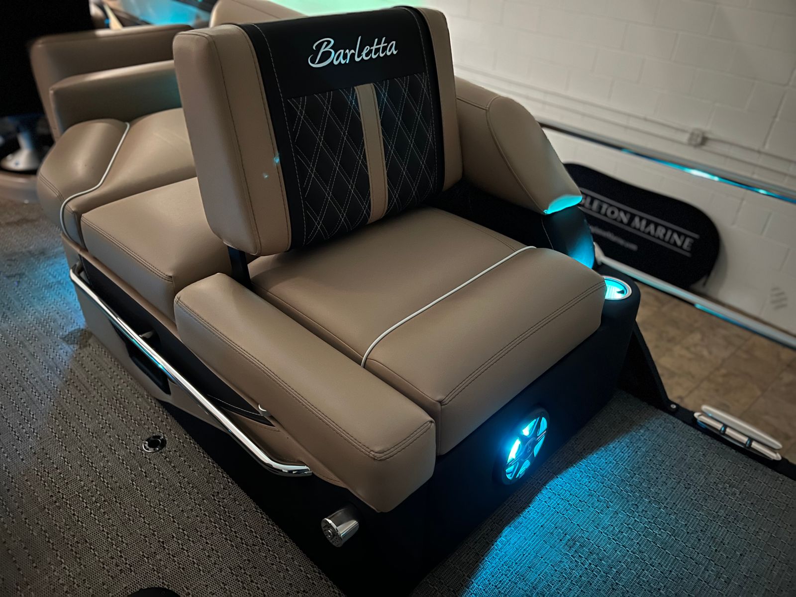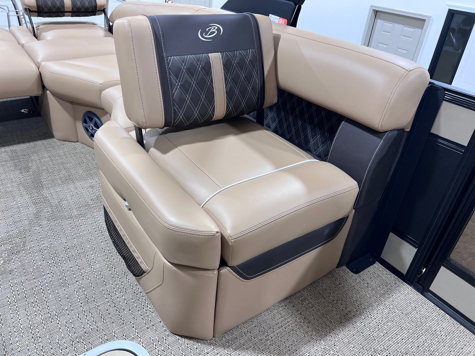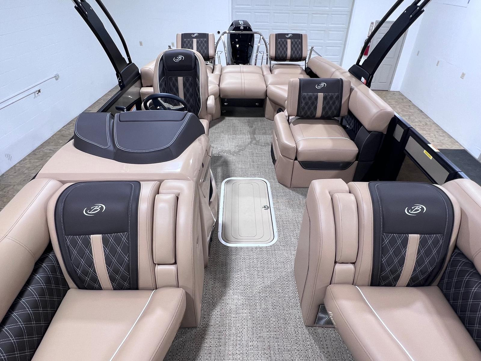 The Barletta Lusso L25M is packed with premium features designed to enhance your boating experience. The Champagne sweep color and Matte Black accent create a sophisticated exterior, while the Blackout Package Lusso railskin adds a sleek, modern flair. Step aboard and you are greeted by Carmella Tan with Bison furniture, offering plush comfort and a refined aesthetic. The Amore Tan flooring not only looks stunning but is also durable and easy to maintain, making it ideal for both relaxing and entertaining.This pontoon boat also comes equipped with a Metal Jacket Protectant, ensuring long-lasting protection against the elements and preserving the boat’s pristine appearance. The Aft Gate (Divider) for Lusso Meridian adds an extra layer of convenience and safety, making it easy to manage access and create separate spaces for different activities on board.