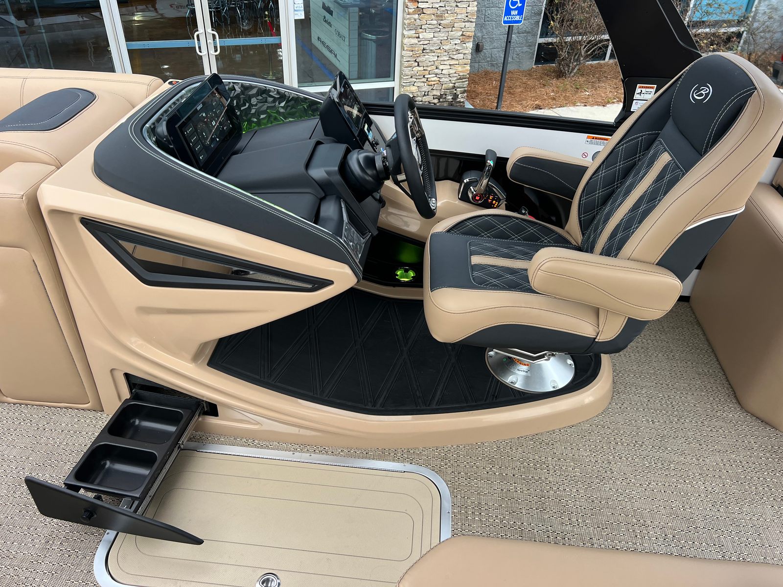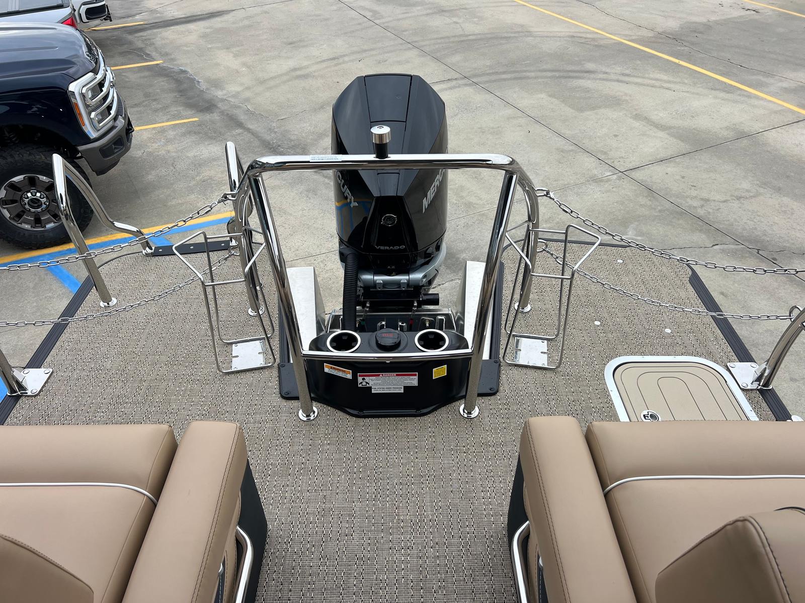 The Barletta Lusso L25M is packed with premium features designed to elevate your boating experience. The striking Winter White sweep color and Black Diamond accents create a modern, eye-catching look, while the Blackout Package Lusso railskin adds a touch of sophistication. The Carmella Tan with Onyx furniture provides plush, supportive seating, and the Amore Tan flooring is both stylish and easy to maintain. The Sport Bimini, installed in place of the standard bimini, offers superior shade and protection from the sun, allowing you to relax in comfort during long days on the water. The on-board battery charger with two batteries ensures you have reliable power for all your adventures, while the Mercury Digital DTS Pre-Rig for VERADO and stainless steel prop deliver optimal performance and control.