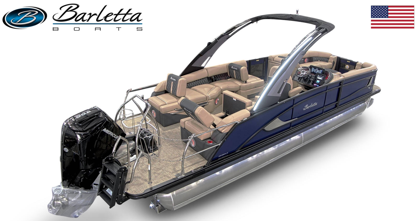 The 2026 Barletta Lusso L25MA is meticulously crafted to provide both comfort and style. The Bohemian Blue sweep and accent colors create a striking visual appeal, while the Blackout Package Lusso railskin adds a touch of modern elegance. Step aboard and you are greeted by luxurious Carmella Tan furniture with Onyx accents, offering plush seating and a refined atmosphere for all your guests. The Amore Tan flooring is both stylish and practical, providing a comfortable and durable surface underfoot.For those who appreciate ambiance, the Lusso L25MA features white underdeck and underwater exterior lighting, setting the perfect mood for evening cruises or dockside gatherings. Every detail, from the premium upholstery to the advanced Mercury Digital Pre-Rig for V10, is designed to enhance your boating experience and ensure you travel in ultimate comfort and style.