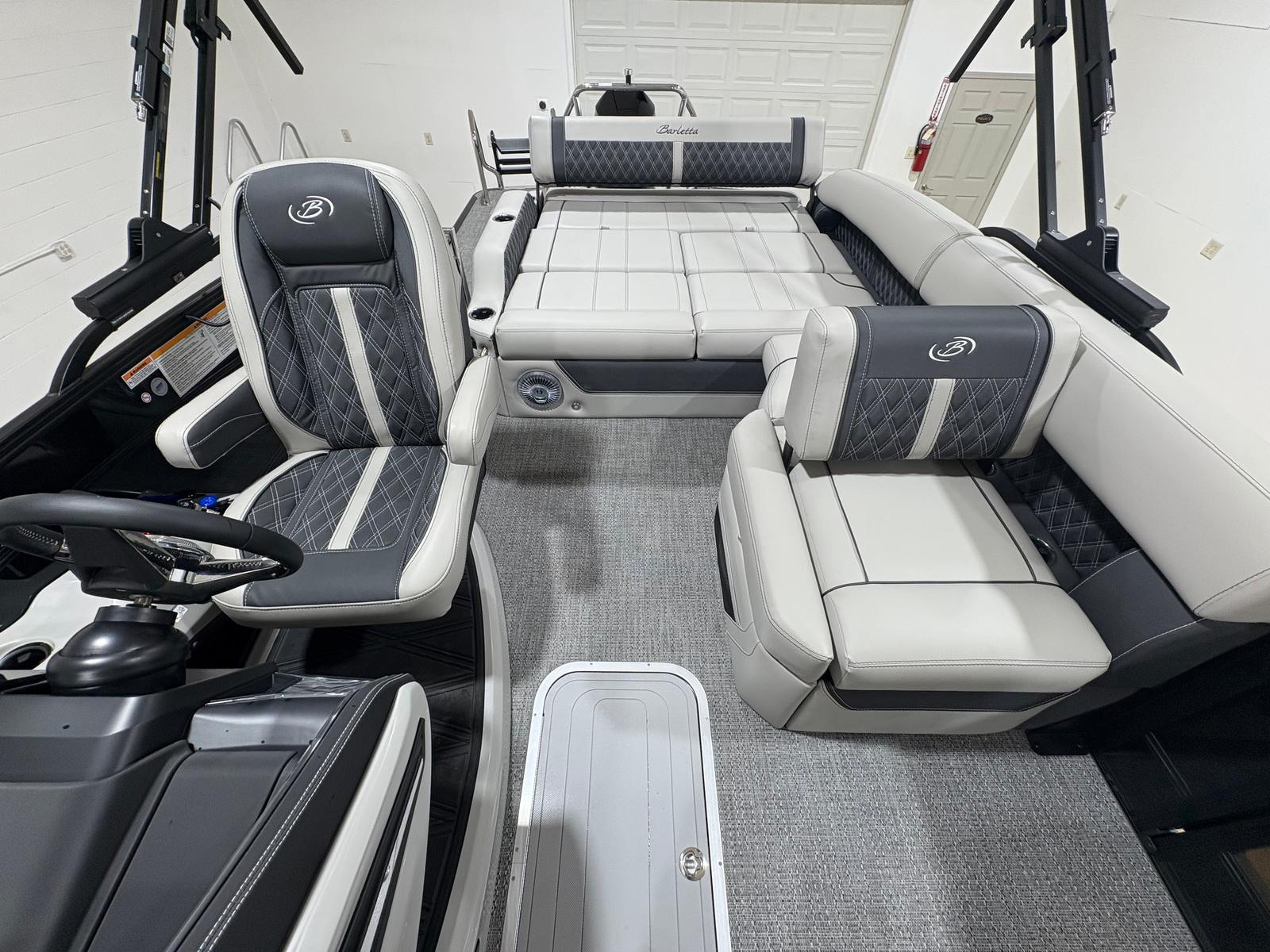 The Barletta Lusso L25U is as practical as it is beautiful. Its generous length provides ample storage for gear, water toys, and personal items, keeping the deck clutter-free and organized. The sturdy construction and reliable Mercury engine ensure peace of mind during every outing. Docking is simplified thanks to the responsive steering and power assist features, making it easy to navigate tight spaces or busy marinas. The efficient engine and digital controls contribute to fuel savings, allowing you to spend more time on the water and less at the pump. Exterior lighting enhances safety and visibility, making evening adventures both enjoyable and secure.