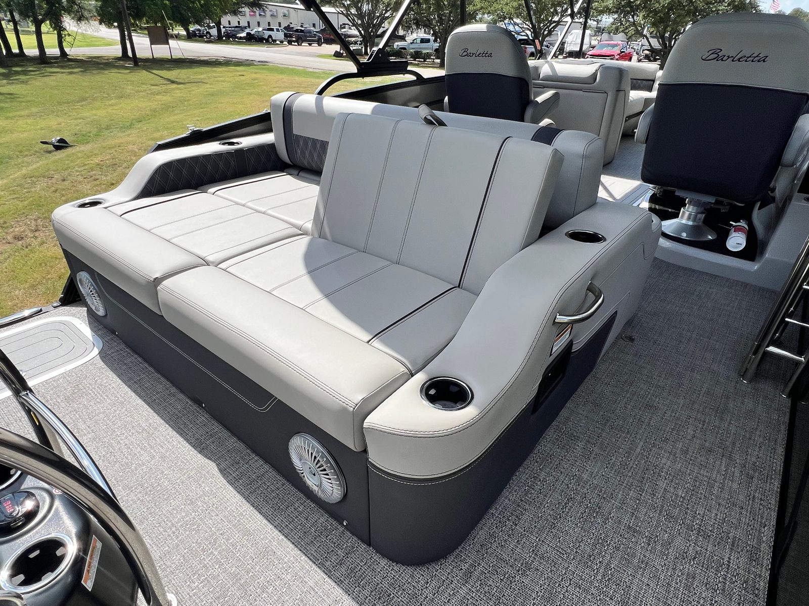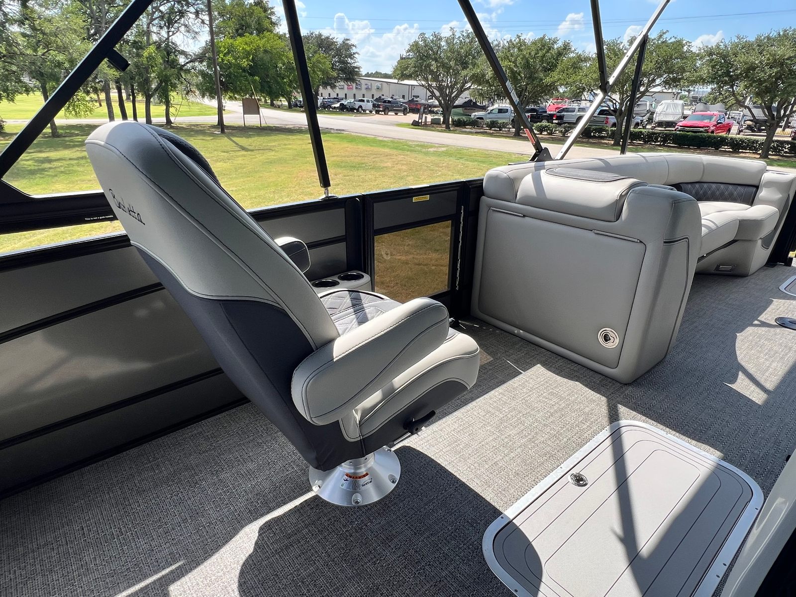 The 2025 Barletta Lusso L25UC is loaded with special features that enhance both comfort and convenience. Step inside and you will find a beautifully appointed interior, featuring a table with a pedestal and base, complete with Yeti-ready cupholders—perfect for keeping your favorite beverages secure while you relax or entertain. The furniture is finished in a sophisticated Marquesan Gray with Charcoal Accent, complemented by Amore Gray flooring that is both stylish and easy to maintain.For those who appreciate versatility and shade, the Lusso L25UC comes equipped with a double bimini, including an additional power bimini for effortless adjustment. The Blackout Package Lusso adds a bold, modern touch to the railskin, while the Metal Jacket Protectant on the exterior ensures your pontoon boat stays looking pristine season after season. The captain’s chair features an adjustable pedestal, providing customized comfort for long days on the water.