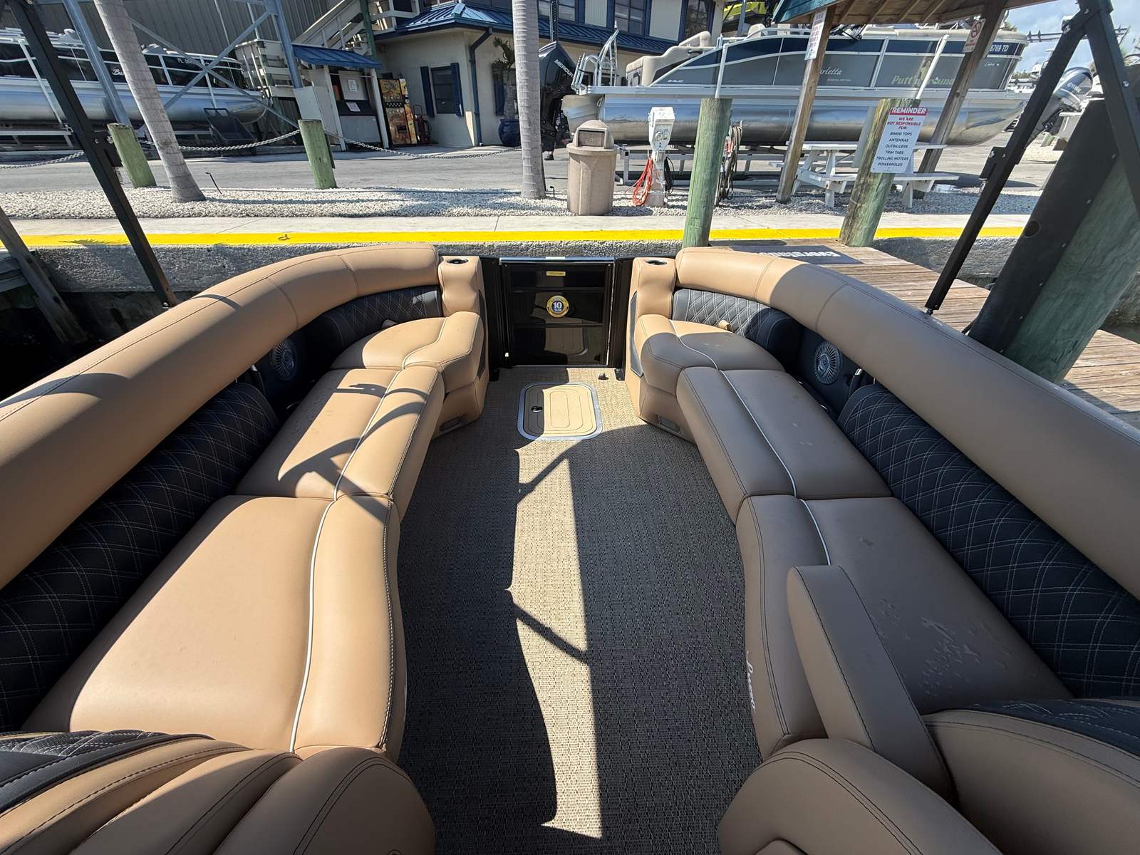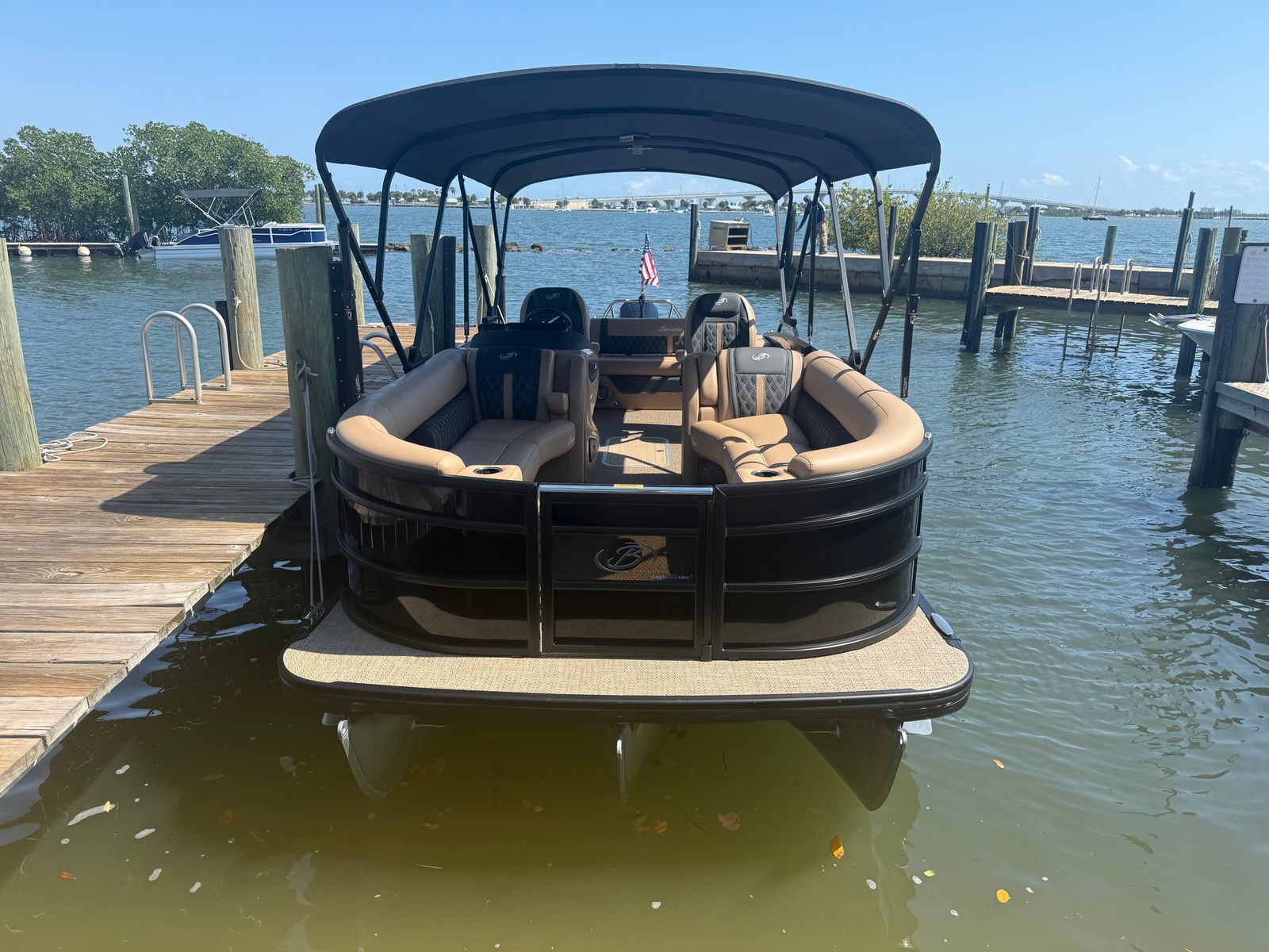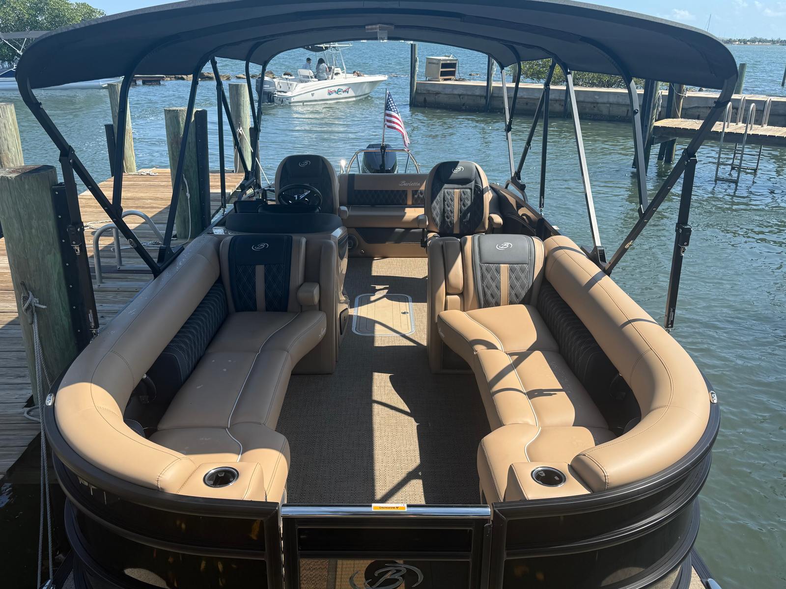 The 2026 Barletta Lusso L25UC is loaded with special features designed to elevate your boating experience. The Black Diamond sweep and accent colors, paired with the Lusso Blackout Package, give this pontoon a striking and contemporary look that turns heads wherever you go. The Carmella Tan with Onyx furniture provides plush, supportive seating for you and your guests, while the Amore Tan flooring adds a touch of warmth and elegance underfoot. The Lusso Coastal Edition ensures that this pontoon is ready for a variety of water conditions, making it a versatile choice for any adventure. The double bimini canvas offers ample shade and protection from the sun, allowing you to enjoy long days on the water in comfort.