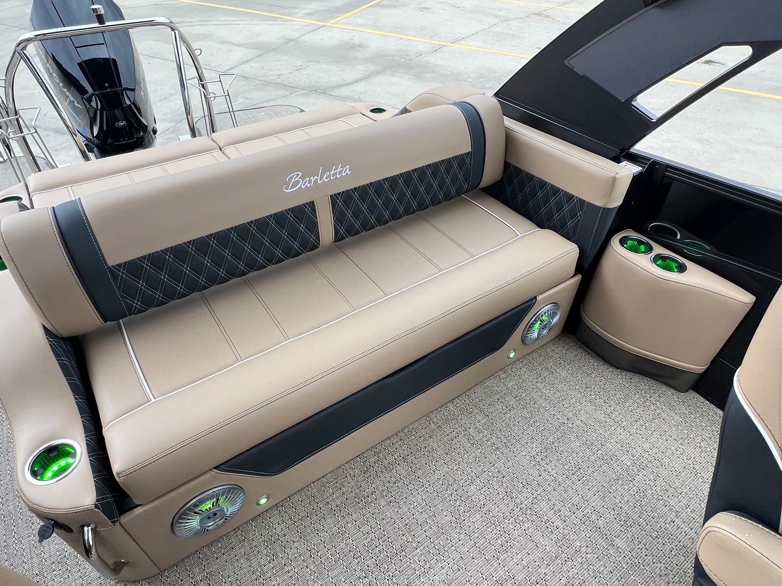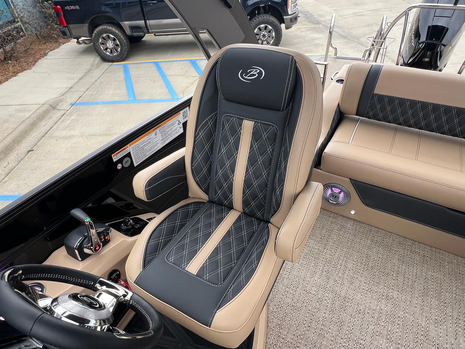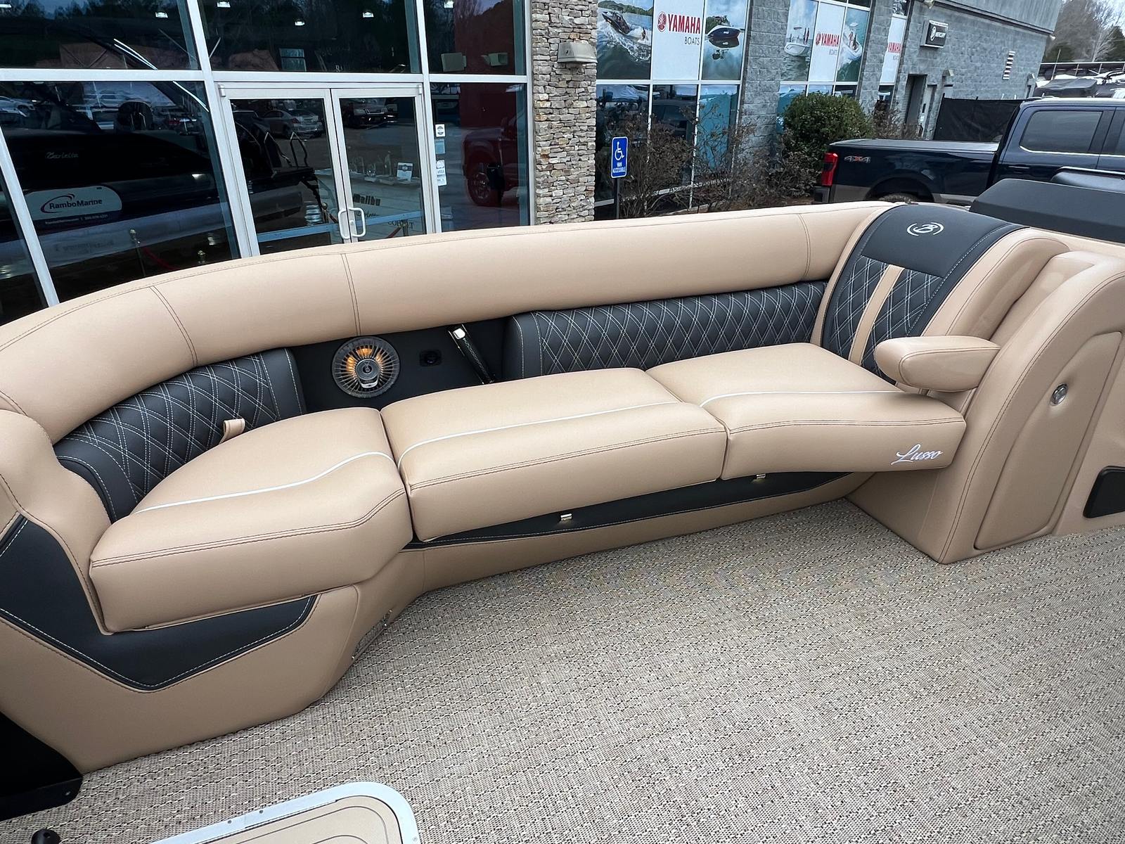 The 2026 Barletta Lusso L25UCA is packed with special features that enhance both comfort and convenience. The Blackout Package Lusso railskin adds a modern, sophisticated edge to the boat’s exterior, while the Black Diamond sweep and accent colors create a striking visual statement. Inside, the Carmella Tan with Onyx furniture offers plush seating and a refined look, perfectly complemented by the Amore Tan flooring for a cohesive and stylish interior.This pontoon boat is also equipped with an on-board battery charger for two batteries, ensuring you have reliable power for all your electronics and accessories. The Metal Jacket Protectant provides an extra layer of durability, helping to keep your boat looking pristine season after season. Every detail of the Lusso L25UCA is designed to provide a premium boating experience, making it a standout choice for those seeking a Barletta boat for sale.