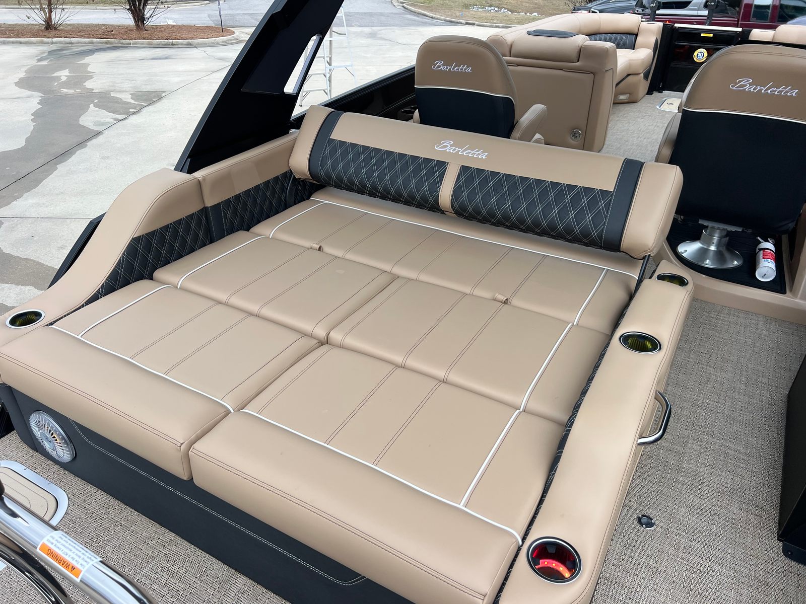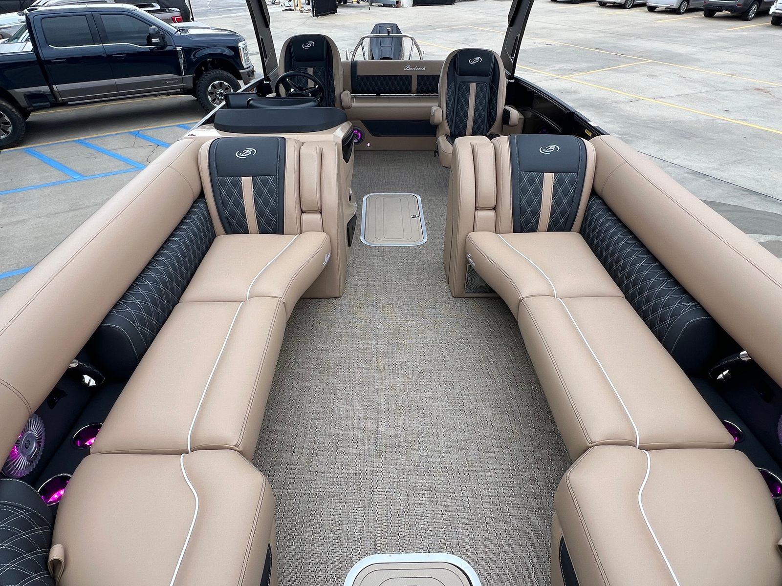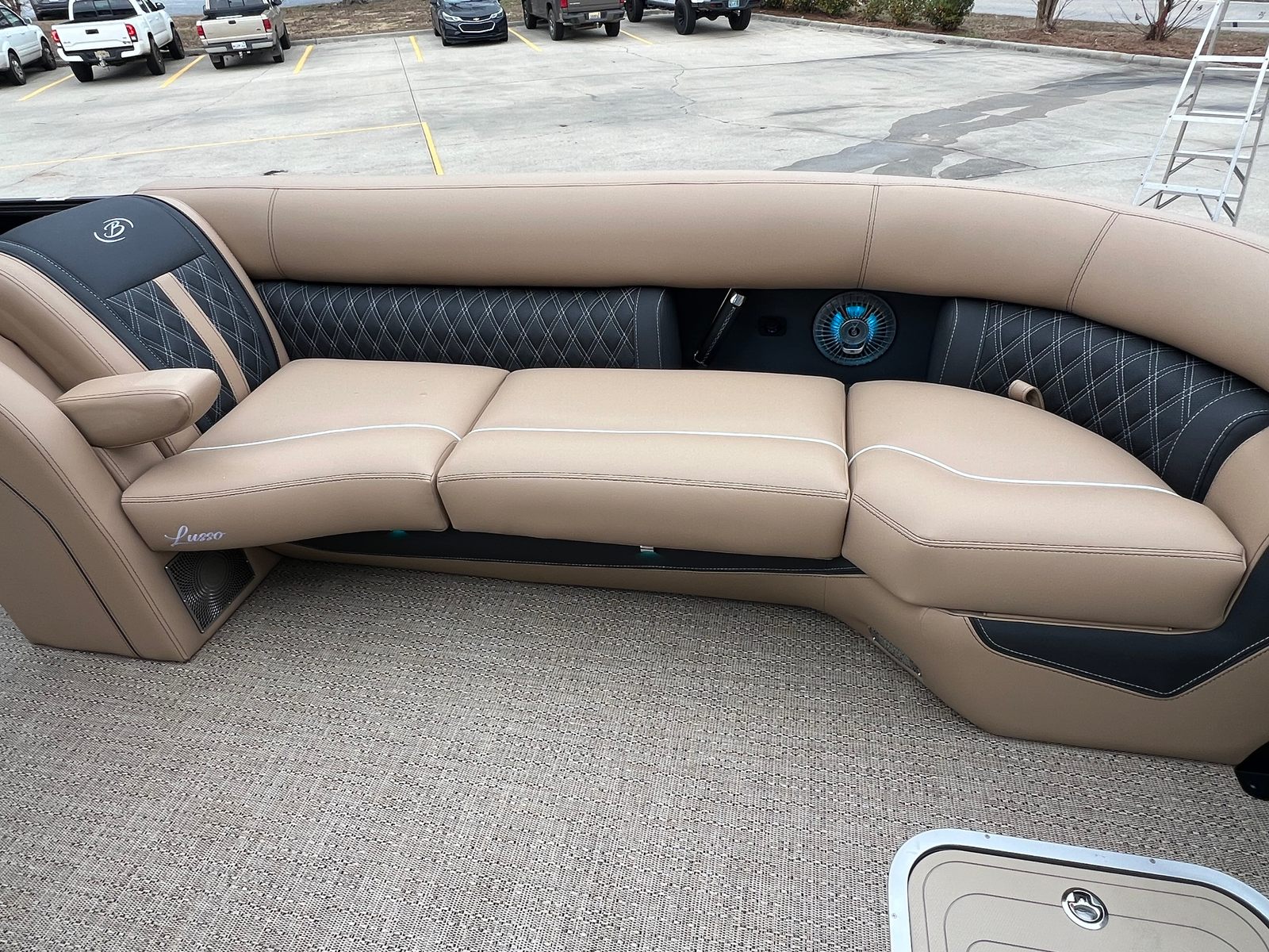 The 2026 Barletta Lusso L25UCA is packed with special features that enhance both comfort and convenience. The Blackout Package Lusso railskin adds a modern, sophisticated edge to the boat’s exterior, while the Black Diamond sweep and accent colors create a striking visual statement. Inside, the Carmella Tan with Onyx furniture offers plush seating and a refined look, perfectly complemented by the Amore Tan flooring for a cohesive and stylish interior.This pontoon boat is also equipped with an on-board battery charger for two batteries, ensuring you have reliable power for all your electronics and accessories. The Metal Jacket Protectant provides an extra layer of durability, helping to keep your boat looking pristine season after season. Every detail of the Lusso L25UCA is designed to provide a premium boating experience, making it a standout choice for those seeking a Barletta boat for sale.