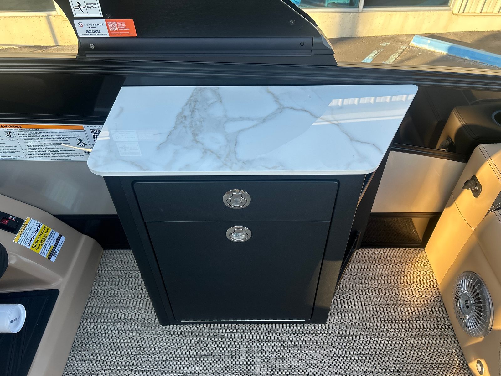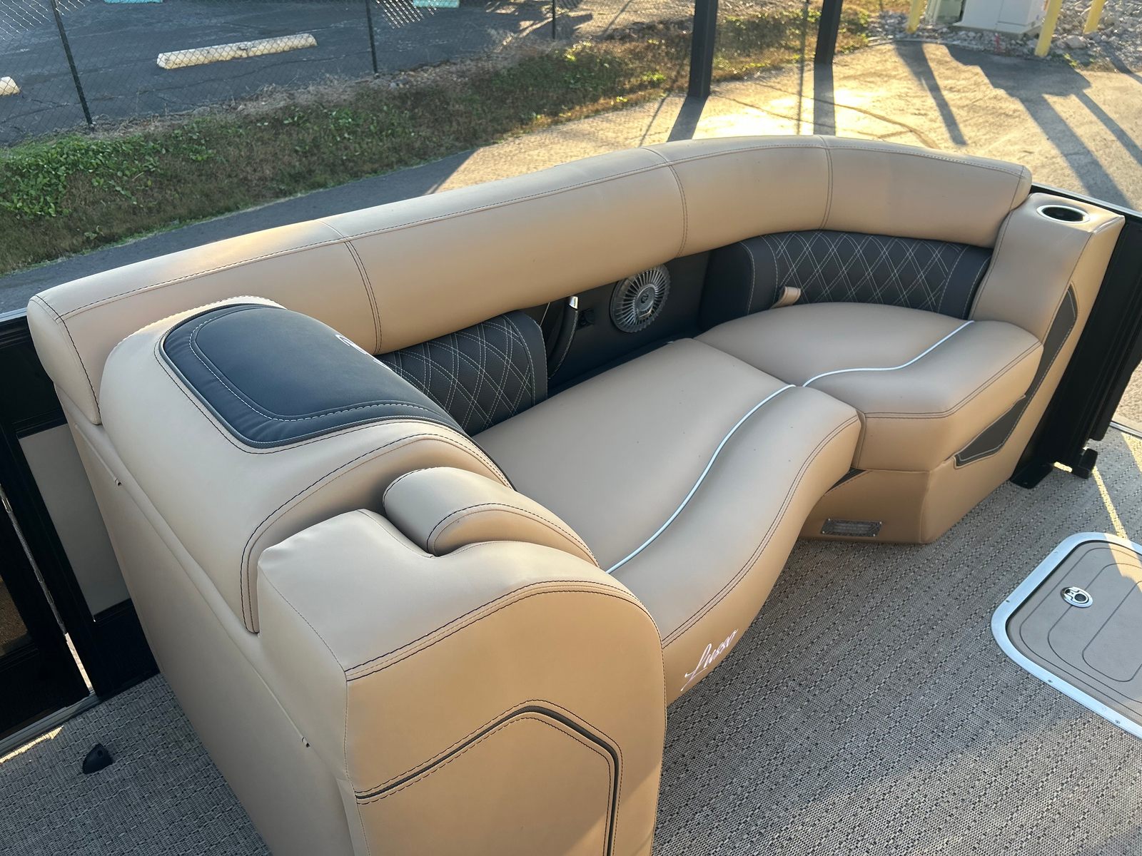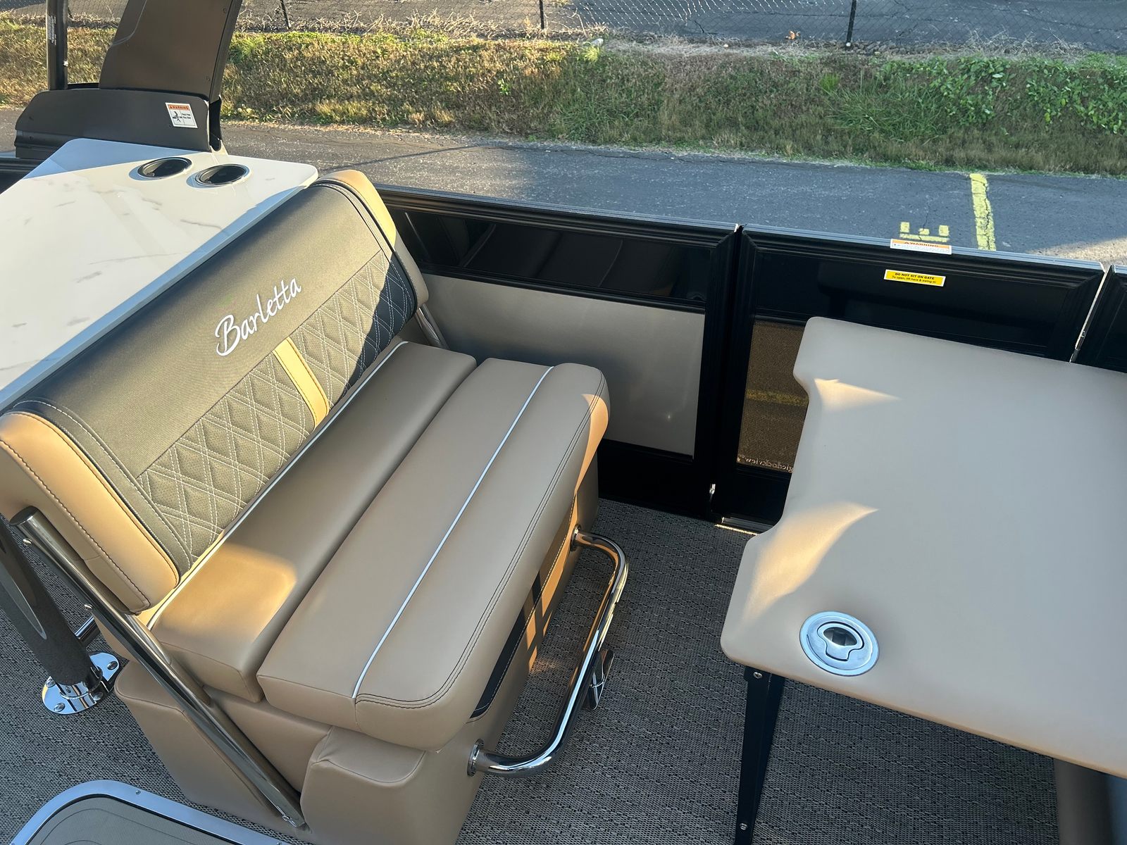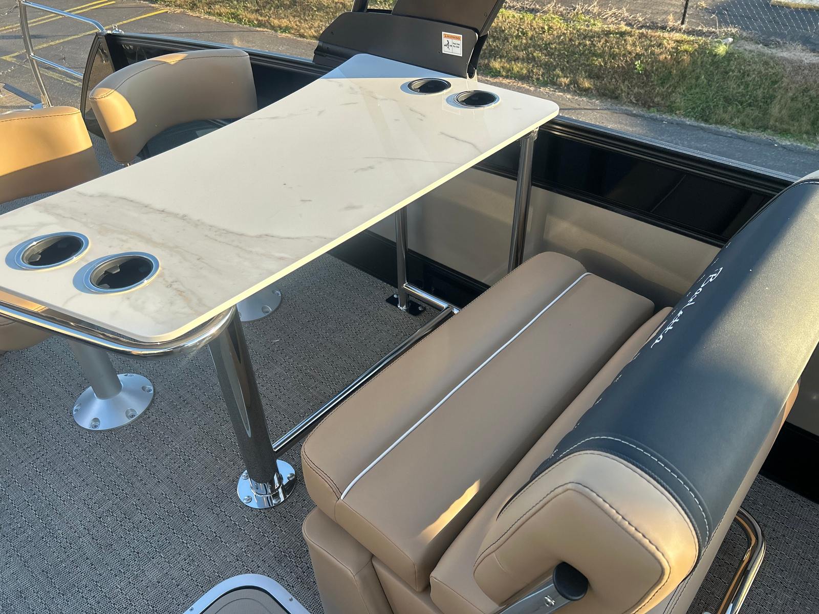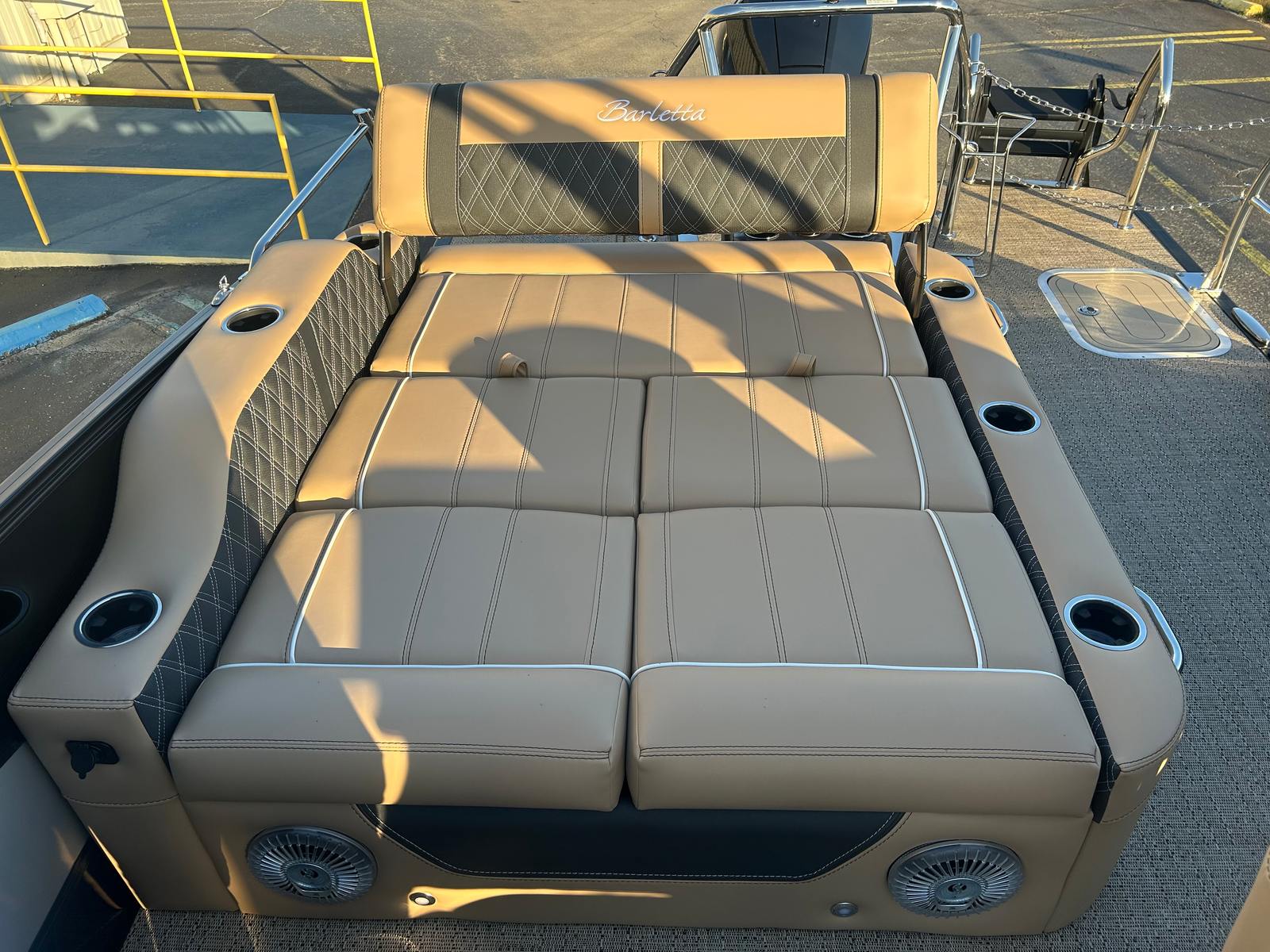 The 2026 Barletta Lusso L25UE is loaded with features that enhance both comfort and convenience. The Blackout Package Lusso railskin adds a bold, modern touch to the exterior, while the Carmella Tan with Onyx furniture offers plush seating for all your guests. The Amore Tan flooring is not only stylish but also easy to maintain, making it ideal for active days on the water. The Sport Bimini, installed in place of the standard bimini, provides ample shade and protection from the sun, ensuring comfort during long afternoons afloat. An onboard battery charger with two batteries ensures you have reliable power for all your electronic needs, keeping your adventures uninterrupted.