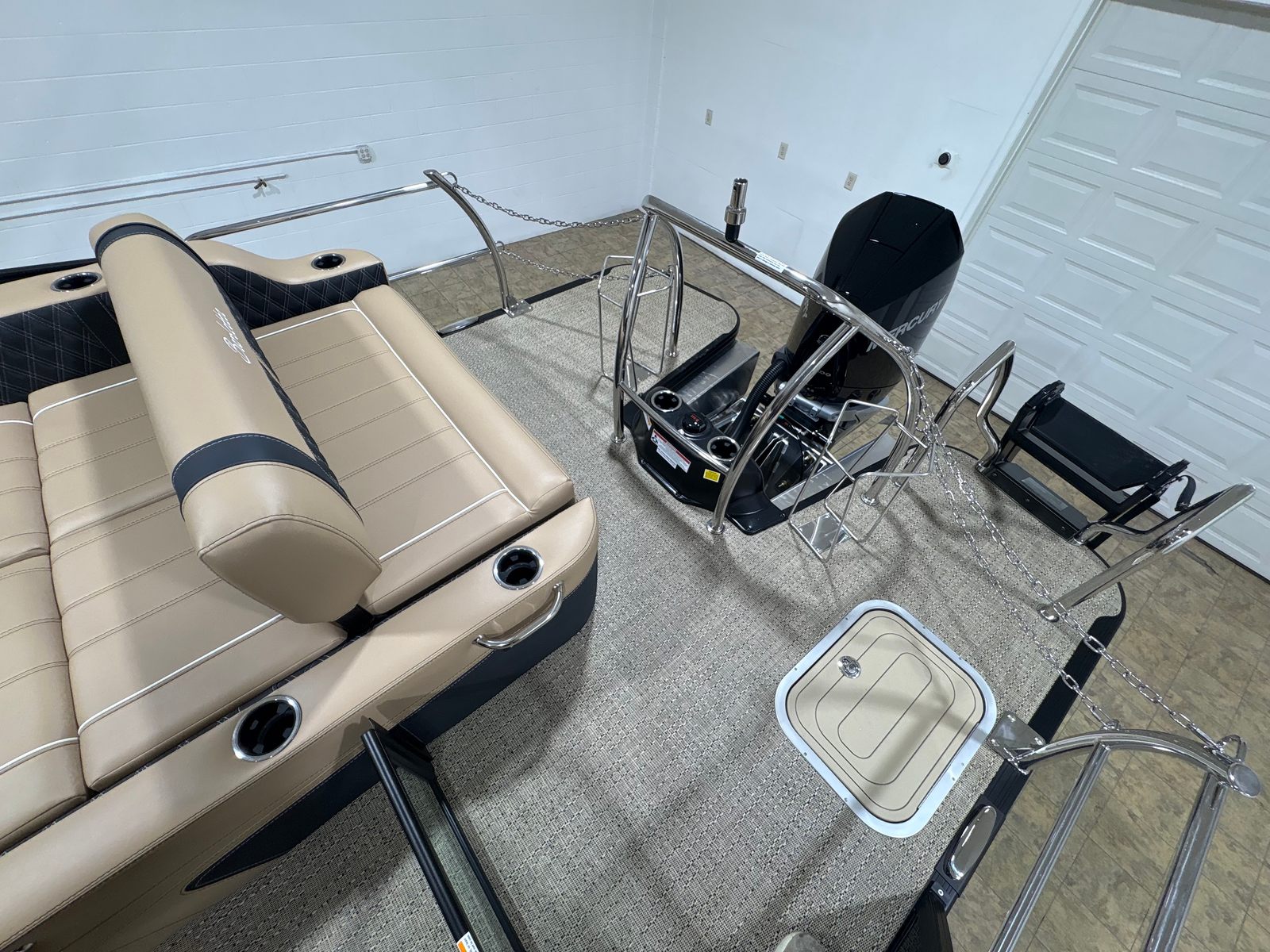 The 2026 Barletta Lusso L25UE is loaded with premium features designed to enhance your time on the water. The Blackout Package Lusso railskin adds a bold, modern touch to the exterior, while the Metal Jacket Protectant ensures long-lasting durability and protection against the elements. The Carmella Tan with Onyx furniture offers plush, ergonomic seating for you and your guests, and the Amore Tan flooring provides a comfortable, slip-resistant surface underfoot.For added convenience and safety, the Lusso L25UE is equipped with Mercury Digital DTS Pre-Rig for VERADO engines with Vessel Link, allowing for advanced digital controls and monitoring. The hydraulic and power assist steering system makes docking and navigating tight spaces a breeze, and the digital gauges keep you informed of all critical engine data at a glance. The rigged engine with a stainless steel prop ensures optimal performance and longevity, while the exterior lighting package—including white underdeck and underwater lights—creates a captivating ambiance for evening cruises and nighttime gatherings.