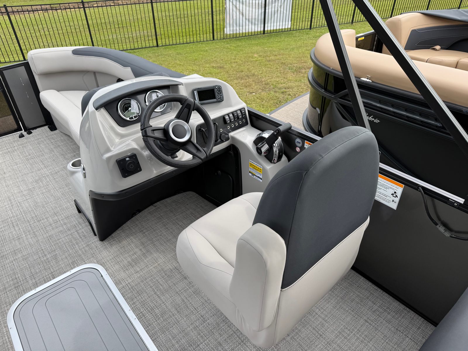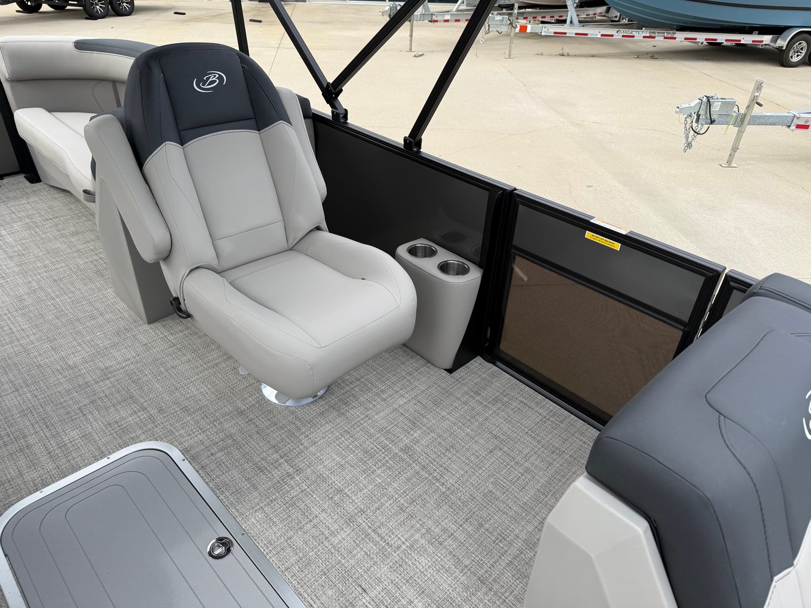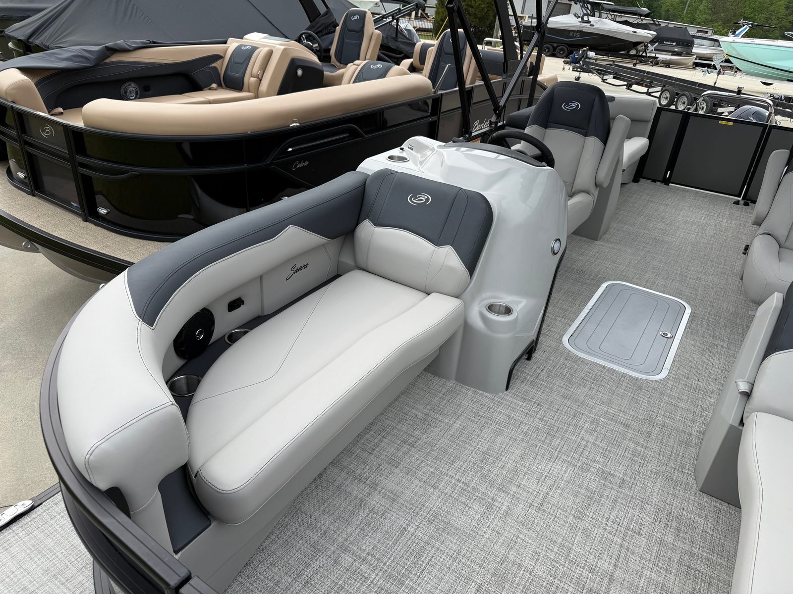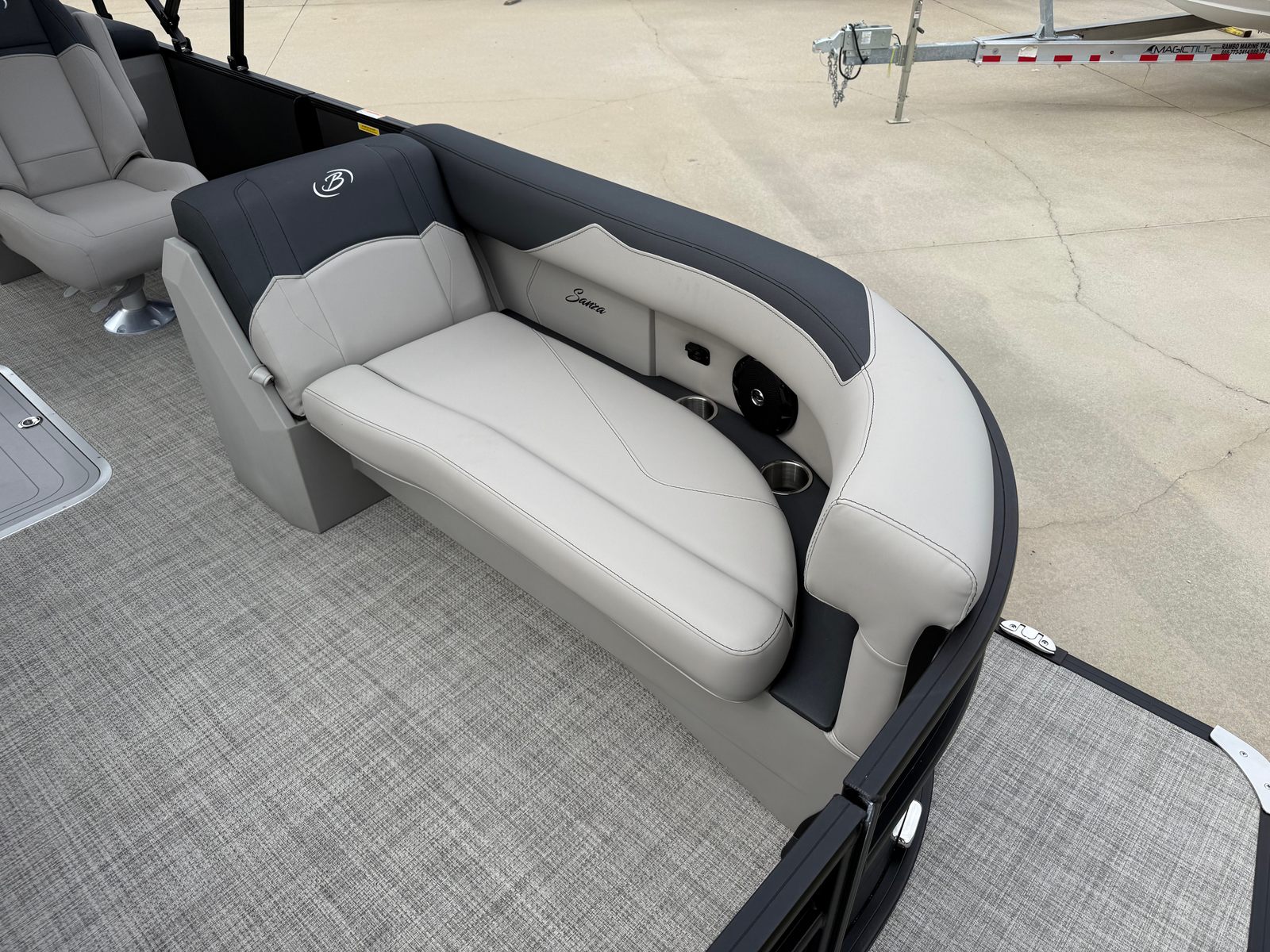 The 2026 Barletta Sanza S22QC is loaded with special features that elevate your boating experience. The Railskin Color in Gray Moonstone gives this pontoon a modern, elegant look, while the Sanza Blackout Package adds a touch of bold sophistication. The Marquesan Gray with Onyx furniture provides a plush, inviting atmosphere, perfectly complemented by the Alpine Gray flooring that is both stylish and easy to maintain. The Sanza Triple Toon Package enhances stability and ride quality, making every journey smooth and enjoyable. For added convenience, the in-floor midship storage offers ample space to stow your gear, keeping the deck clutter-free and organized.