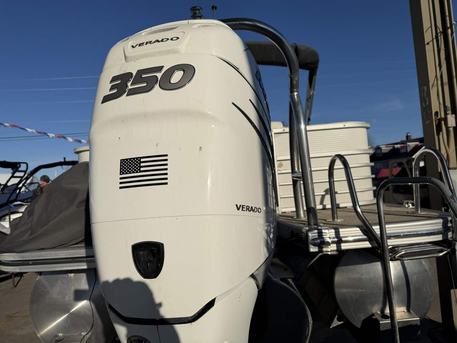 Under the deck, the Bennington 23 Rcwl is powered by a robust single engine delivering an impressive 350 horsepower. This powerful setup ensures smooth acceleration, responsive handling, and the ability to cruise effortlessly across lakes, rivers, or coastal waters. Whether you are towing water toys, heading to your favorite fishing spot, or simply enjoying a leisurely cruise, the performance of this pontoon boat is sure to impress. The 350 horsepower engine provides the perfect balance of speed and efficiency, making every outing both thrilling and economical.