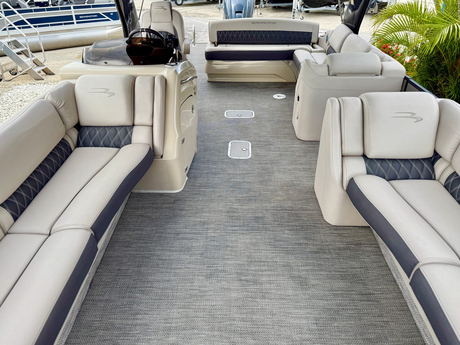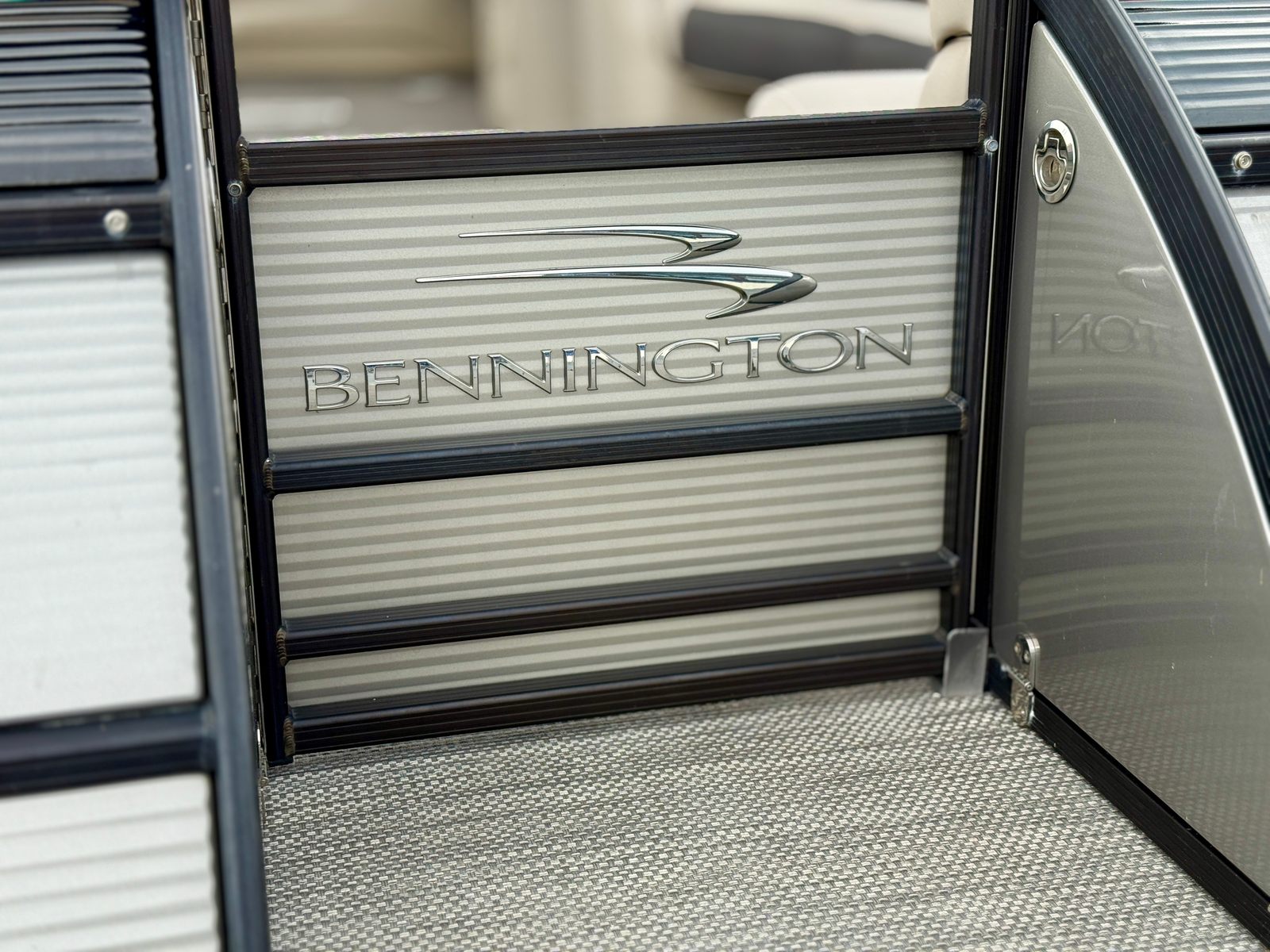 The Bennington 28 QSRFBX1 3T is thoughtfully designed to enhance your boating experience with a range of features and specifications that cater to both comfort and convenience. The spacious deck layout provides plenty of room for seating, entertaining, and relaxing, while the high-quality construction ensures durability and longevity. The pontoon’s generous length of over 28 feet allows for a versatile arrangement of seating and amenities, making it ideal for hosting gatherings or enjoying quiet moments on the water.With its modern styling and attention to detail, this Bennington pontoon boat offers a premium boating experience. The ergonomic helm station provides easy access to controls and instrumentation, allowing the captain to navigate with confidence and ease. The plush seating and ample storage options ensure that everyone on board can relax in comfort, while keeping personal items and gear organized and out of the way.