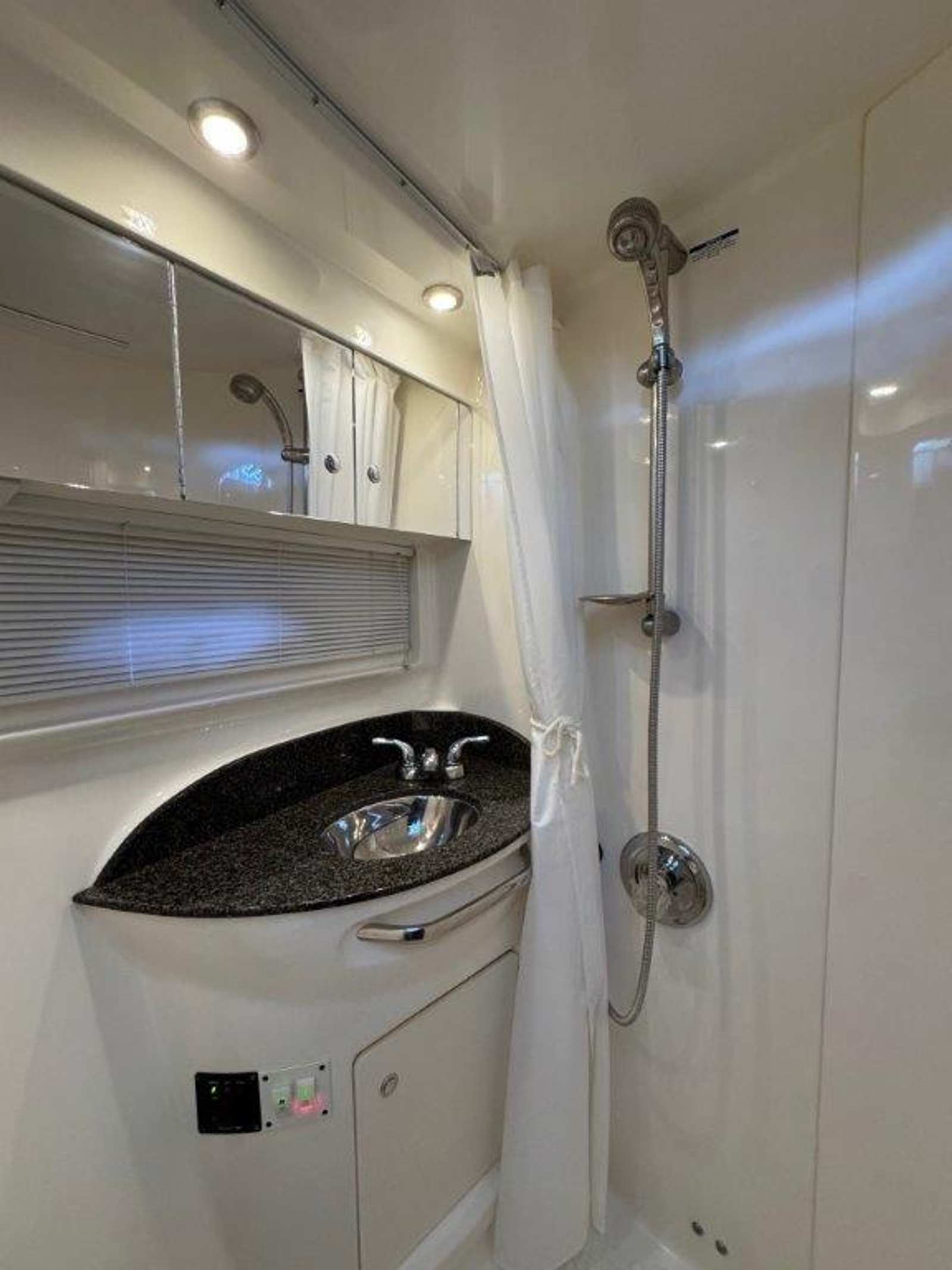 The 350 Signature is designed for entertaining and cruising, offering a spacious cockpit with abundant seating and a thoughtful layout for both day trips and extended stays. Upholstery is in excellent condition, and the full enclosure provides all-weather comfort. The hardtop offers shade while the walk-through windshield allows easy access to the bow and Princess Pad.