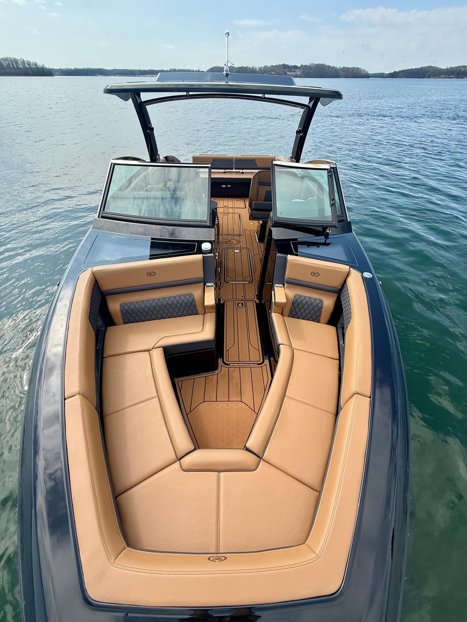 The Cobalt R33 Surf is packed with premium features that elevate your boating experience. The arch with hard top provides both style and functionality, offering shade and protection from the elements while maintaining an open and airy feel. The electric awning in sleek black extends effortlessly, creating a comfortable space for relaxation or entertaining guests. The aft walk-thru gate and boarding door make it easy to access the water or dock, enhancing safety and convenience for everyone on board.Inside, the cockpit showcases a luxurious interior finished in Caramel, Carbon, and Ebony, creating a sophisticated and inviting atmosphere. The Cobalt letters with flag emblem in black satin add a touch of elegance and brand distinction. For those cooler days on the water, the cockpit heater ensures that everyone stays warm and comfortable, extending your boating season well into the cooler months.Additional features such as the battery maintainer/charger (110V) keep your boat ready for action, while the board rack covers and PTM provide practical solutions for storing and protecting your gear. Every detail of the R33 Surf is designed with the owner’s comfort and convenience in mind.