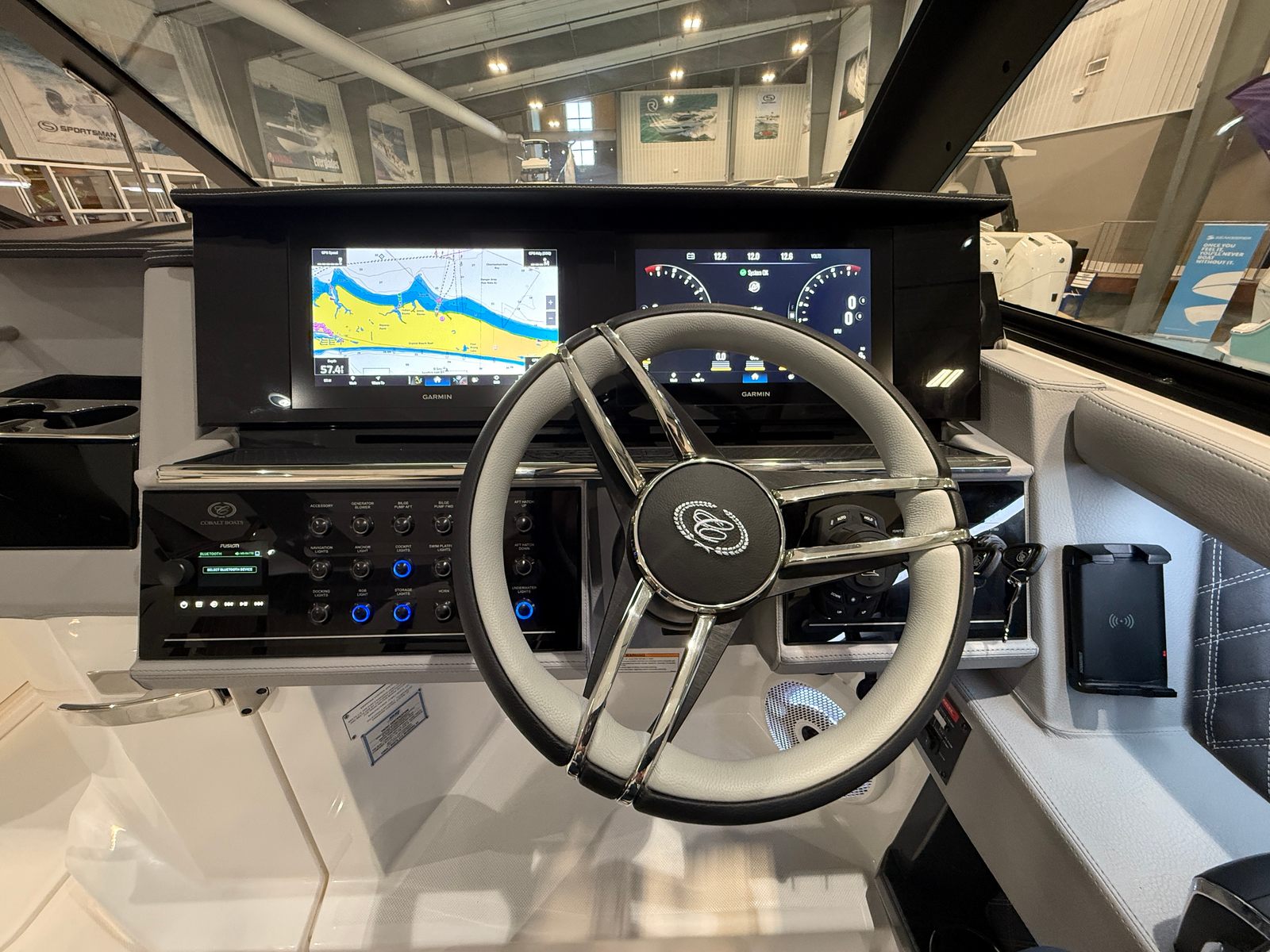 This Cobalt R35 OB is loaded with special features designed to enhance your boating experience. The Coastal Edition package adds an extra layer of durability and style, perfect for those who love exploring saltwater environments. Distinctive Cobalt letters in stainless steel, accompanied by a chrome, lighted flag, add a touch of elegance and visibility, ensuring your boat stands out day or night.Step aboard and discover the electric adjustable seat, which allows you to find your ideal position for comfort and control. The Flint Grey cabin interior exudes modern sophistication, creating a welcoming retreat below deck. The Shorepower Kit (110V) comes standard, including a battery charger to keep your systems powered and ready for extended outings.The swim platform extension in Frost Grey provides additional space for sunbathing, swimming, or launching water toys, making it a favorite spot for guests. The interior features a stylish Summit and Frost color palette, while the hull side is finished in classic white with a Frost Grey accent stripe, giving the R35 OB a timeless yet contemporary look.