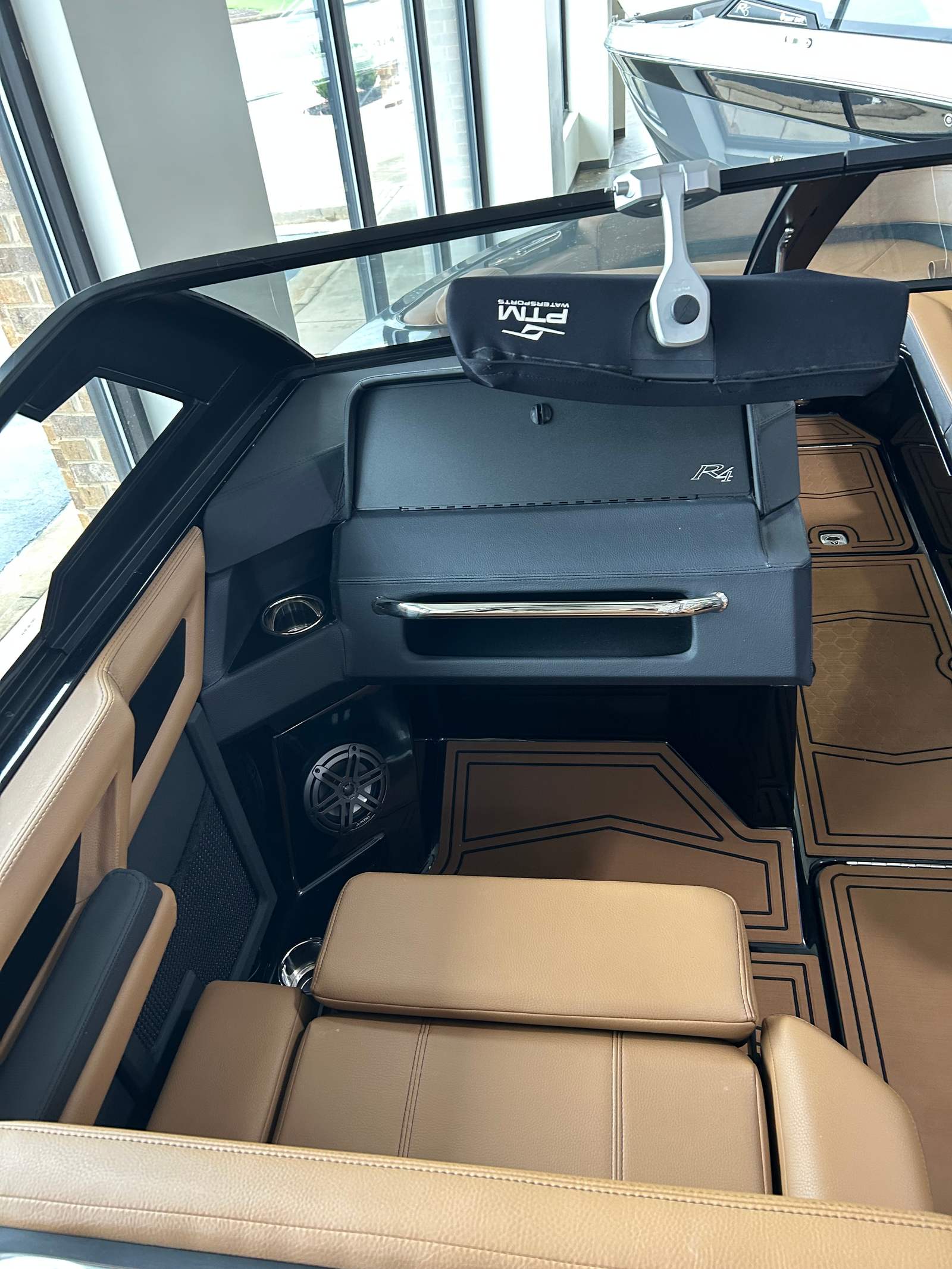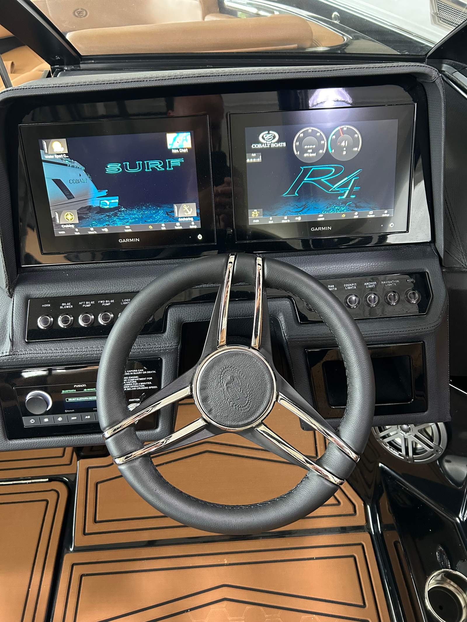 The 2025 Cobalt R4 Surf is packed with special features that elevate both comfort and style. The Sof-Trac Mat at the helm footrest in Caramel/Ebony provides a plush, non-slip surface for added safety and luxury. The Standard Surf Logo proudly displays the boat’s sporty pedigree, while the Accent Stripe in Rich Ebony adds a touch of sophistication to the exterior. LED interior accent lighting with R/G/B options creates a customizable ambiance for evening cruises or lively gatherings.A mooring cover with E2 folding arch ensures your investment is protected when not in use, while the black rubrail and Cobalt letters in black satin contribute to the boat’s modern, upscale appearance. The Sof-Trac Mat at the gunwale step in Caramel/Ebony enhances boarding comfort and safety. The PTM rearview mirror with a custom cover offers improved visibility for watersports and docking, rounding out a suite of features designed for convenience and enjoyment.