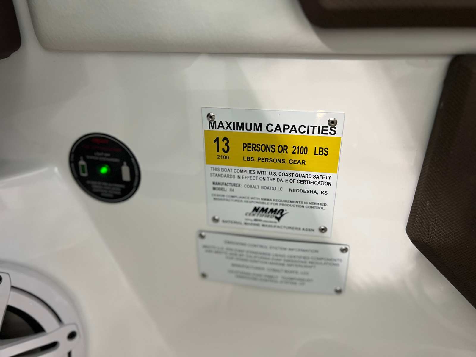 The Cobalt R4 Bowrider is packed with premium features designed to enhance your time on the water. The aft-facing rumble seat offers a unique vantage point for relaxing or socializing, while the arch, E2, white folding with bimini provides shade and protection from the sun, ensuring comfort during long days afloat. The captain’s navy accents add a touch of elegance to the helm, complementing the boat’s overall aesthetic.For added convenience, the battery maintainer/charger keeps your electrical systems in top condition, so you’re always ready to hit the water. Stainless steel docking lights illuminate your path during evening excursions, while fender clips with line make docking and undocking a breeze. The flagpole with flag adds a patriotic flair, and the floor covering in seagrass, raw umber, offers both durability and style underfoot.The glass cockpit is equipped with dual Garmin 8610 displays, providing state-of-the-art navigation and system monitoring. This advanced technology ensures you have all the information you need at your fingertips, making every journey safer and more enjoyable.