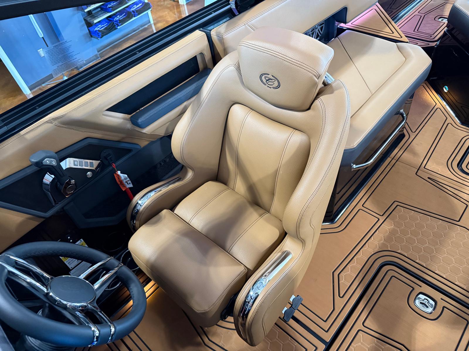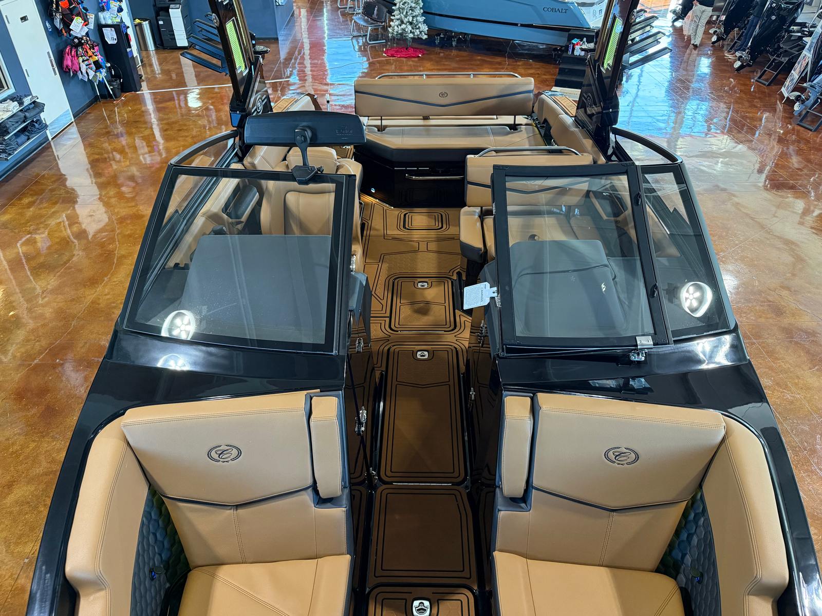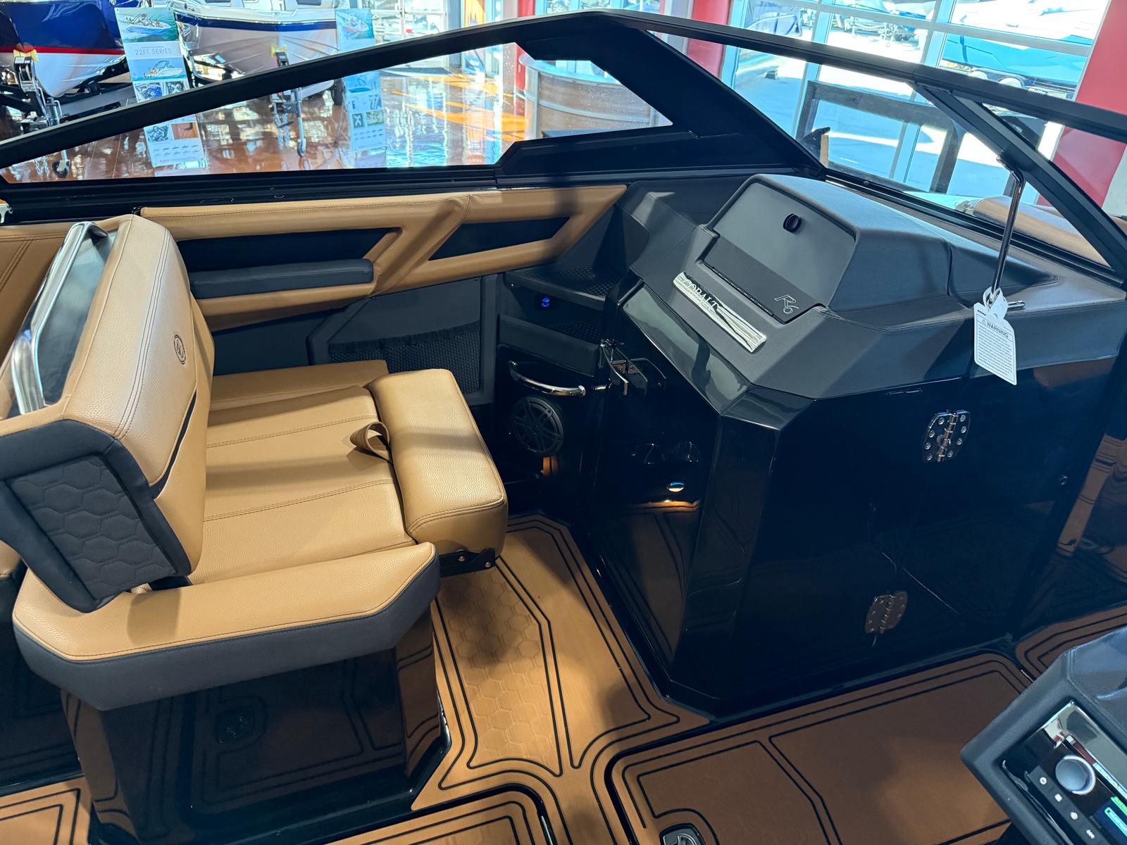 The Cobalt R6 Surf is loaded with premium features that elevate your boating experience to new heights. The dual Garmin 8610 glass cockpit provides intuitive navigation and control, giving you confidence and peace of mind as you explore new destinations. The electric arch in Prisma Black, paired with a stylish Ebony Bimini, offers both shade and a modern aesthetic, while the stainless steel docking lights ensure safe and easy maneuvering during low-light conditions. The boat’s hull bottom and full colored deck, both finished in Rich Ebony, create a bold and cohesive look that is sure to impress.Inside, the R6 Surf boasts a luxurious interior with Caramel, Carbon, and Ebony tones, complemented by Cobalt letters in Black Satin for a refined touch. The battery maintainer/charger keeps your systems powered and ready for action, while the included flagpole with flag adds a classic nautical flair. Every detail is thoughtfully designed to enhance comfort, convenience, and style, making the R6 Surf a standout among bowrider boats for sale.