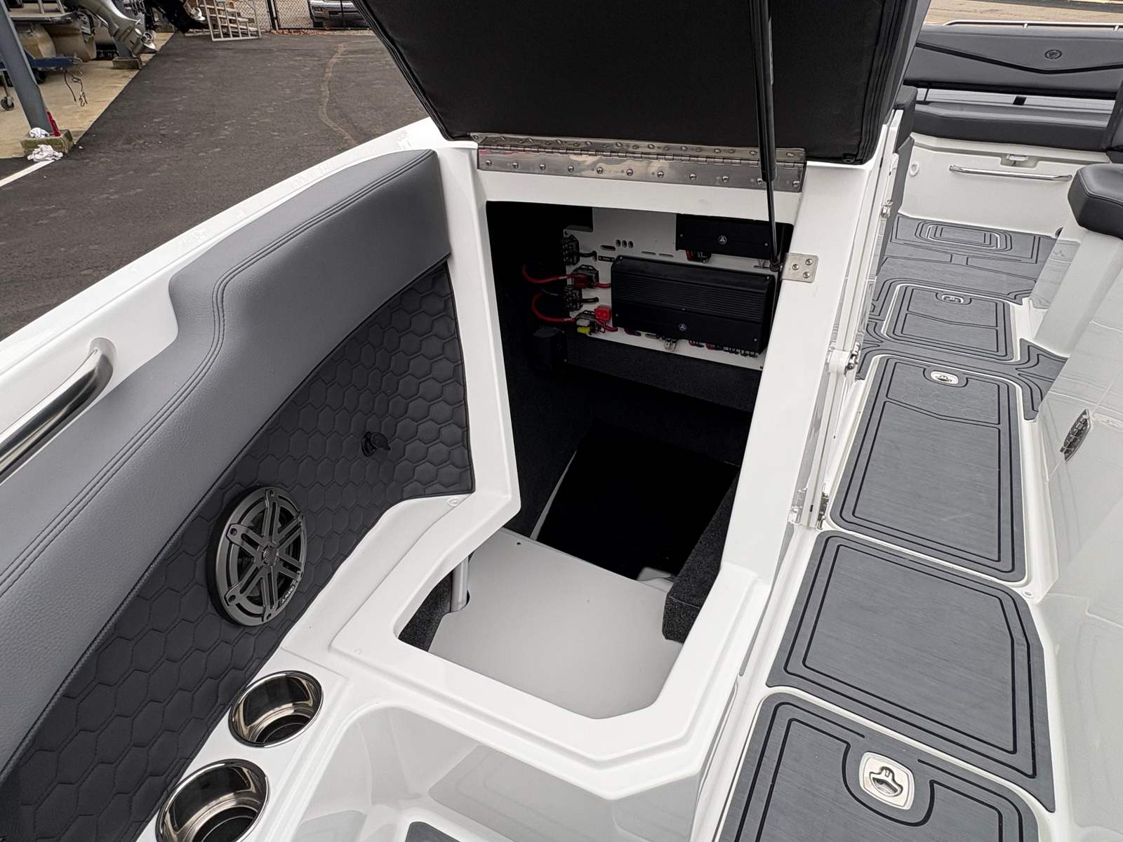 Practicality meets luxury in the Cobalt R6 Surf. The stainless steel docking lights and fender clips with line make docking and mooring straightforward, reducing stress and allowing you to focus on enjoying your time on the water. The folding electric arch simplifies storage and transport, making it easy to fit the boat into various slips or garages.The swim platform extension adds valuable space for water activities, while the ergonomic helm footrest ensures the captain’s comfort during long cruises. The rearview mirror with custom cover enhances safety during watersports, giving you clear visibility of everyone behind the boat. These thoughtful touches make the R6 Surf a pleasure to own and operate, whether you’re a seasoned boater or new to the lifestyle.
