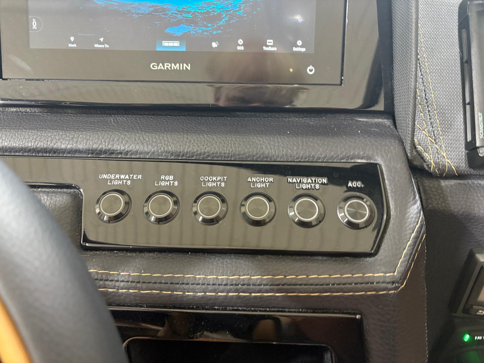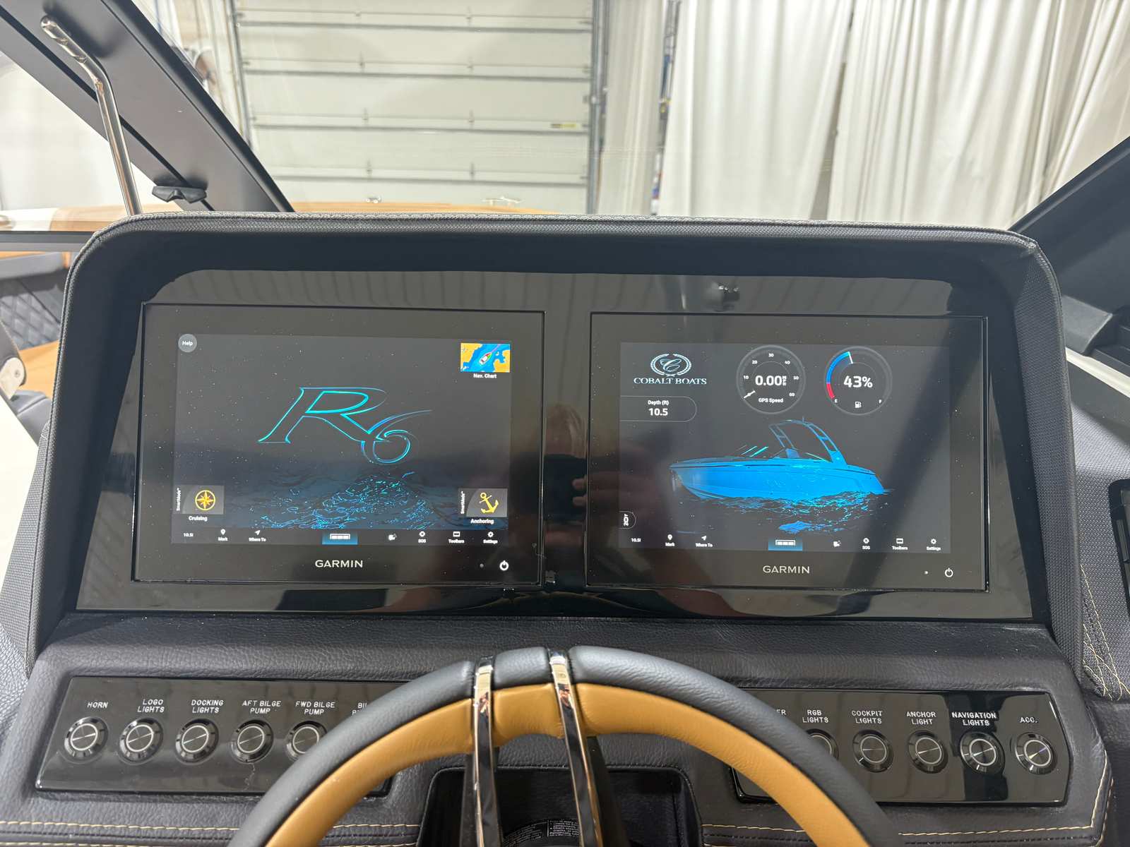 The Cobalt R6 is loaded with premium features that enhance both comfort and functionality. The Arch - E2 in White with a Gray Bimini provides stylish shade and protection from the sun, allowing you to enjoy long days on the water in comfort. The interior is finished in a luxurious Caramel and Carbon color scheme, complemented by a Leather Steering Wheel Upgrade in Caramel and Black for a refined touch at the helm. Stainless Steel Docking Lights not only add to the boat’s striking appearance but also improve visibility and safety during evening outings.For navigation and control, the Glass Cockpit features dual Garmin 8610 displays, offering state-of-the-art technology for chart plotting, system monitoring, and more. The Battery Maintainer/Charger ensures your boat is always ready to go, keeping your electrical systems in peak condition. Every detail, from the hull design to the upgraded steering wheel, reflects Cobalt’s commitment to quality and innovation.