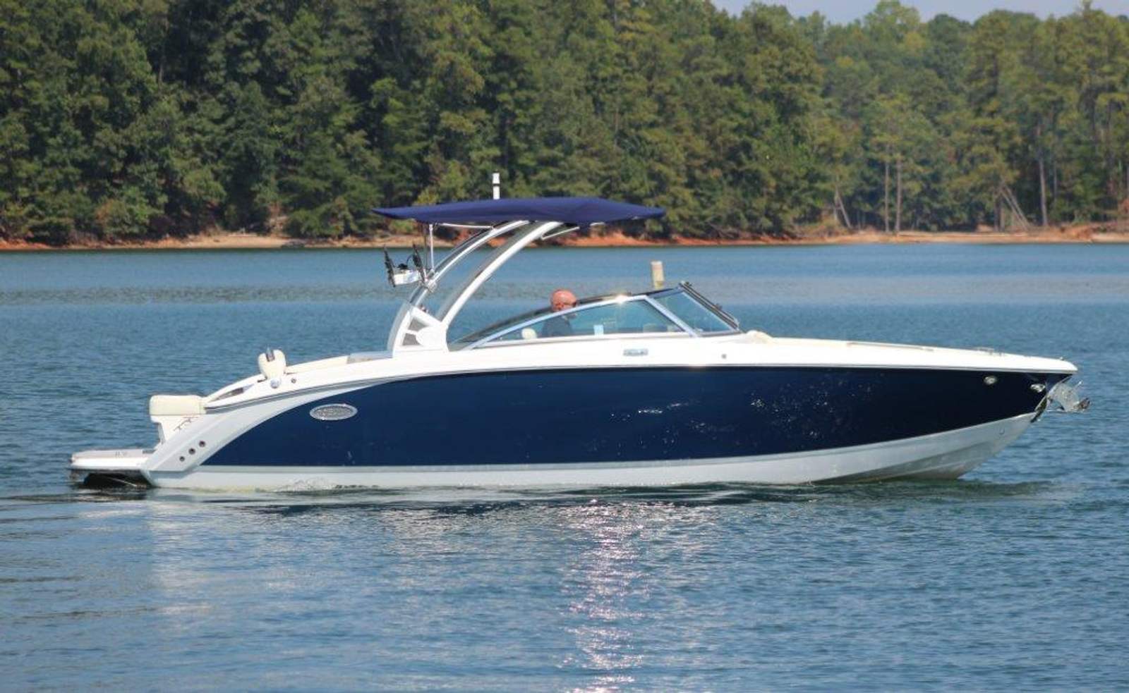 This stunning boat has a Navy hull side, Frost Grey bottom, and White boot stripe, complemented by a stylish Tahoe Grey interior with Navy piping for a sleek, refined look. A white forward-folding arch with a Navy bimini adds style and shade, while brushed aluminum wakeboard racks and tow balls on both port and starboard sides ensure you're ready for any watersports adventure.